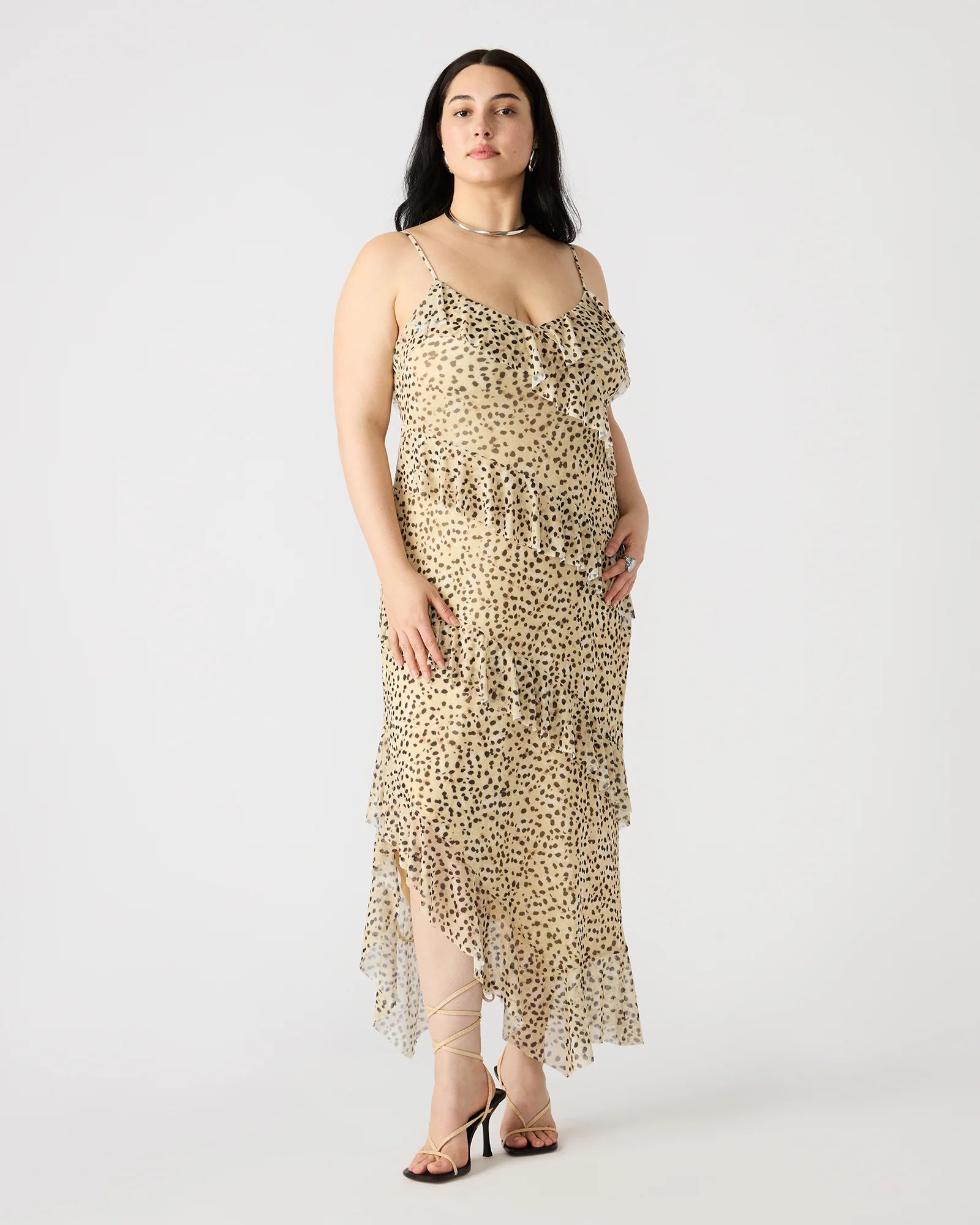 This AIDA provides a flowy ruffle design and v-neckline, perfect for a comfortable and stylish look. Its maxi length and sleeveless design offer versatility and breathability. Crafted from high-quality materials, this dress is a must-have for any fashion-forward individual looking for a statement piece in their wardrobe.