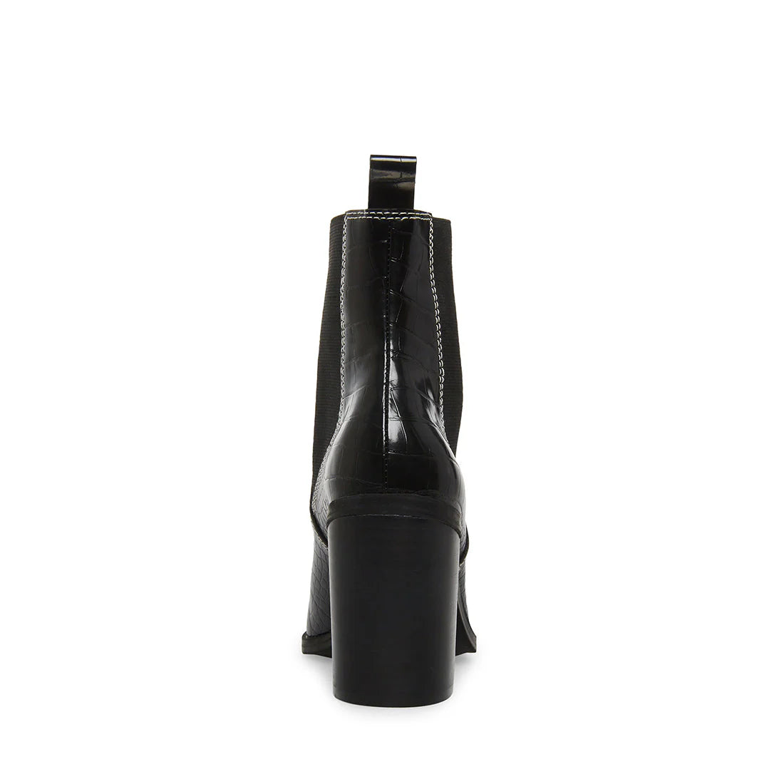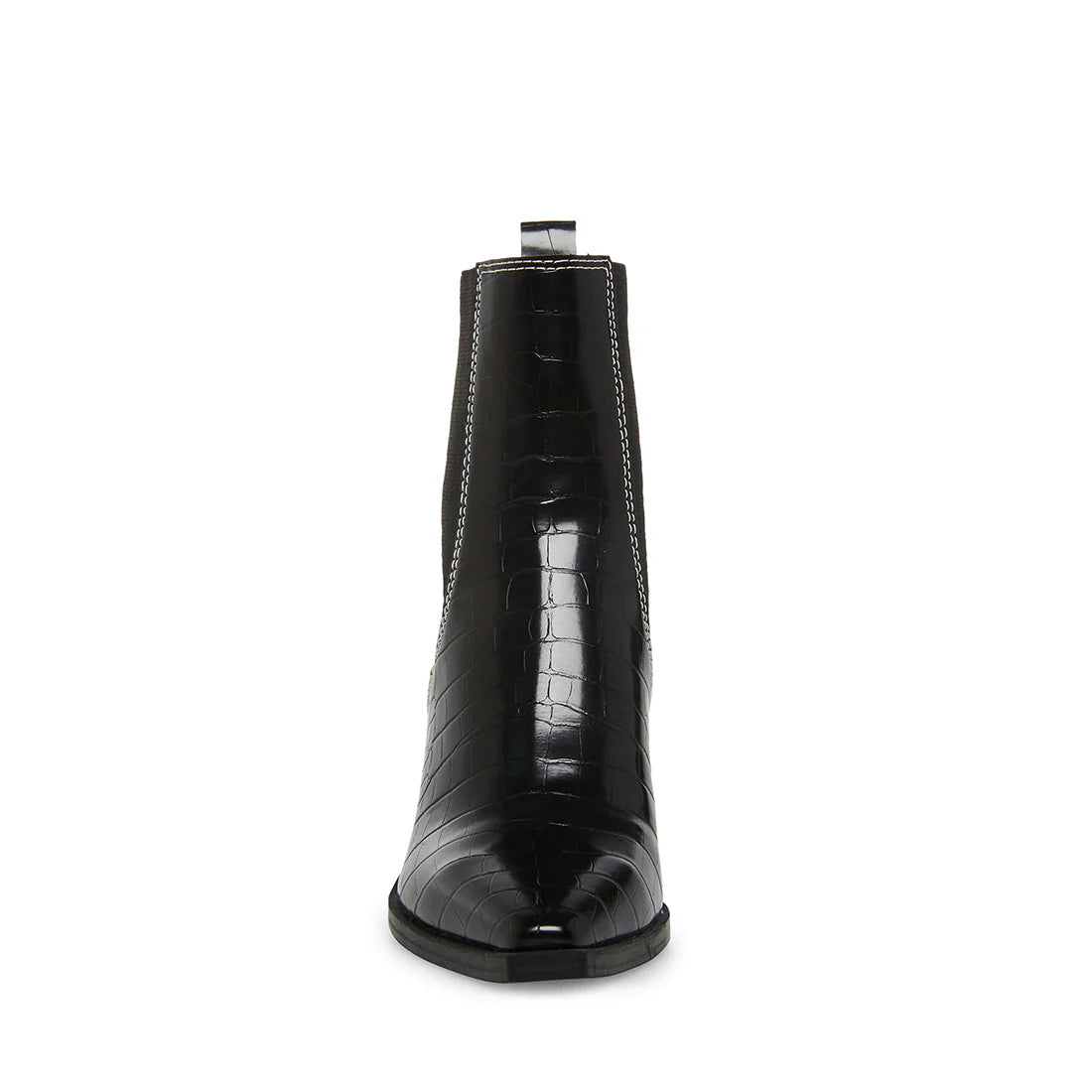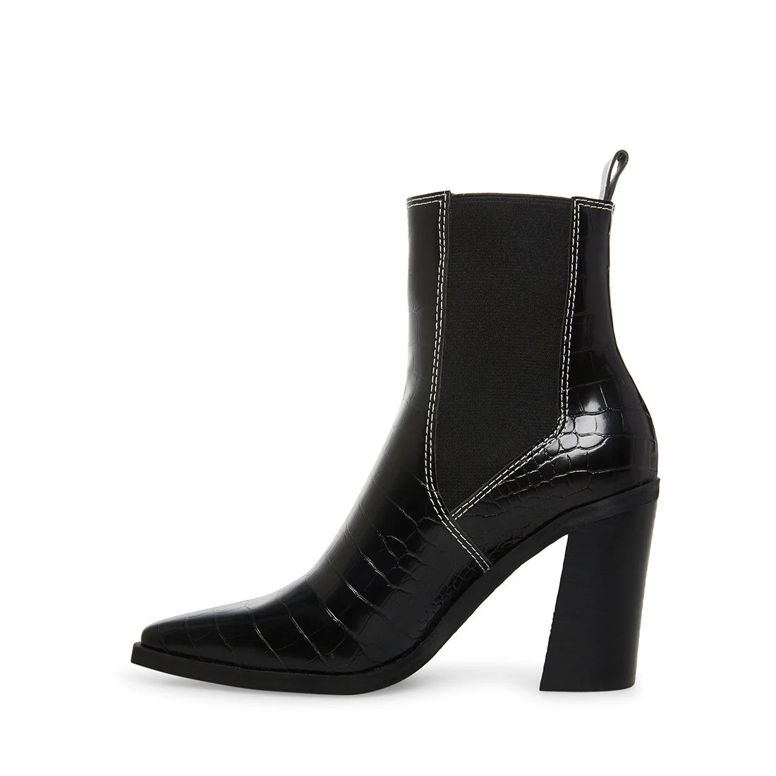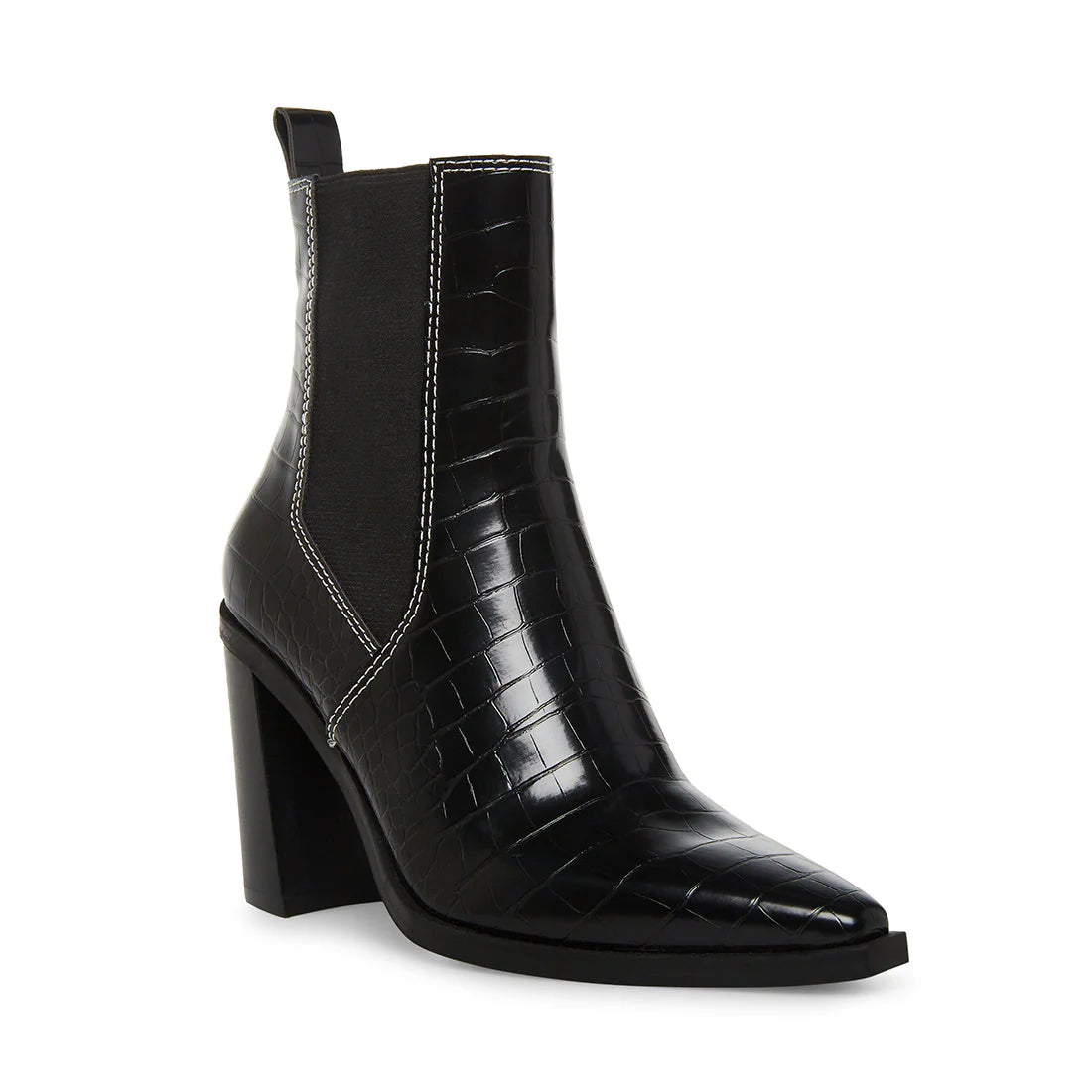 The AKORI point toe Chelsea are finished in faux reptile texture vegan leather with a block set on a slight angle.