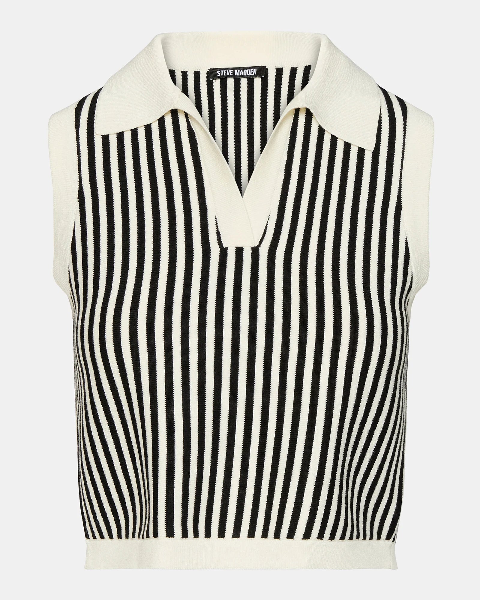 Upgrade your wardrobe with the AMERY SWEATER . This stylish sweater vest features a collared neckline and a trendy stripe pattern, perfect for adding a touch of sophistication to any outfit. Made with a comfortable knit material, stay cozy and fashionable all day long.