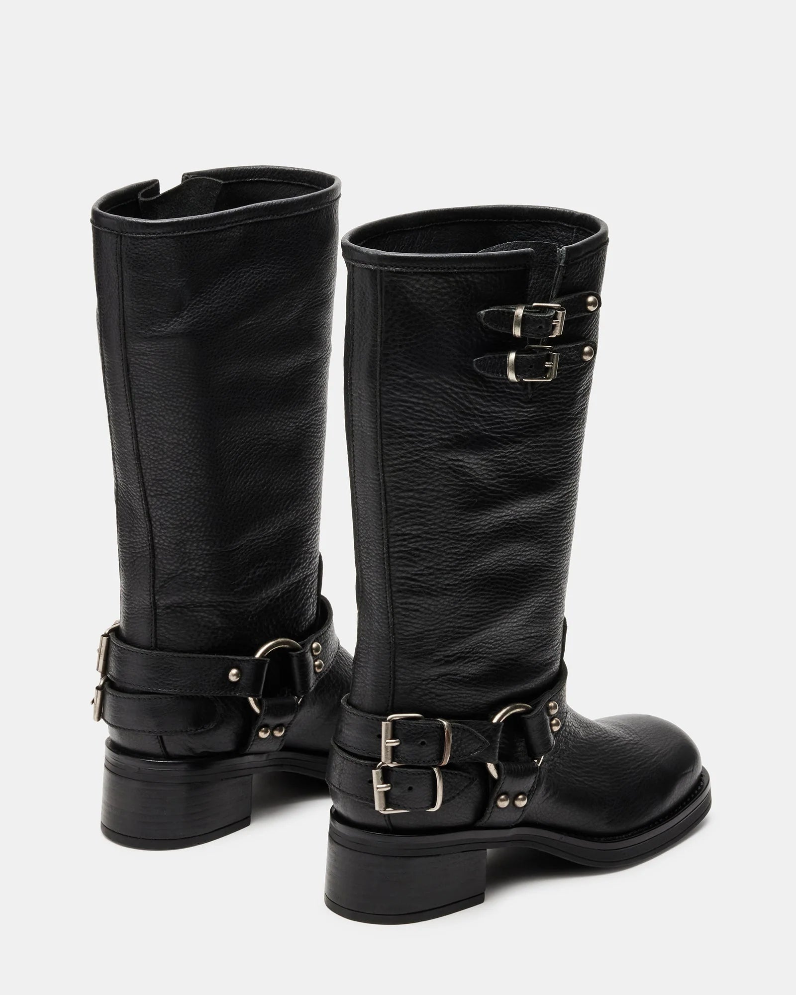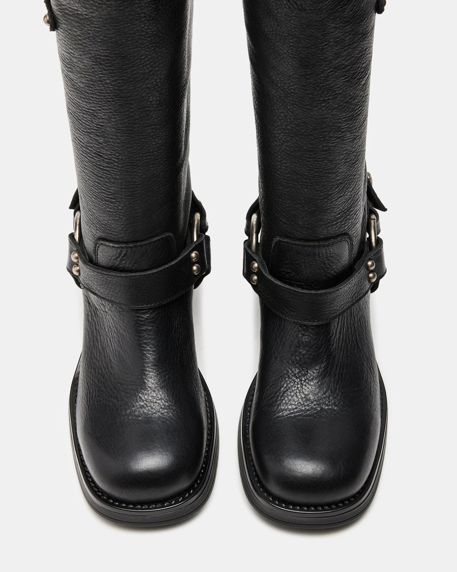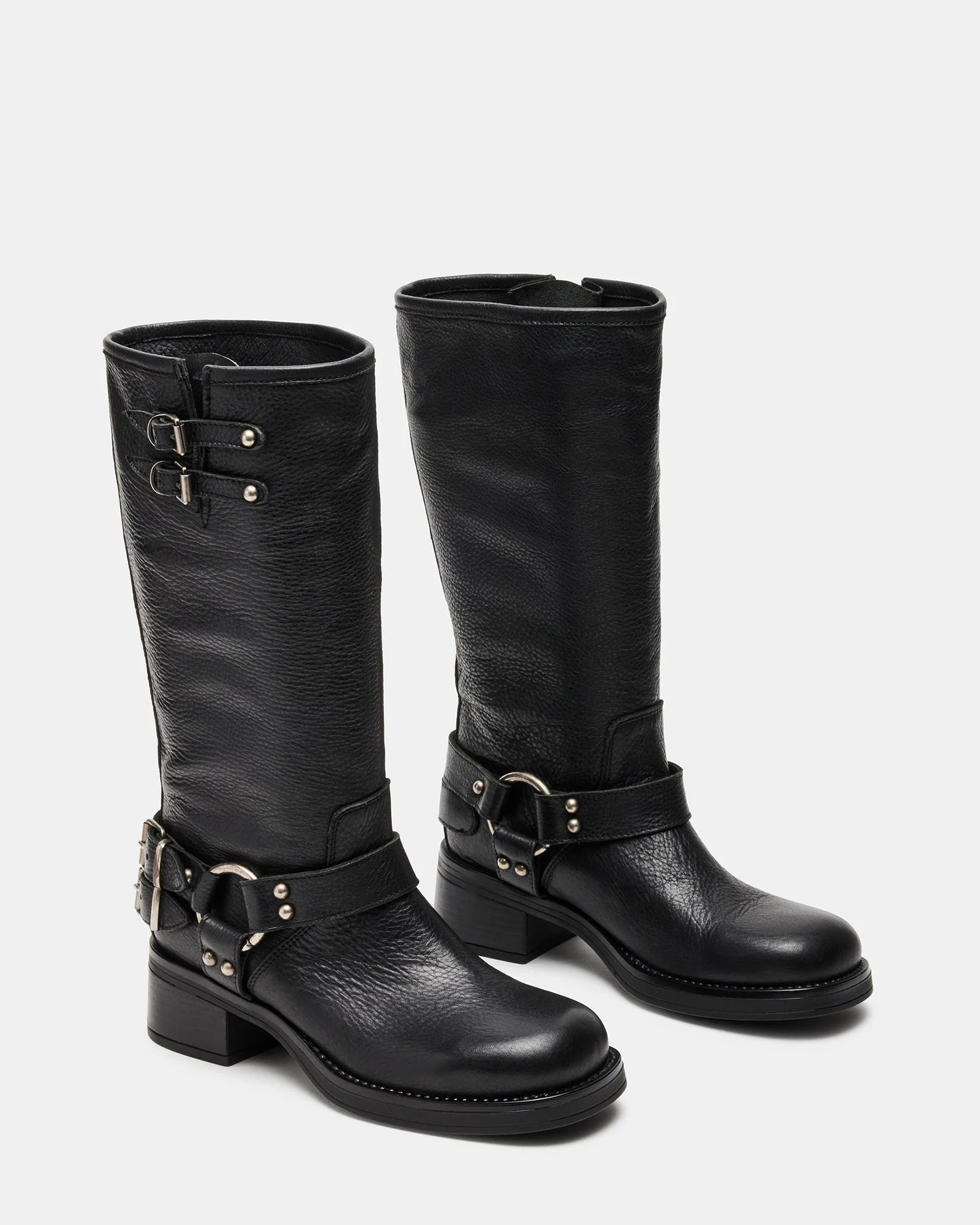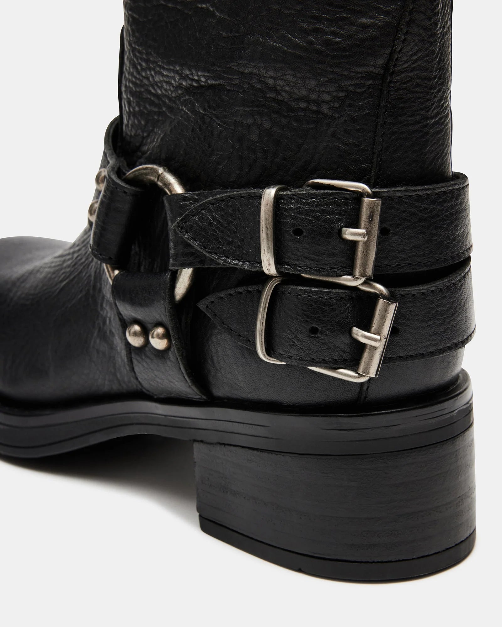 The ASTOR square toe features a slouchy mid-calf silhouette reinforced with strap accents and substantial buckle hardware. A wide sole with a block heel provides a solid foundation for this engineer-inspired design.