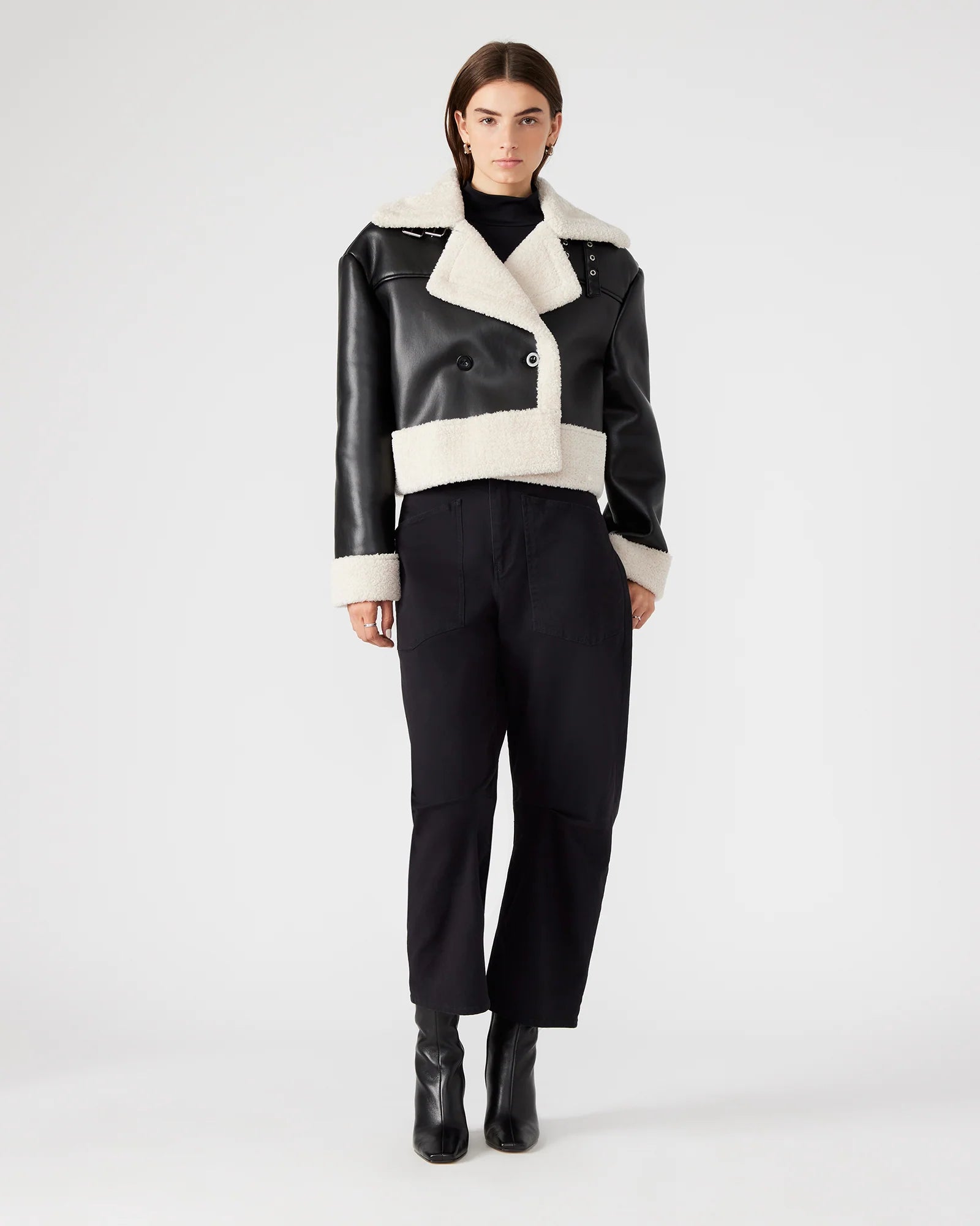 Expertly crafted, the ATHEN is a timeless piece that offers both style and functionality. Its double-breasted design adds an elegant touch, while the boxy oversized fit and cropped length provide a modern twist. The faux shearling trim not only adds texture but also provides warmth. The functional collar belt and stabilizing buttons make this jacket a practical choice for any occasion.