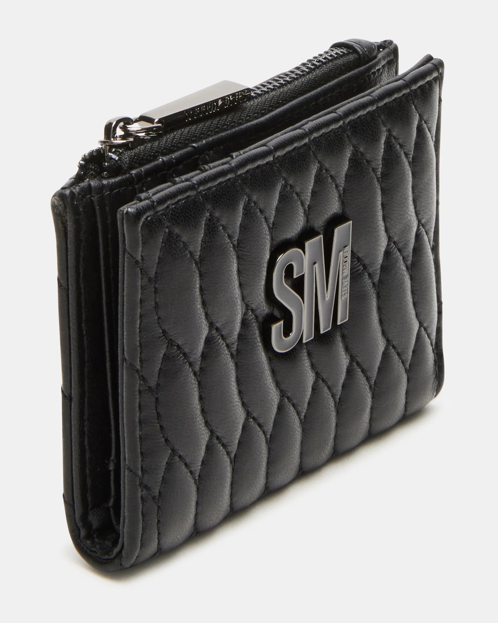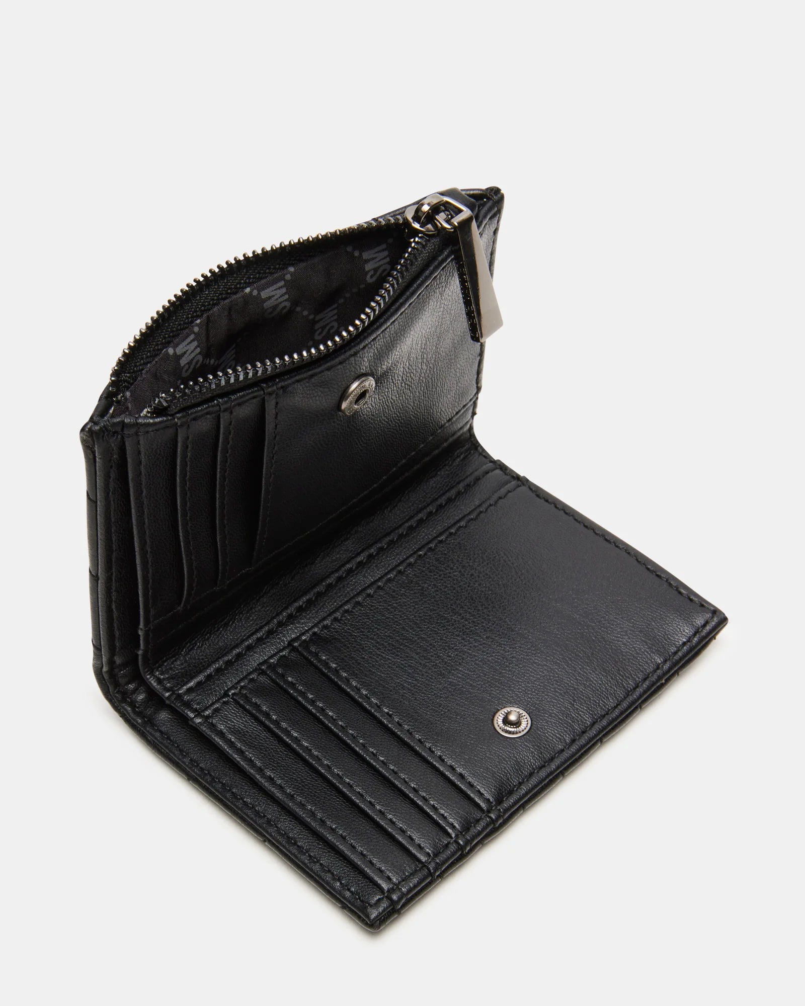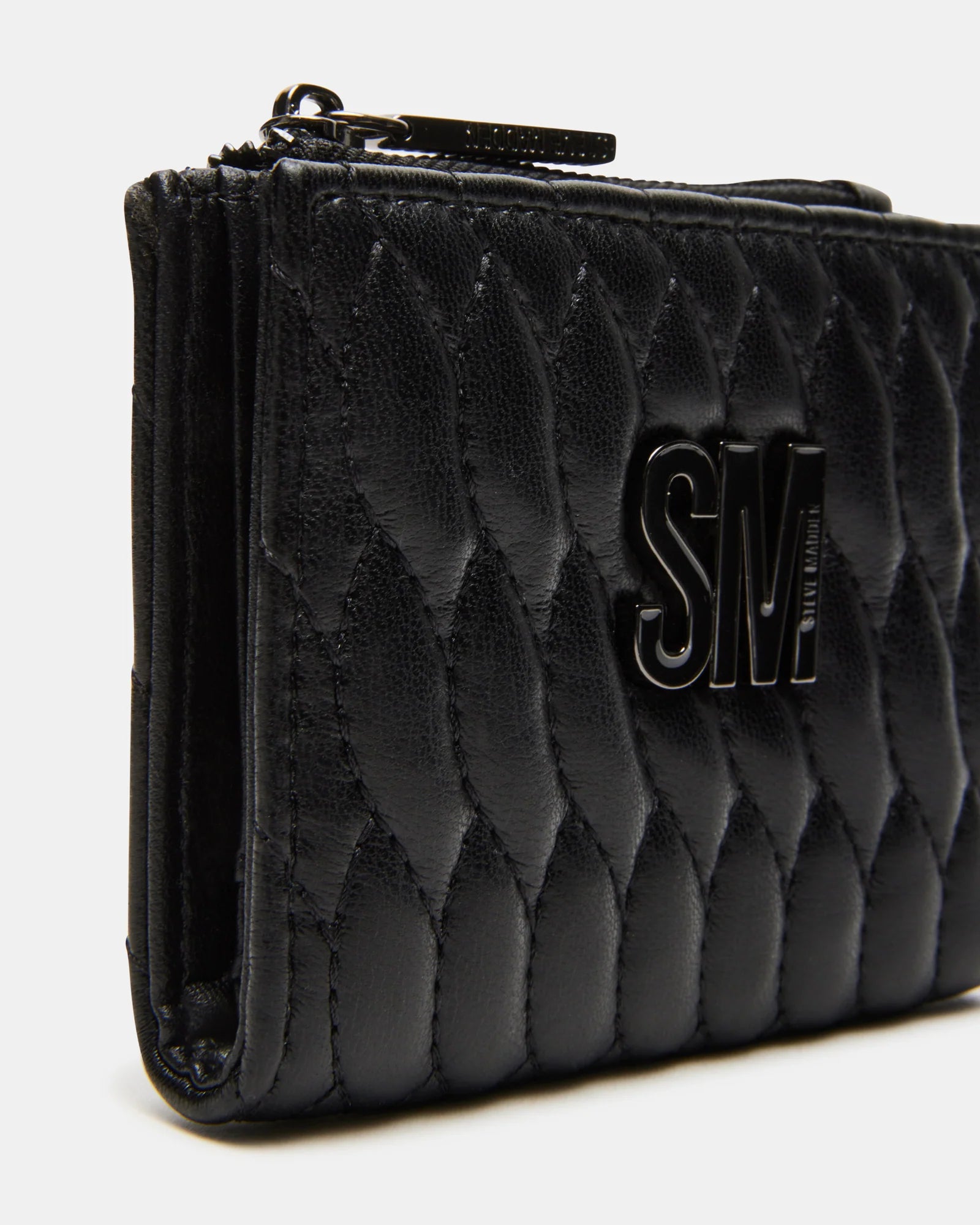 This BAZAR wallet features a mini logo quilted design, secure button-snap closure, and multiple card slots. Sleek and functional, it keeps your cards organized and easily accessible.