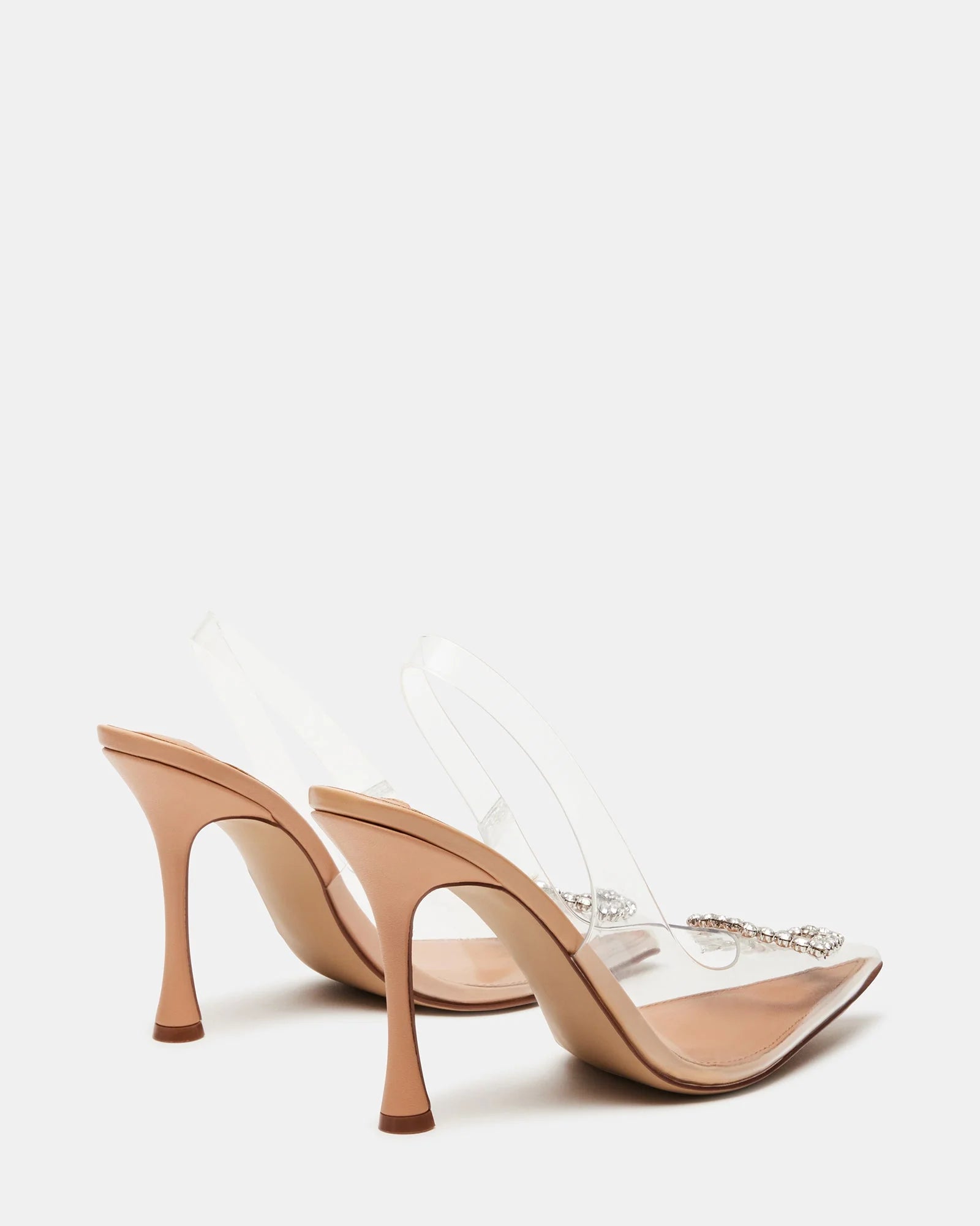 BEIGNET updates the classic point toe slingback pump with a sculptural and a hexagonal buckle ornament on the toe set with sparkling .