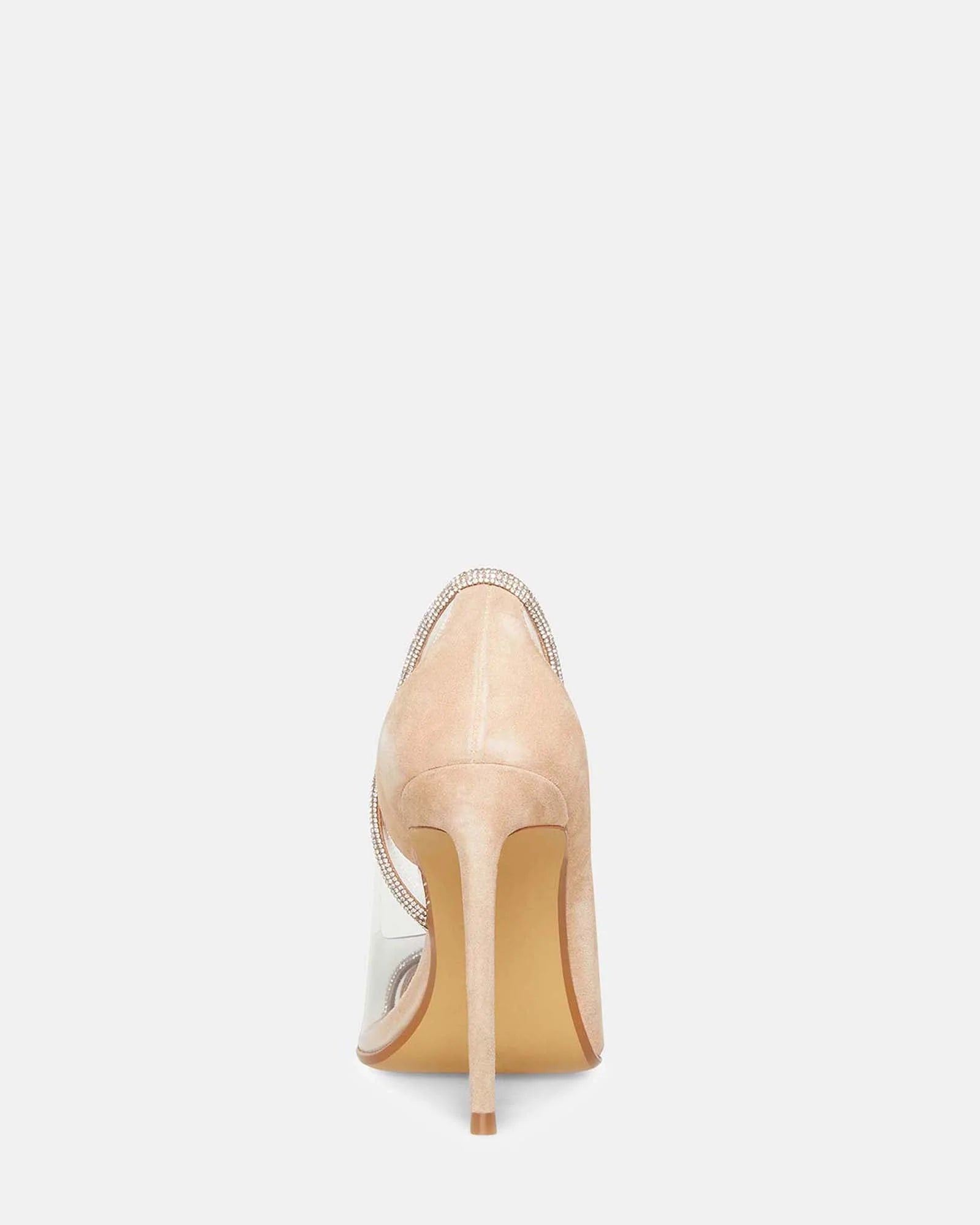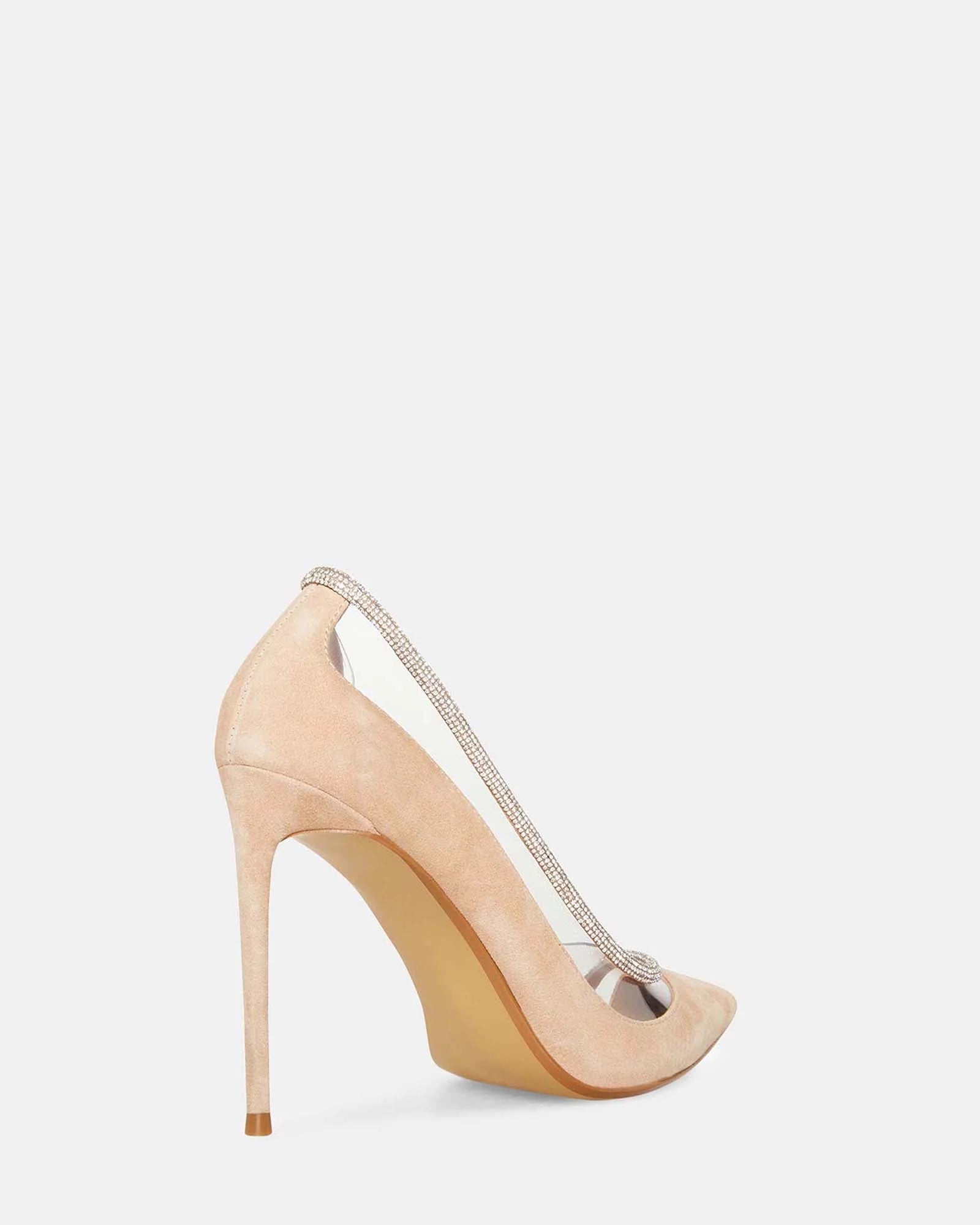 The BEVIN scarpin pump features a transparent trim that gives the style a faux-d'orsay look, highlighted by cord wrapped asymmetrically over the point toe and around ankle.