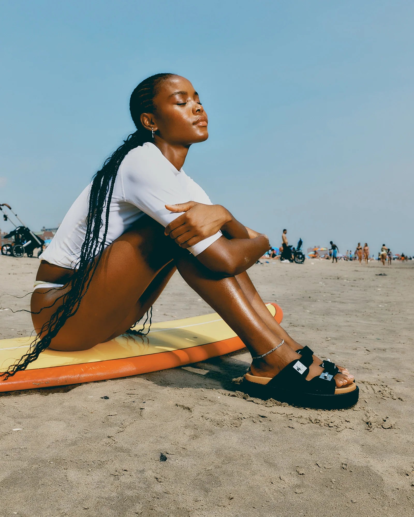 Elevate your style with the BIGSCHMONA slide . The flatform design provides a modern twist while the turn-lock hardware accent adds a touch of sophistication. Step up your fashion game while enjoying the comfort and stability of this versatile shoe.