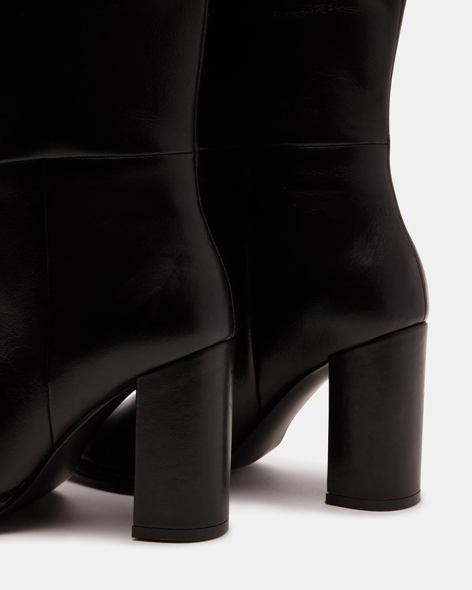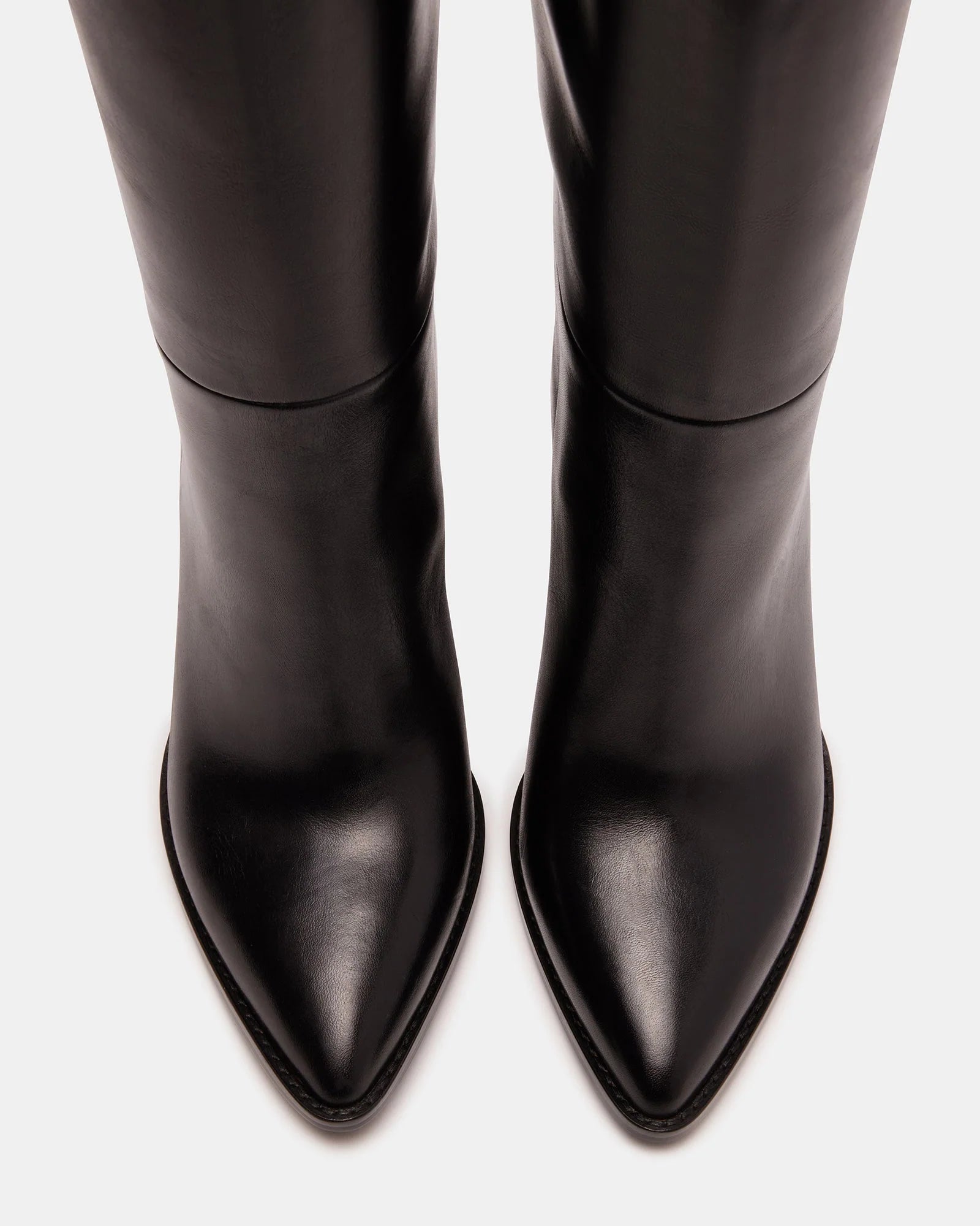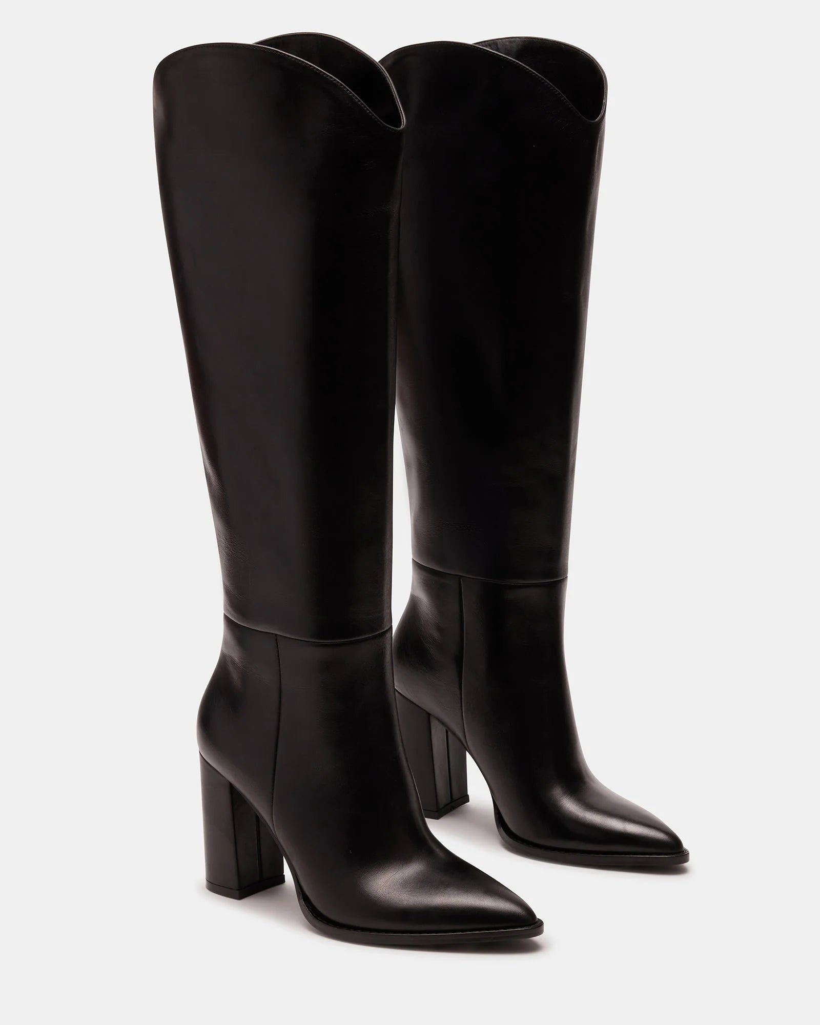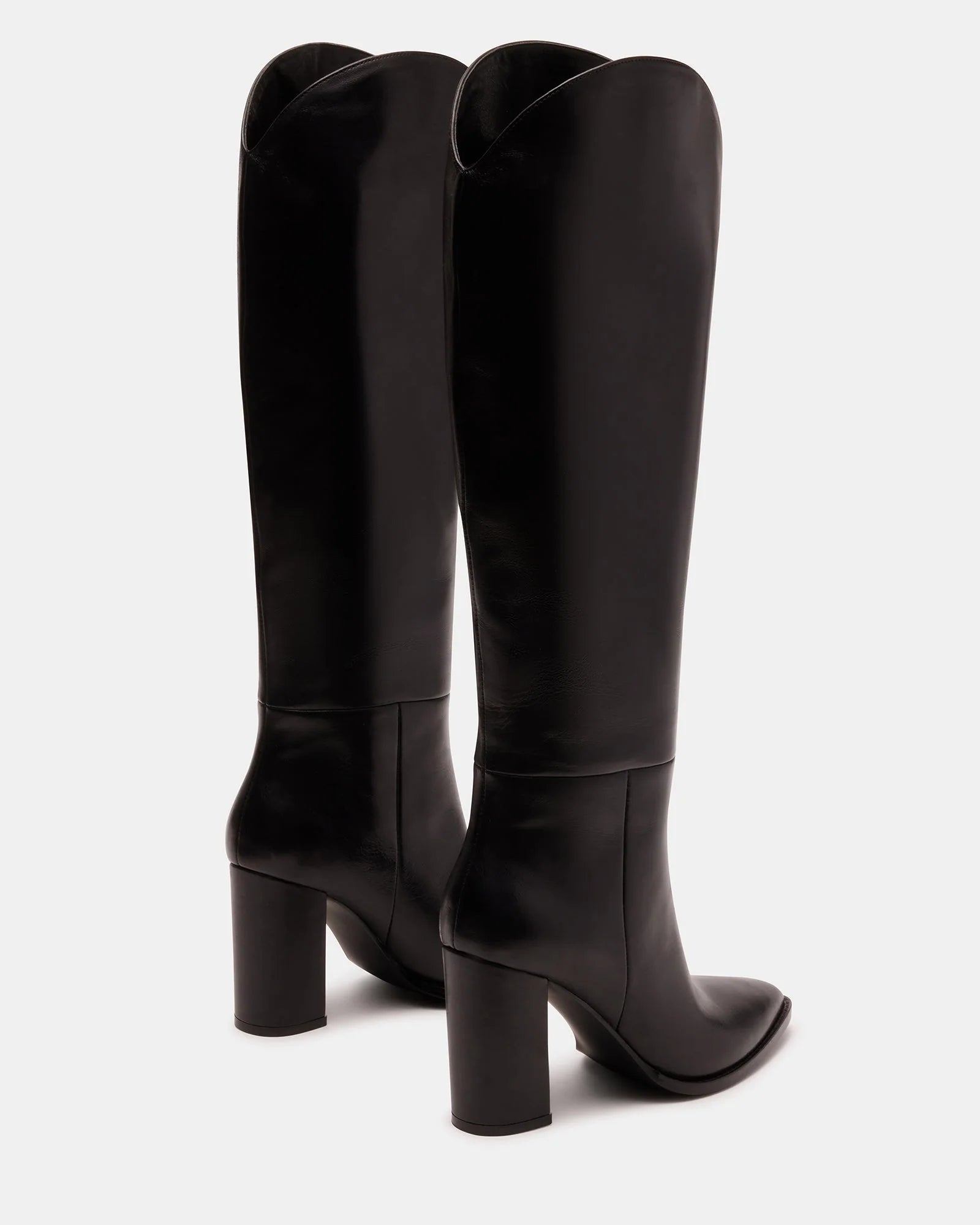A pointed toe and curved topline give the BIXBY block heel knee a Western edge while the sleek upper highlights the clean monochrome look