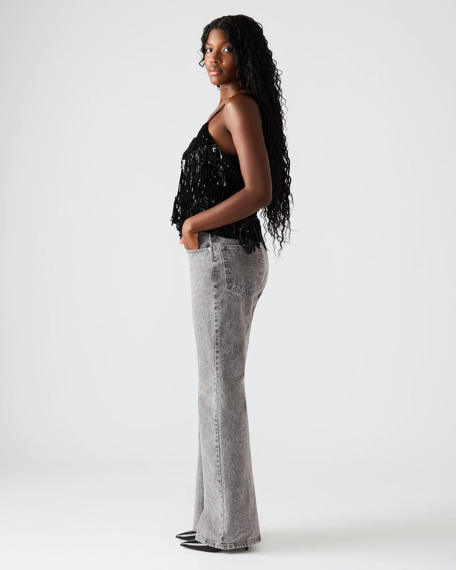 Elevate your evening look with the BLAKELYN SEQUIN BLACK. This sleeveless sequin top offers shimmering coverage for standout style, while its tailored fit ensures a flattering silhouette. Perfect as a statement piece within a matching set or layered with fringe accents, it provides versatile options for sophisticated, fashion-forward ensembles. Ideal for special occasions where eye-catching detail and refined finish are essential.