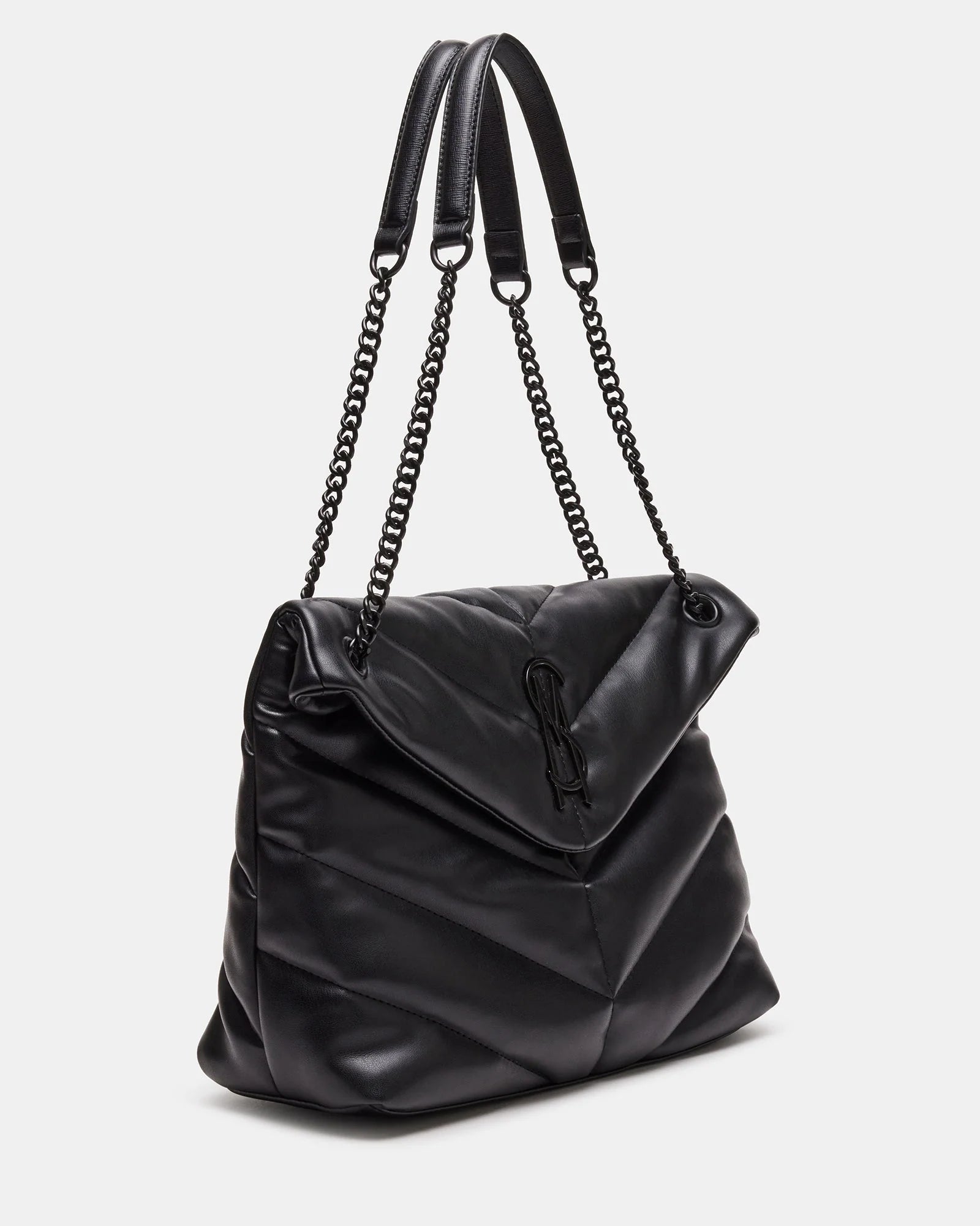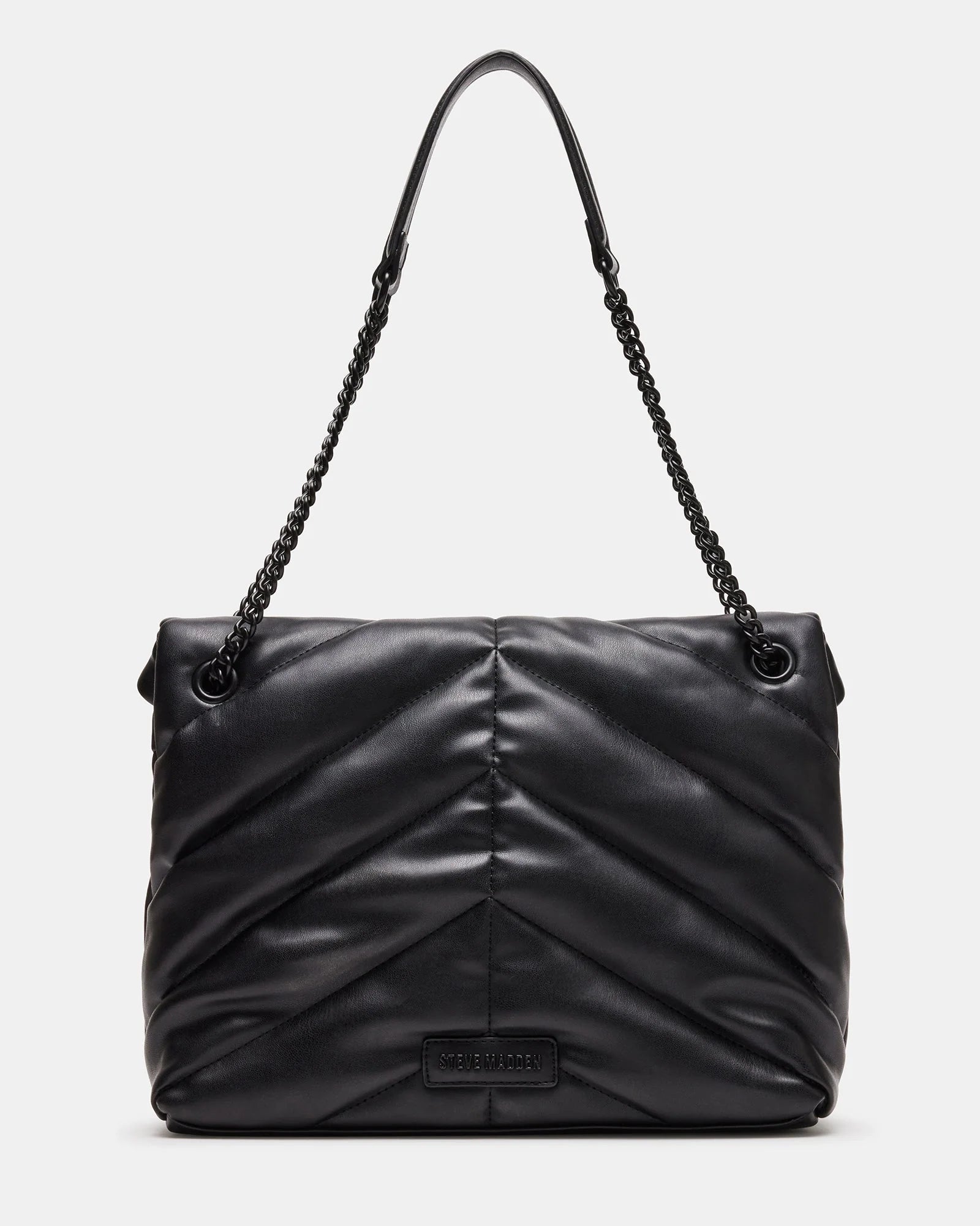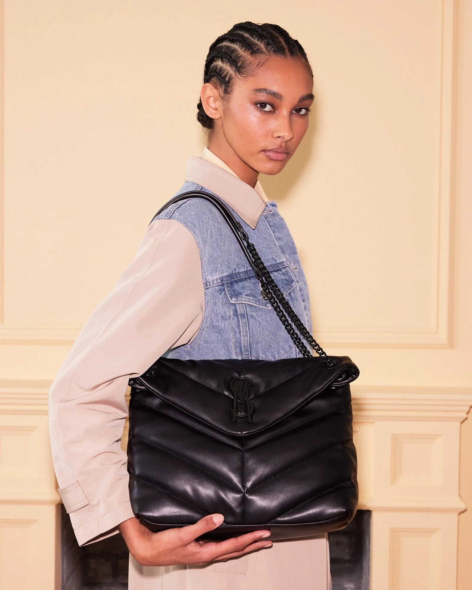 The BRITTA bag features exaggerated, puffy chevron quilting and chain handles long enough to be worn over the shoulder.