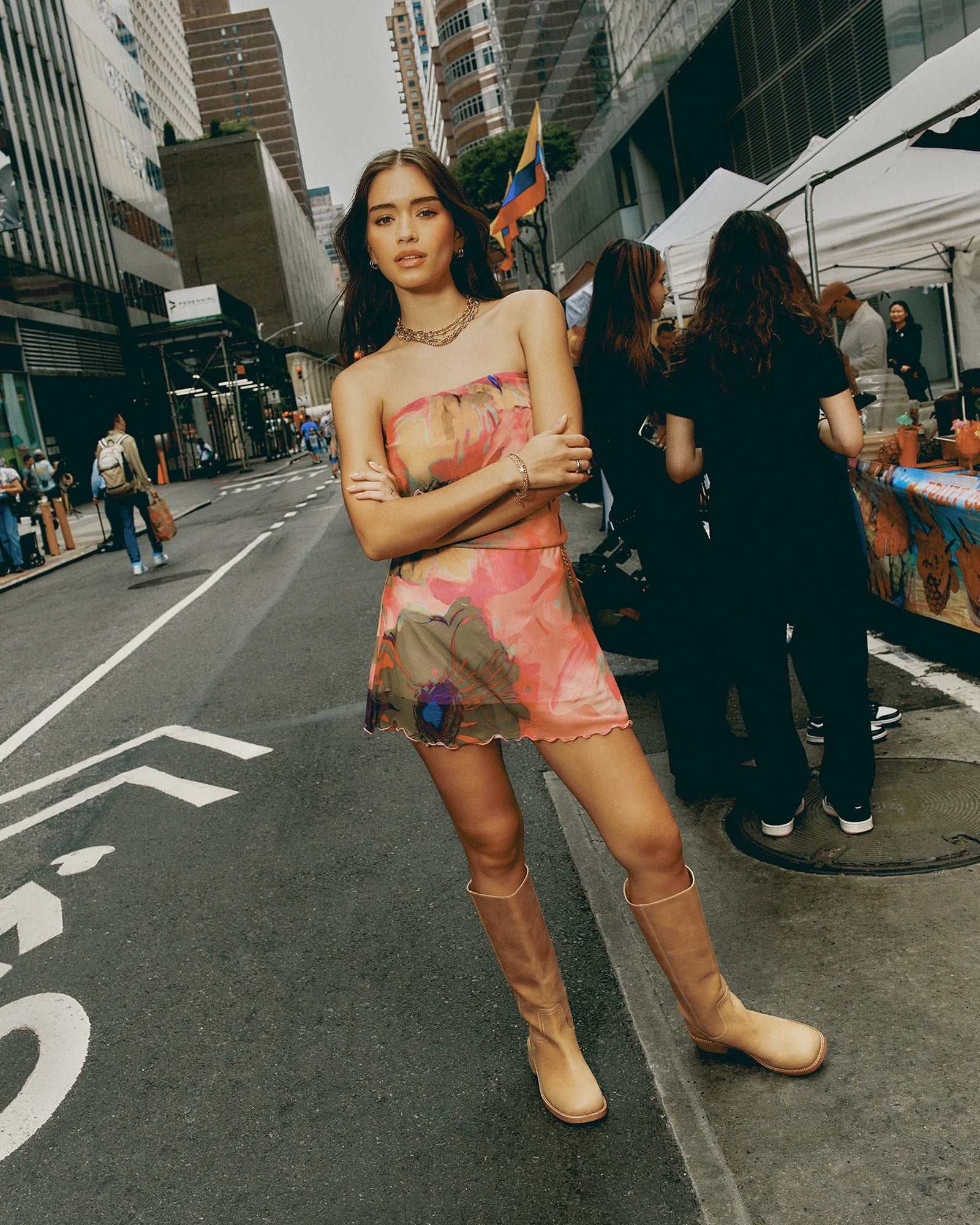 Expertly designed for the modern fashionista, the BRYAR is a stunning floral print mini dress that features a delicate mesh overlay. Its strapless design and flowy silhouette add a touch of elegance to any outfit. Perfect for a summer day out or a special occasion, this dress combines style and comfort effortlessly.