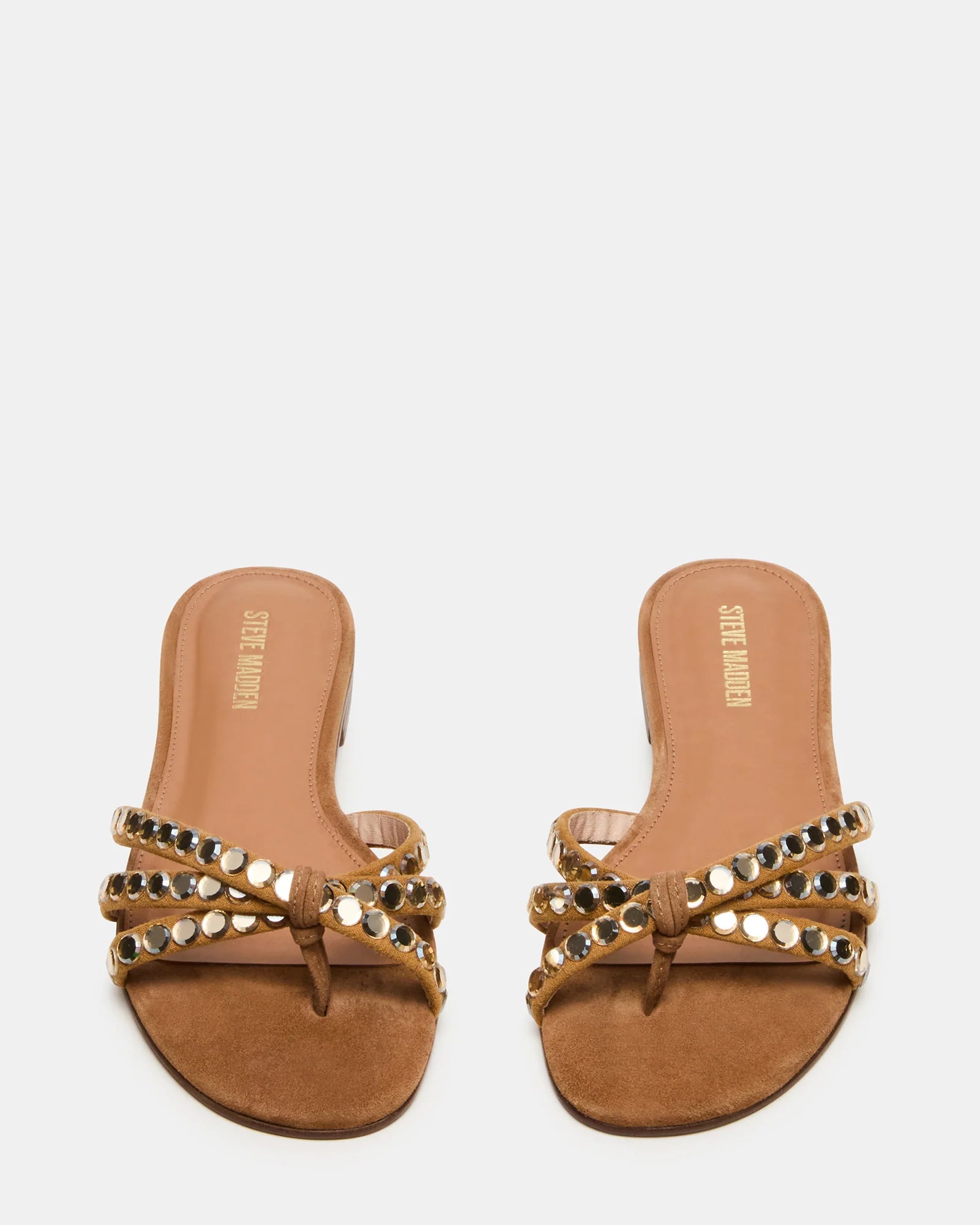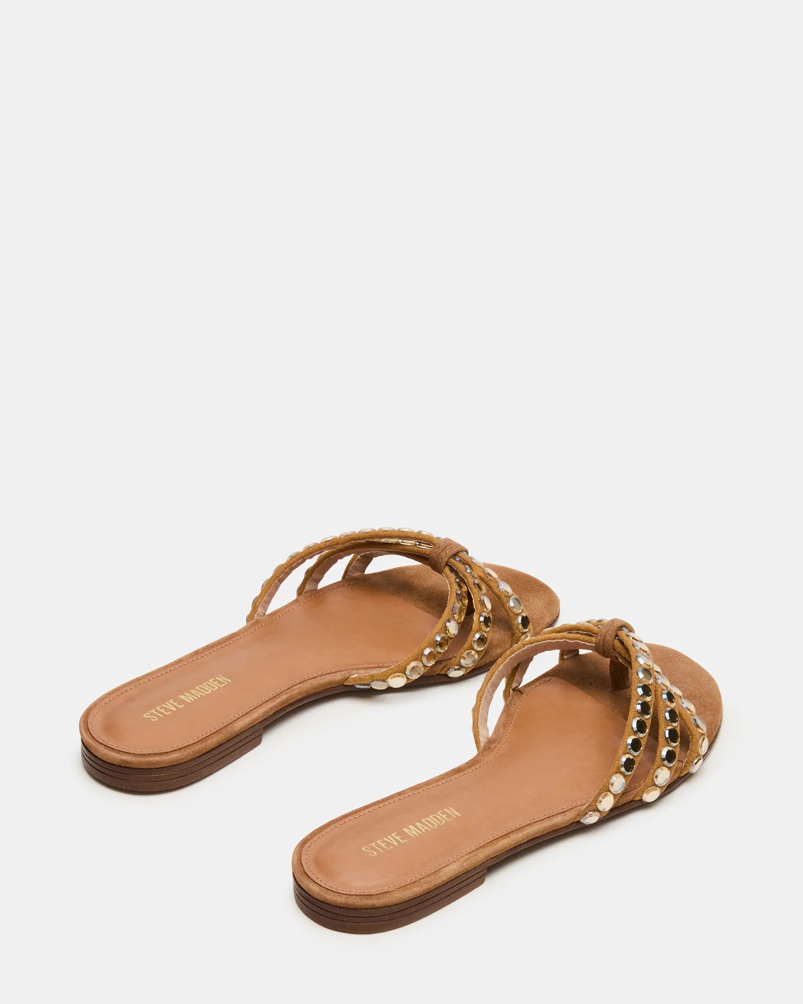 Crafted with luxurious materials, the CALISSI TAUPE SUEDE RHINESTONES features a sleek strappy design and a comfortable flat sole. Perfect for any occasion, these sandals effortlessly elevate your outfit while providing all-day comfort.