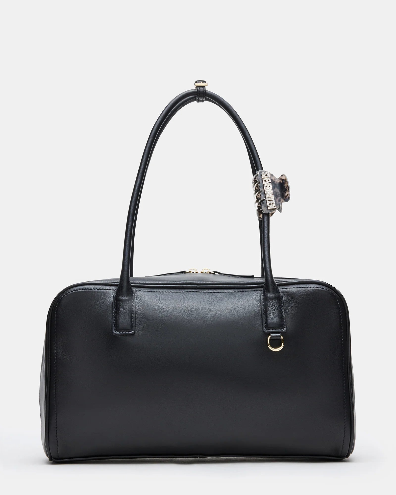 The CANDICE BAG BLACK is a sophisticated box satchel designed for versatile wear with its tubular shoulder straps and an attachable rhinestone embellished hair clip for added elegance. Featuring a secure zipper closure, it offers organized storage with an interior pouch on the back wall and gussets that expand for extra capacity, making it both stylish and practical for everyday use.