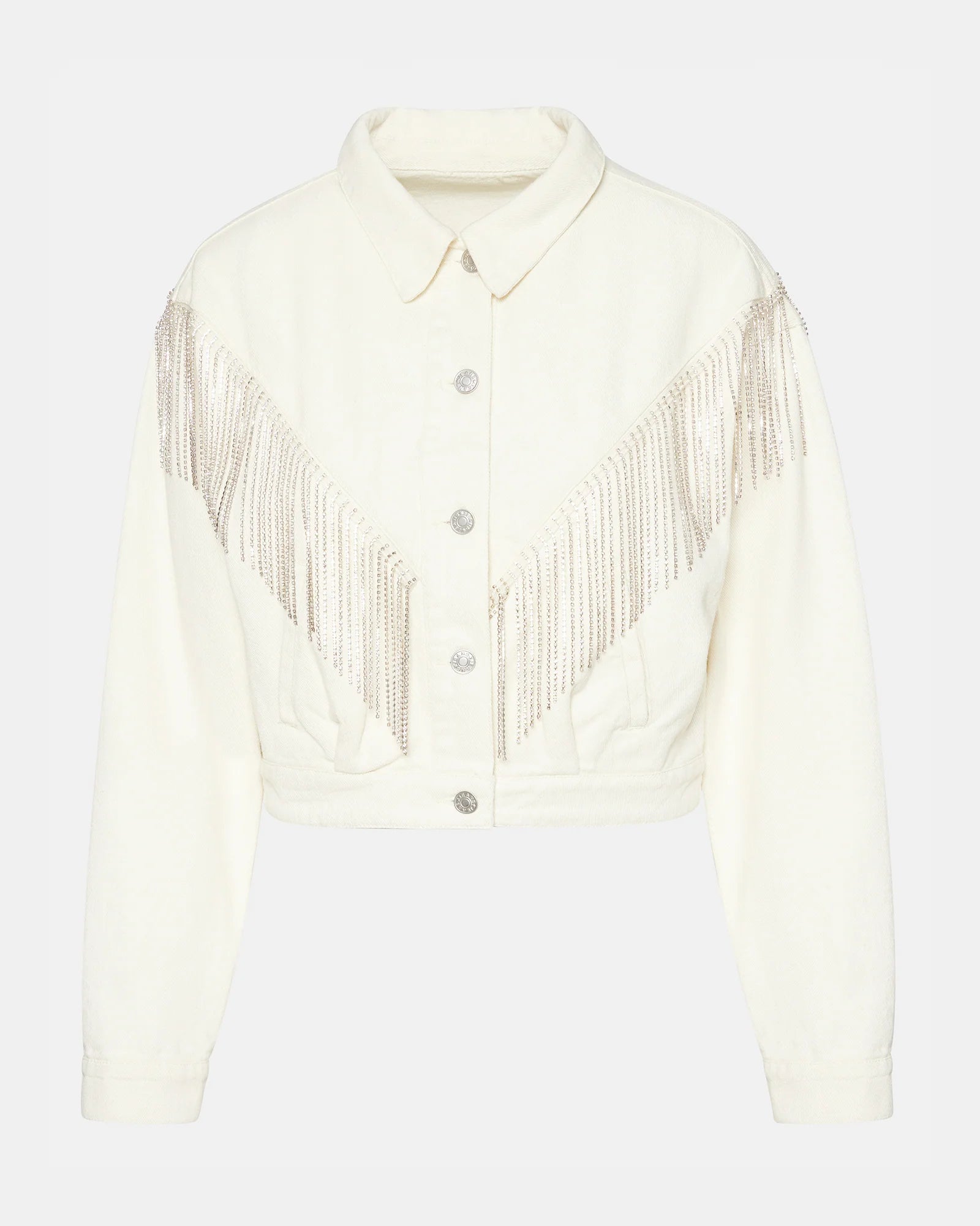 Expertly crafted, the CANYON denim is a must-have addition to any wardrobe. This cropped denim jacket features exquisite rhinestone fringes for a touch of Western glamour, while the button-up closure ensures a perfect fit.