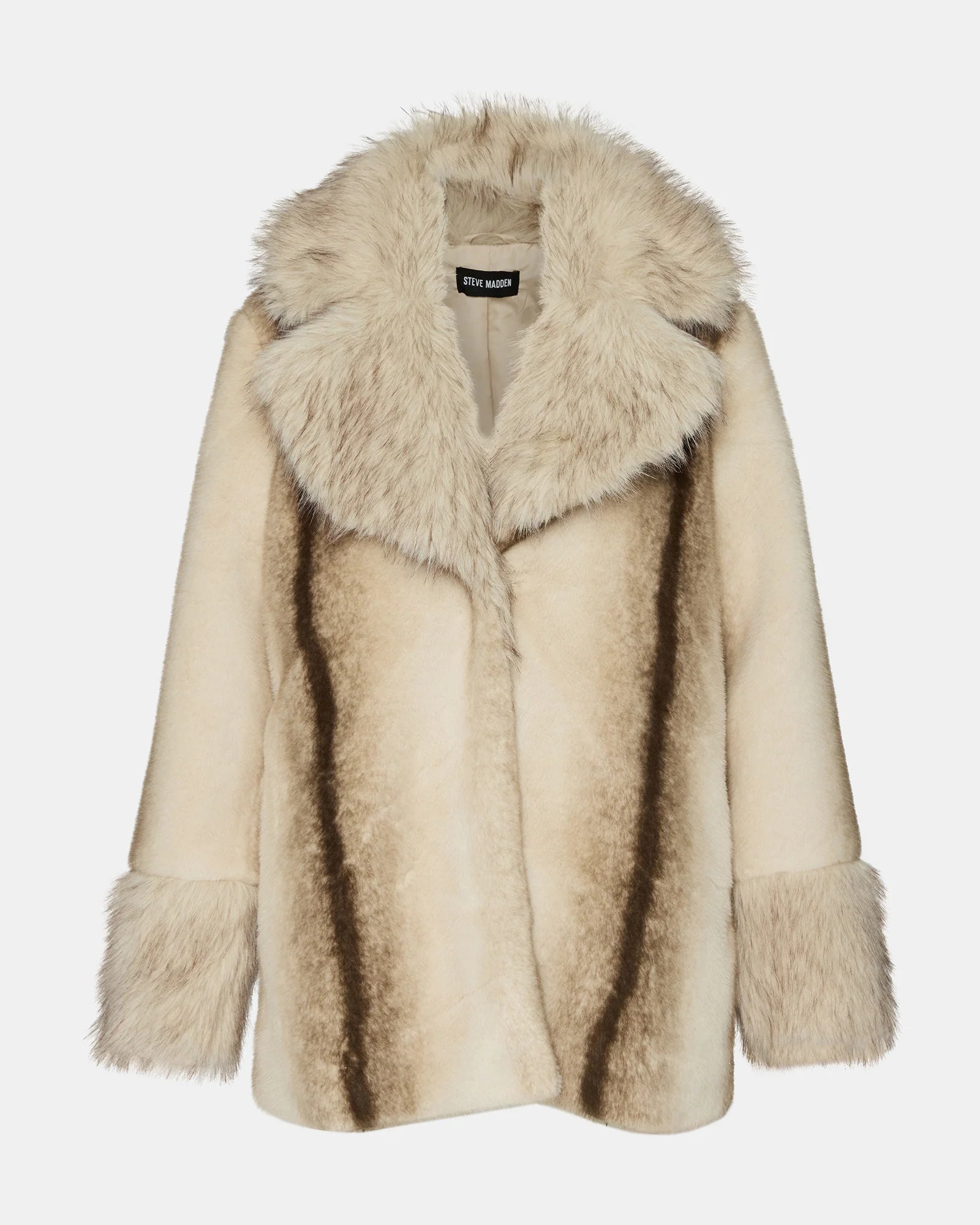 The CARMELINA MULTI features a long-sleeved design crafted from luxurious faux fur, offering both warmth and style. Its multicolored pattern adds a distinctive, fashionable edge ideal for elevating any winter wardrobe. This jacket combines plush comfort with expert tailoring, making it a sophisticated choice for cold-weather layering.