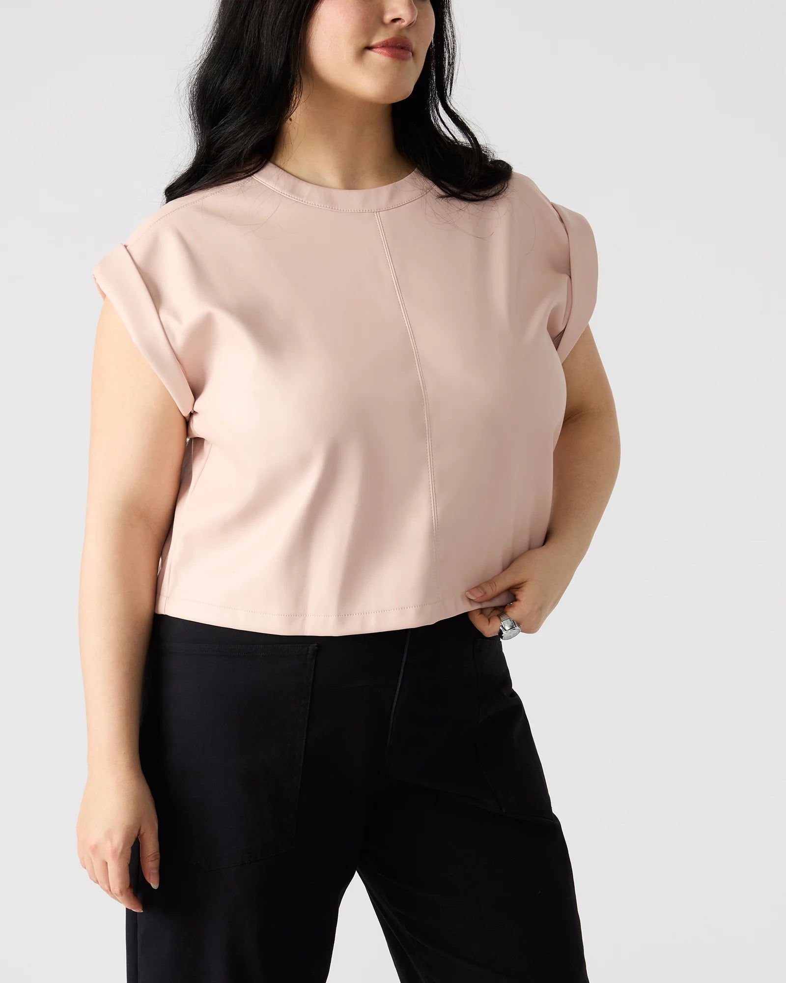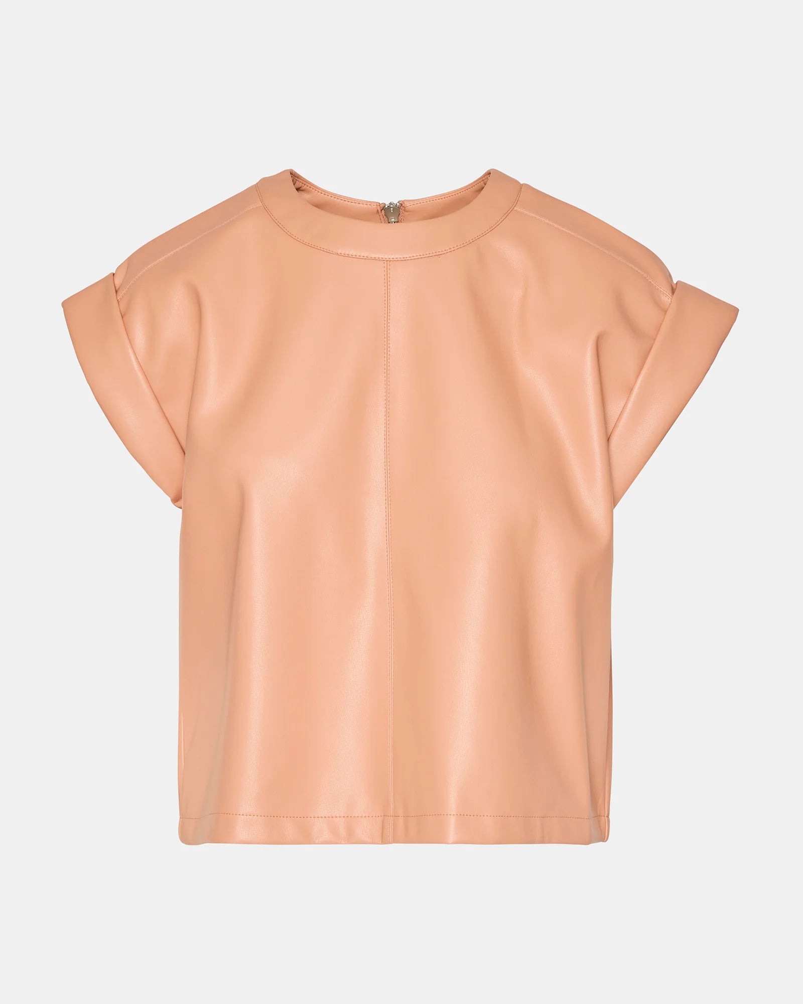 This CAT is a versatile addition to your wardrobe. Made with faux leather, it features short-sleeves and a back-zipper closure for a stylish and comfortable fit. Perfect for any occasion, this top will elevate your outfit with its sleek and modern design.