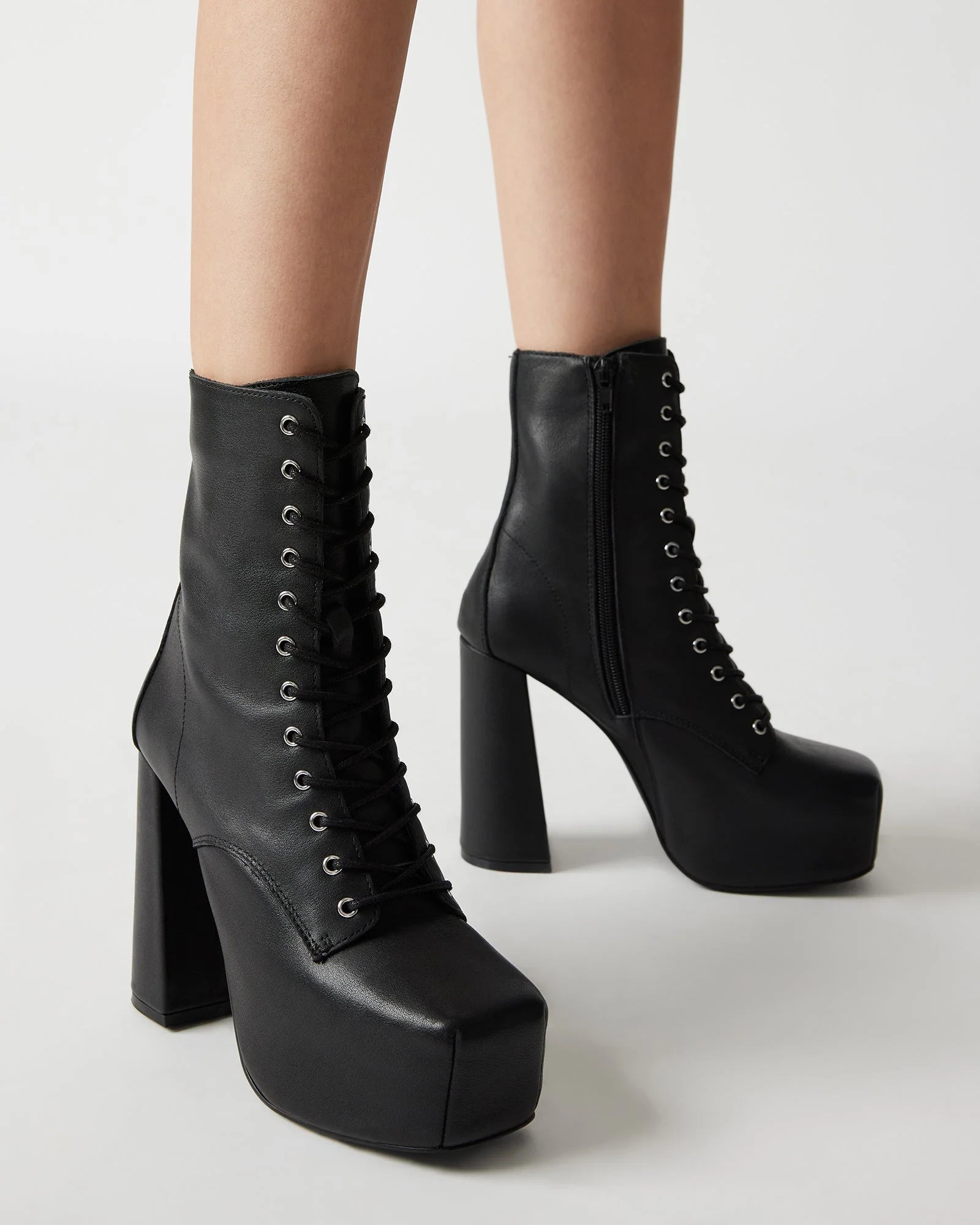 A square toe platform and an angled block heel give the CONFIDENT a dynamic exaggerated silhouette, with lacing at the front for an adjustable fit.