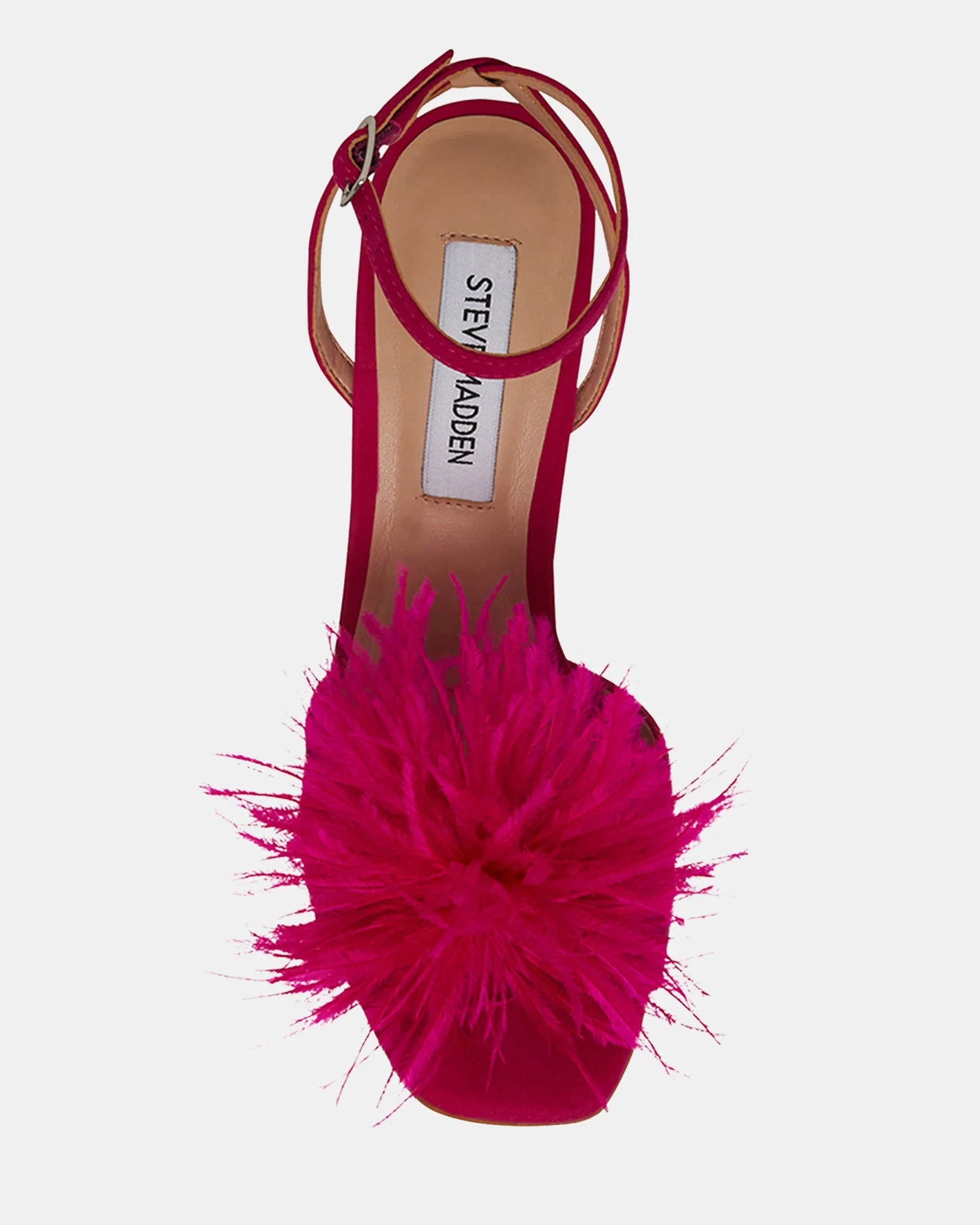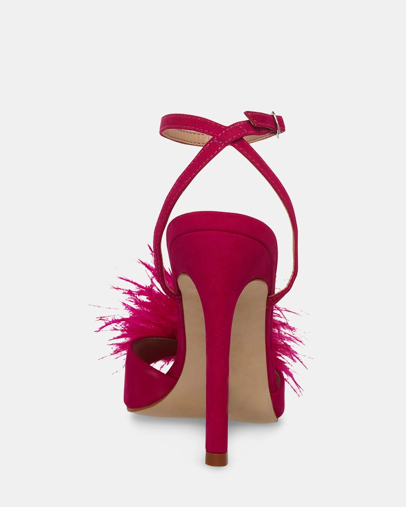 A squared toe and a stiletto are softened with a puff of feathers on the toe of the CRUSH .