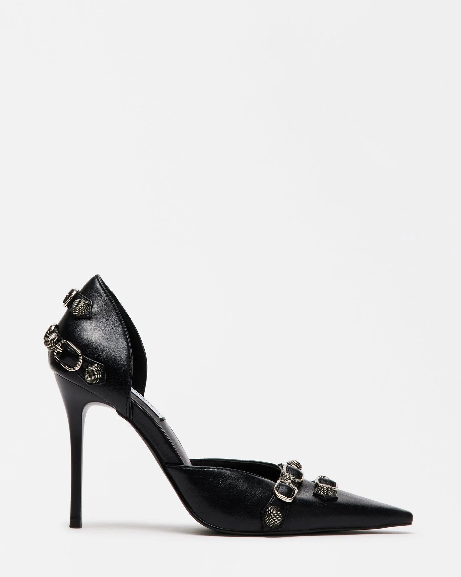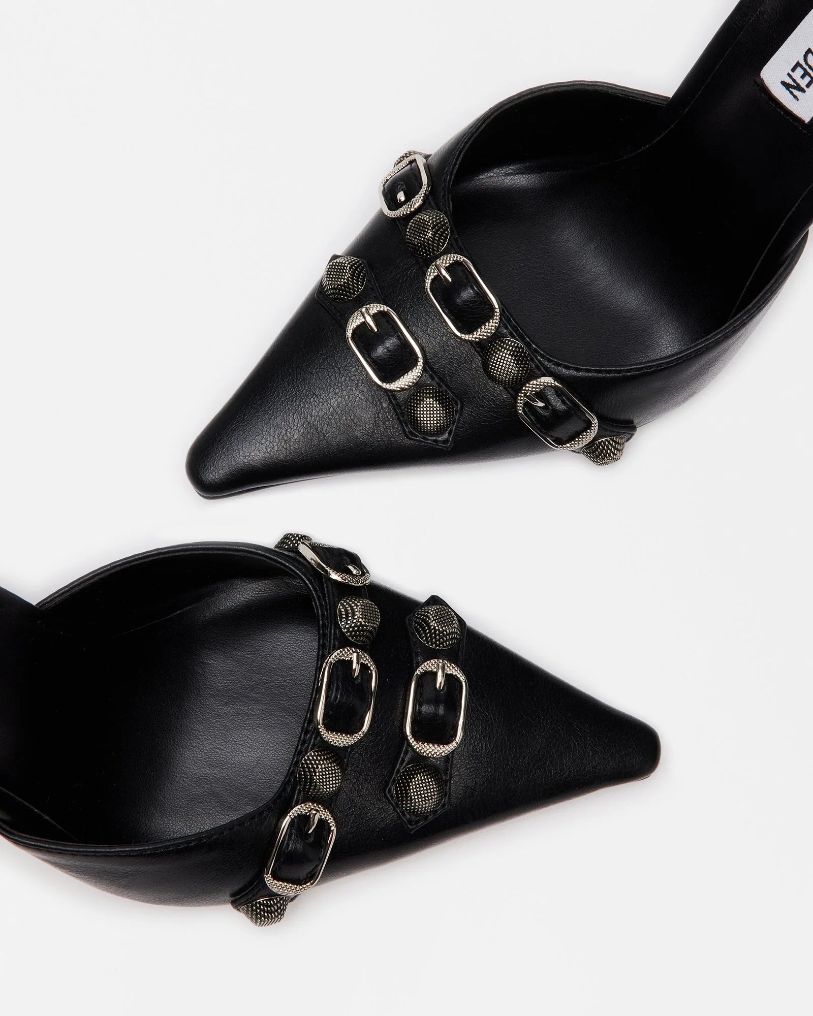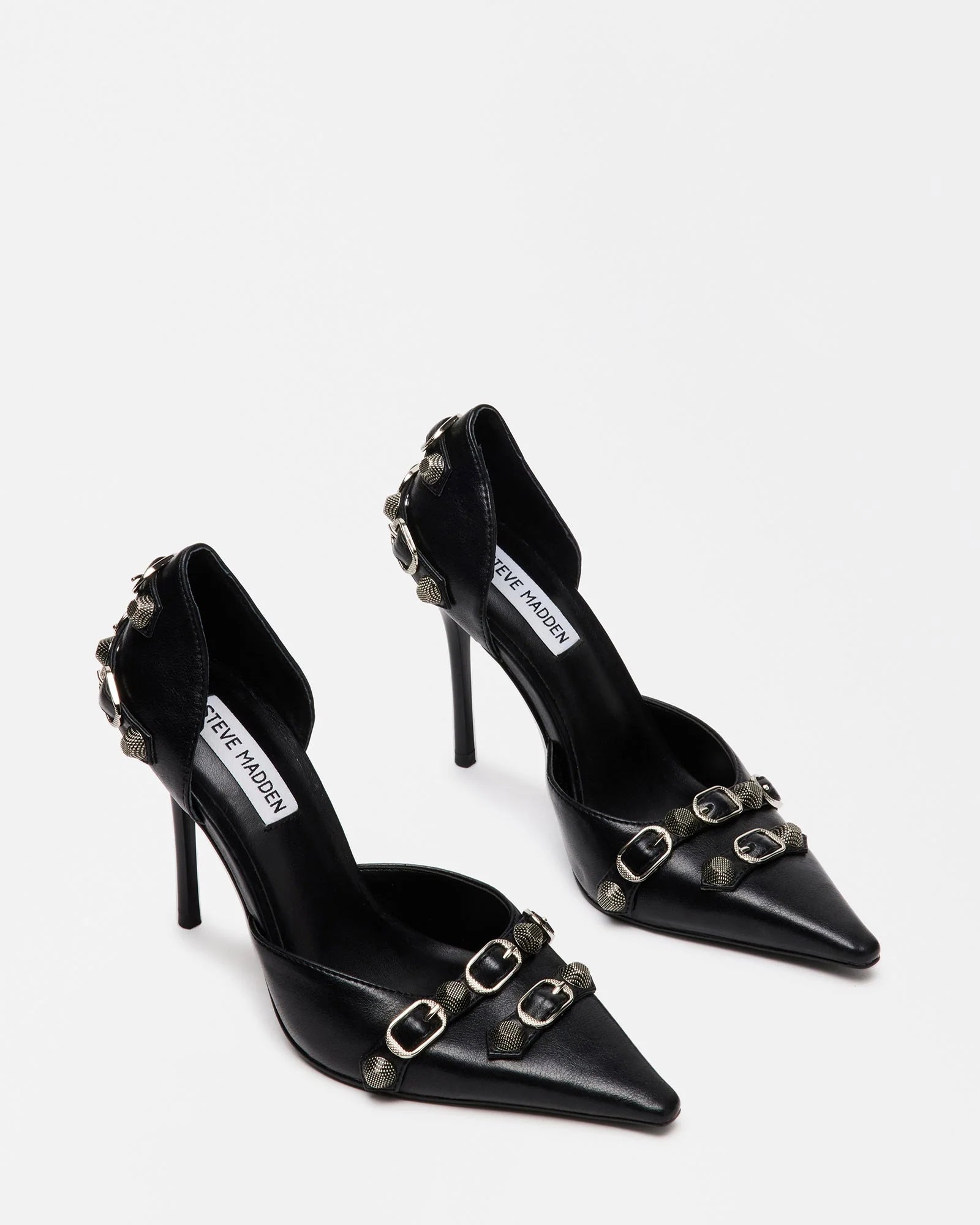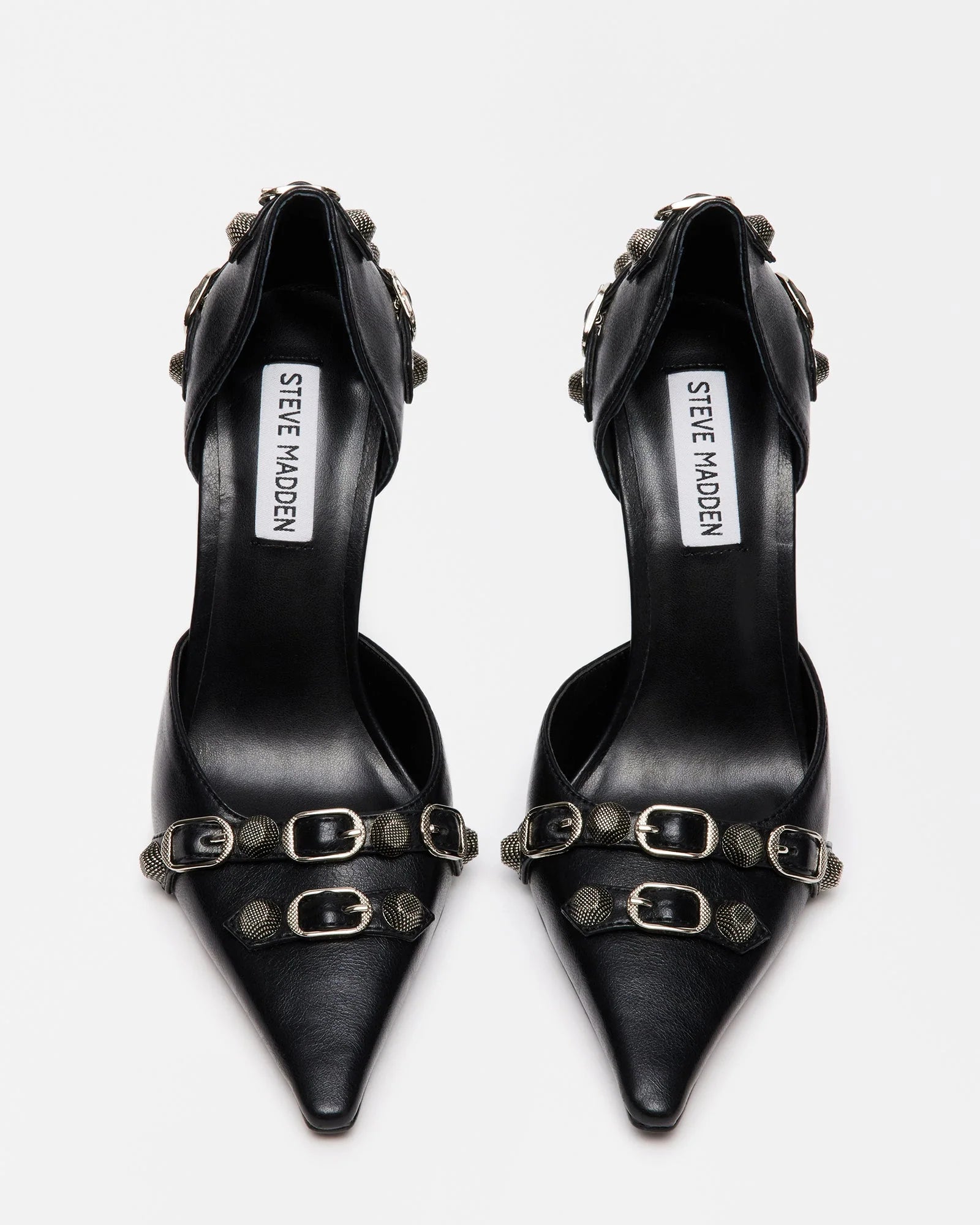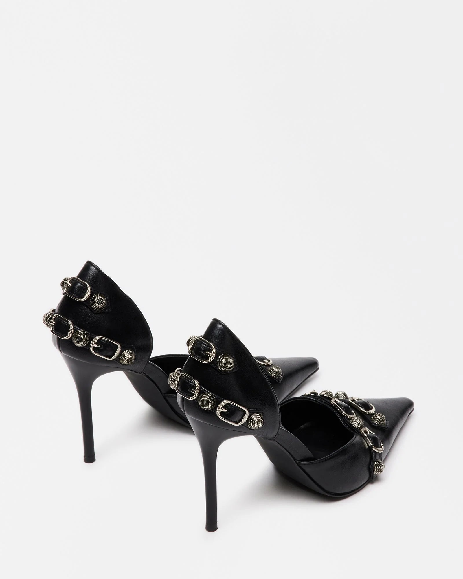 The DALI features substantial textured studs and buckles embellishing the point toe and the back of the ankle.