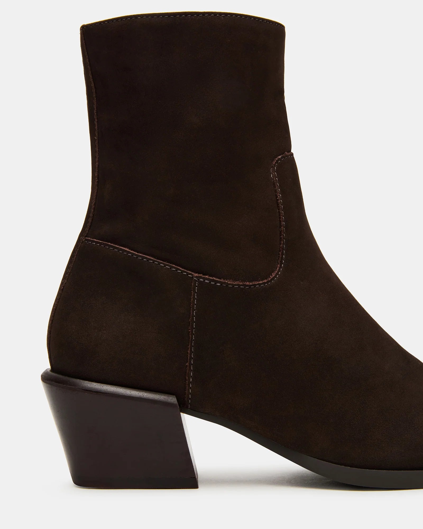 The DANEY BROWN SUEDE square-toe ankle boot combines modern design with sophisticated comfort. Crafted from quality materials, its structured square toe offers a contemporary edge while providing ample space for all-day wear. The sleek silhouette and sturdy design make this a versatile choice, seamlessly elevating both casual and dressier outfits with expert style and refined functionality.