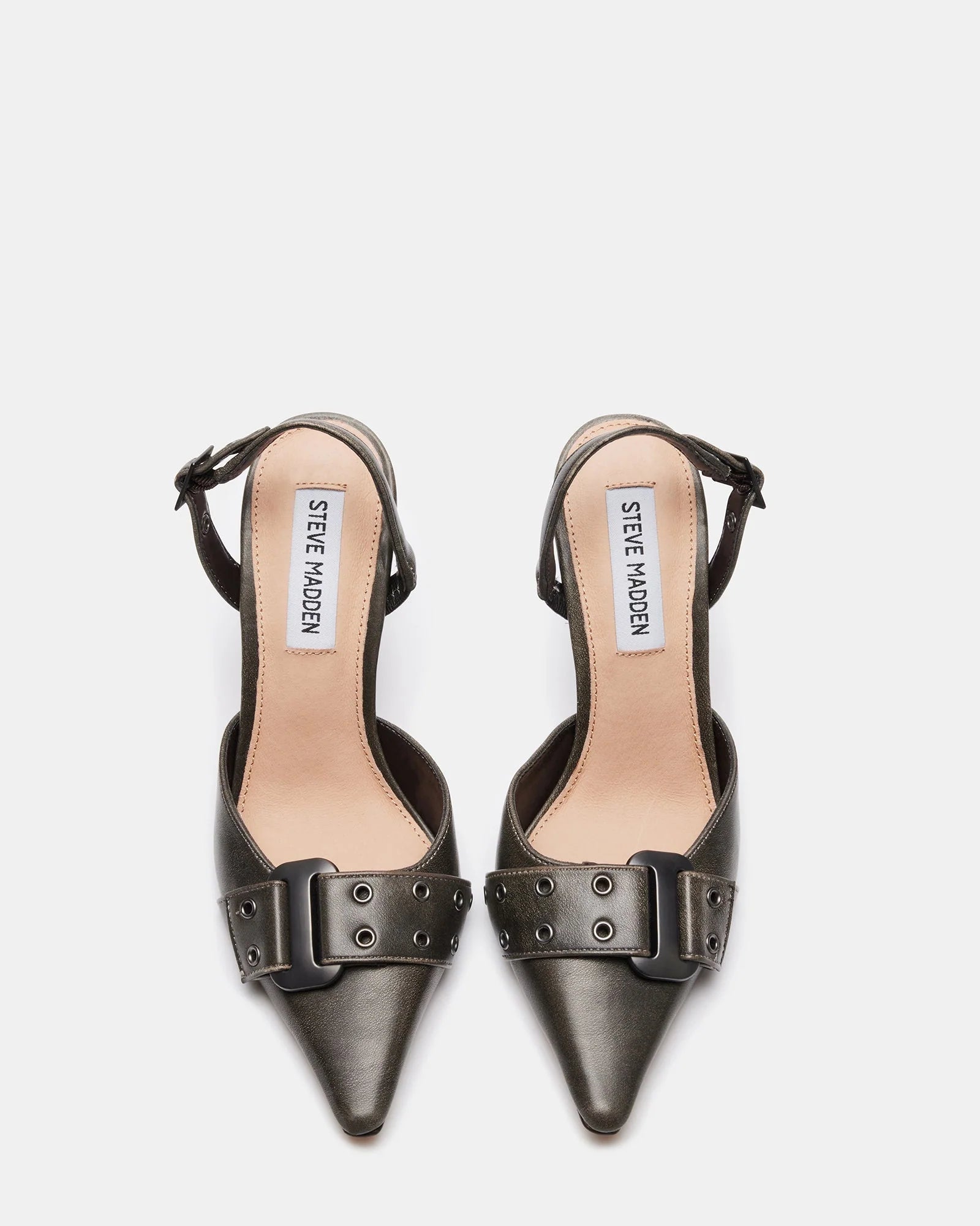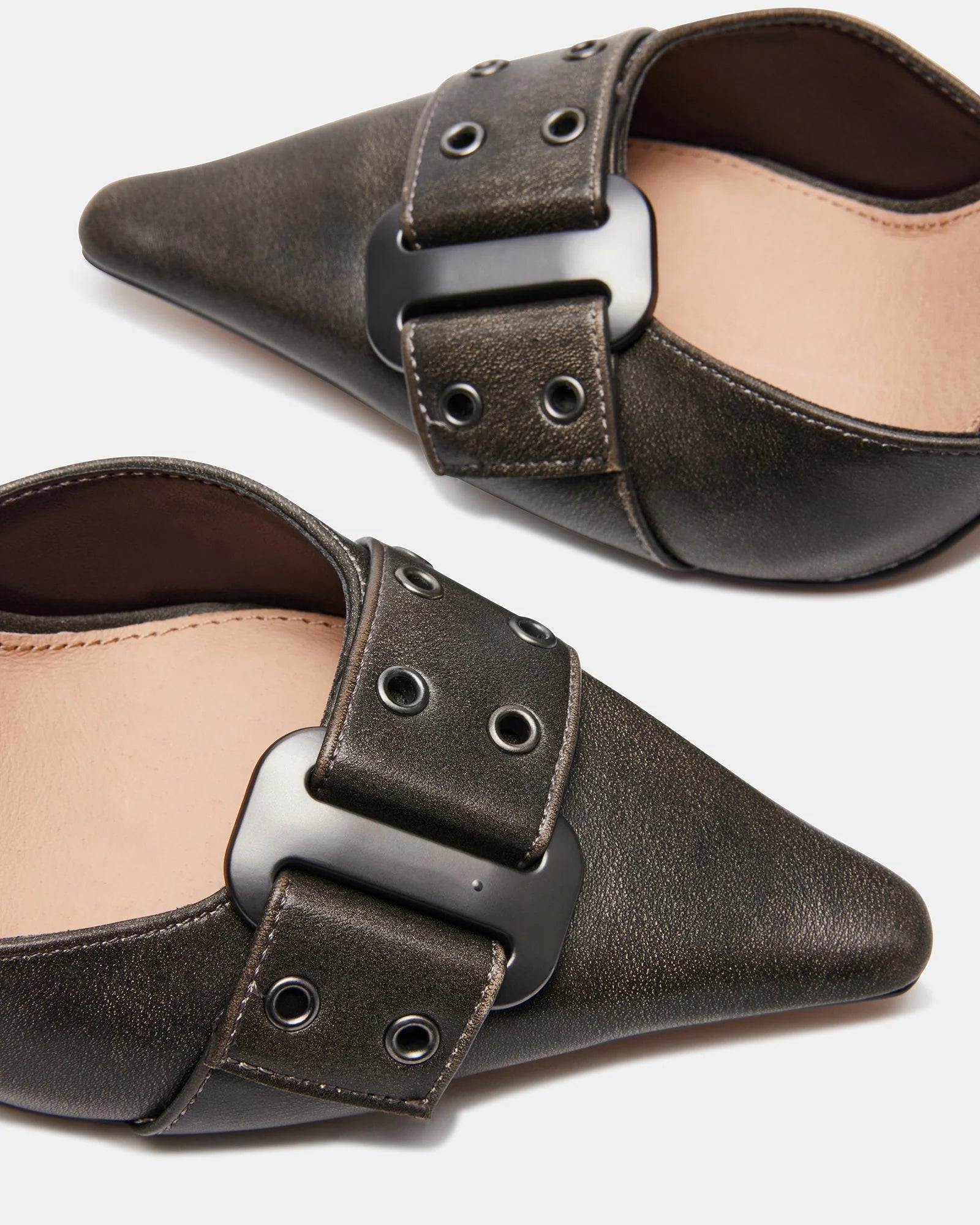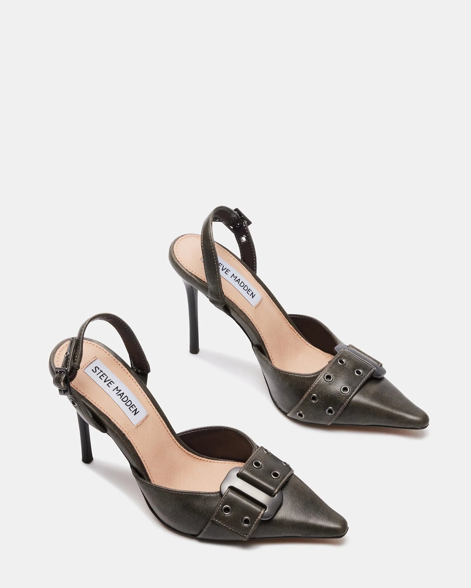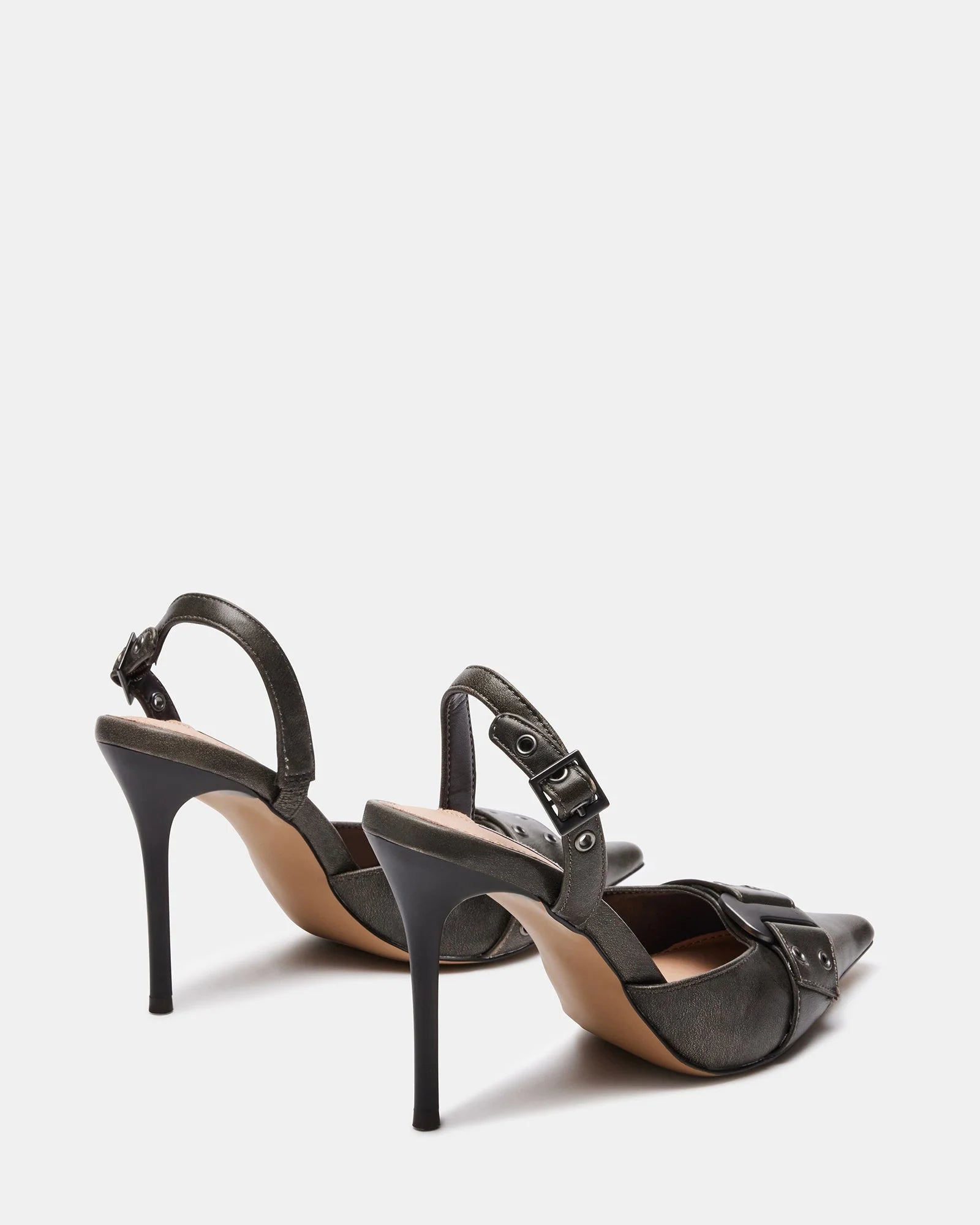 The DILLON pump features a point toe silhouette accented with chunky buckle hardware.