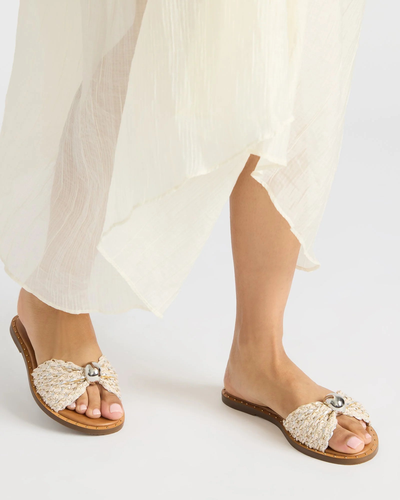 This DIPSY features mini studs and a rounded toe for added style and comfort. The perfect combination of fashion and practicality, these sandals are a must-have for any wardrobe. With their natural raffia design, they add a touch of rustic charm to any outfit.