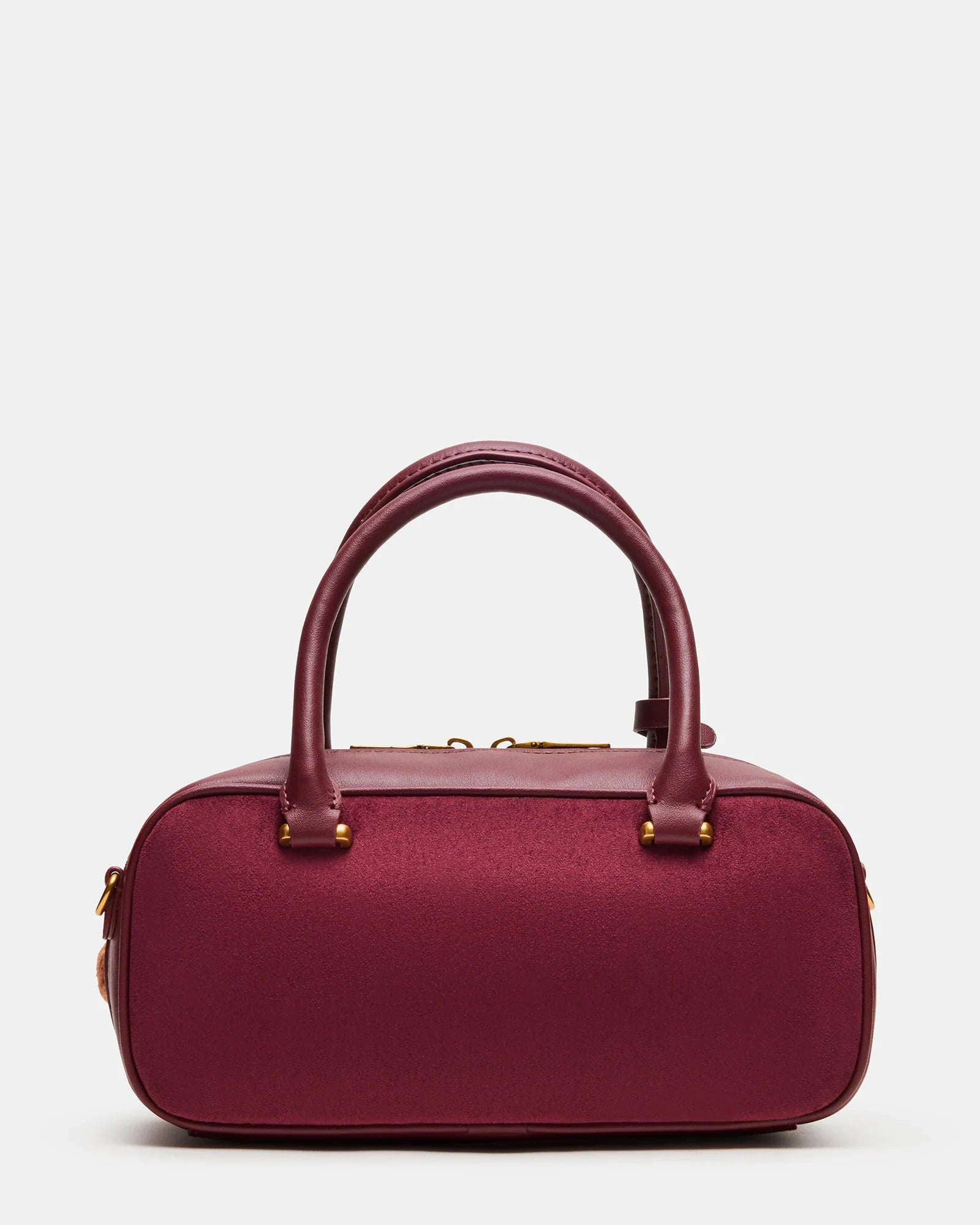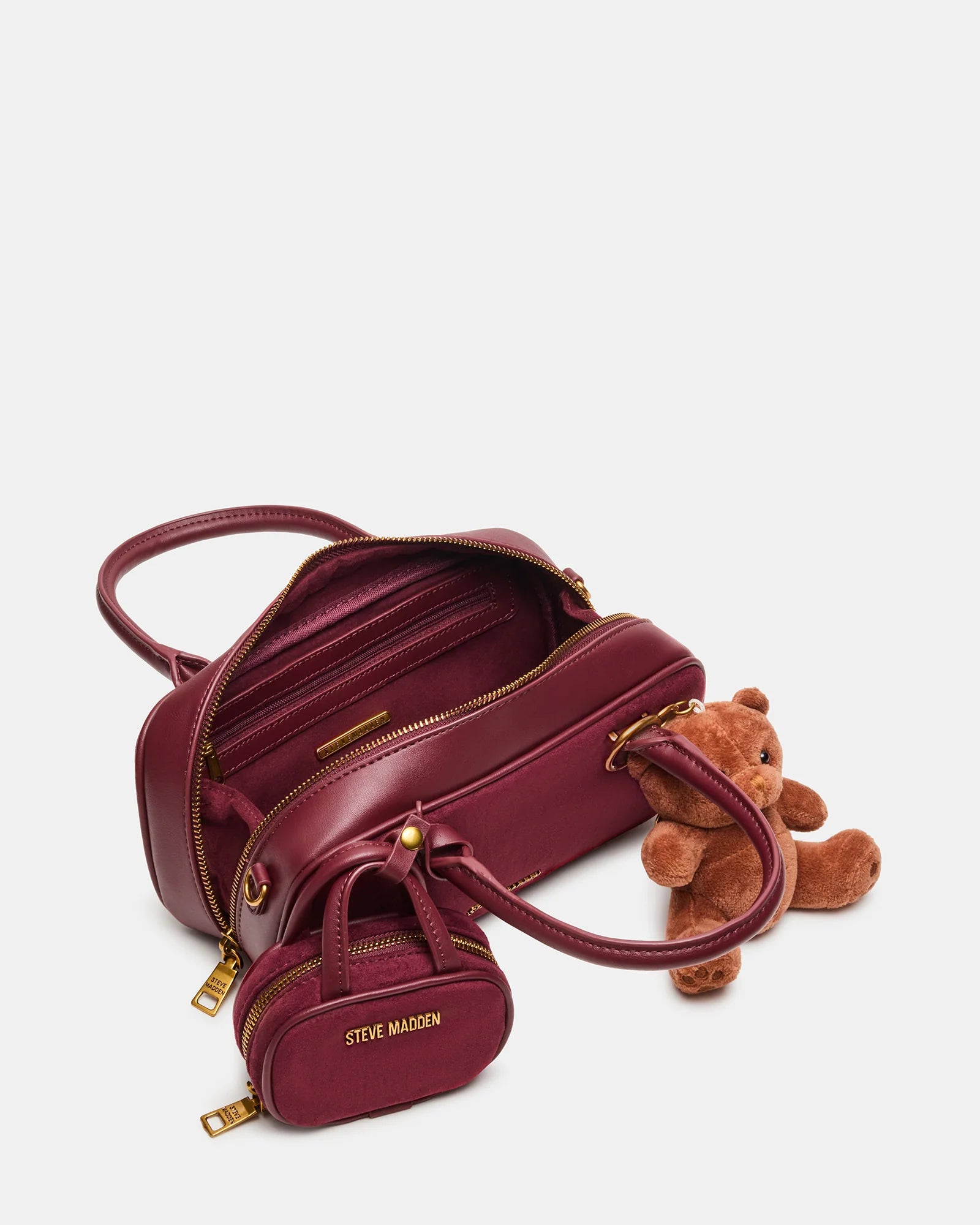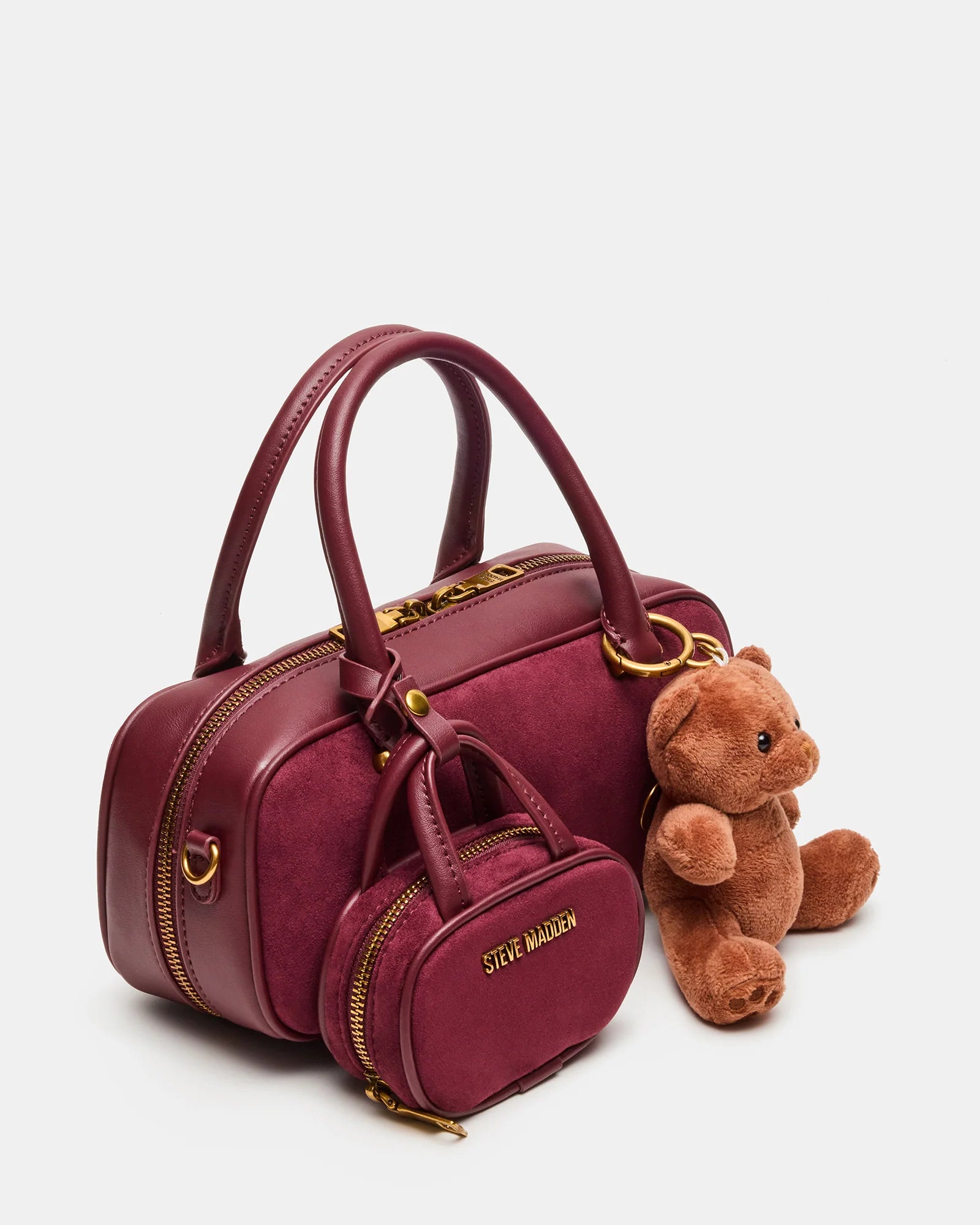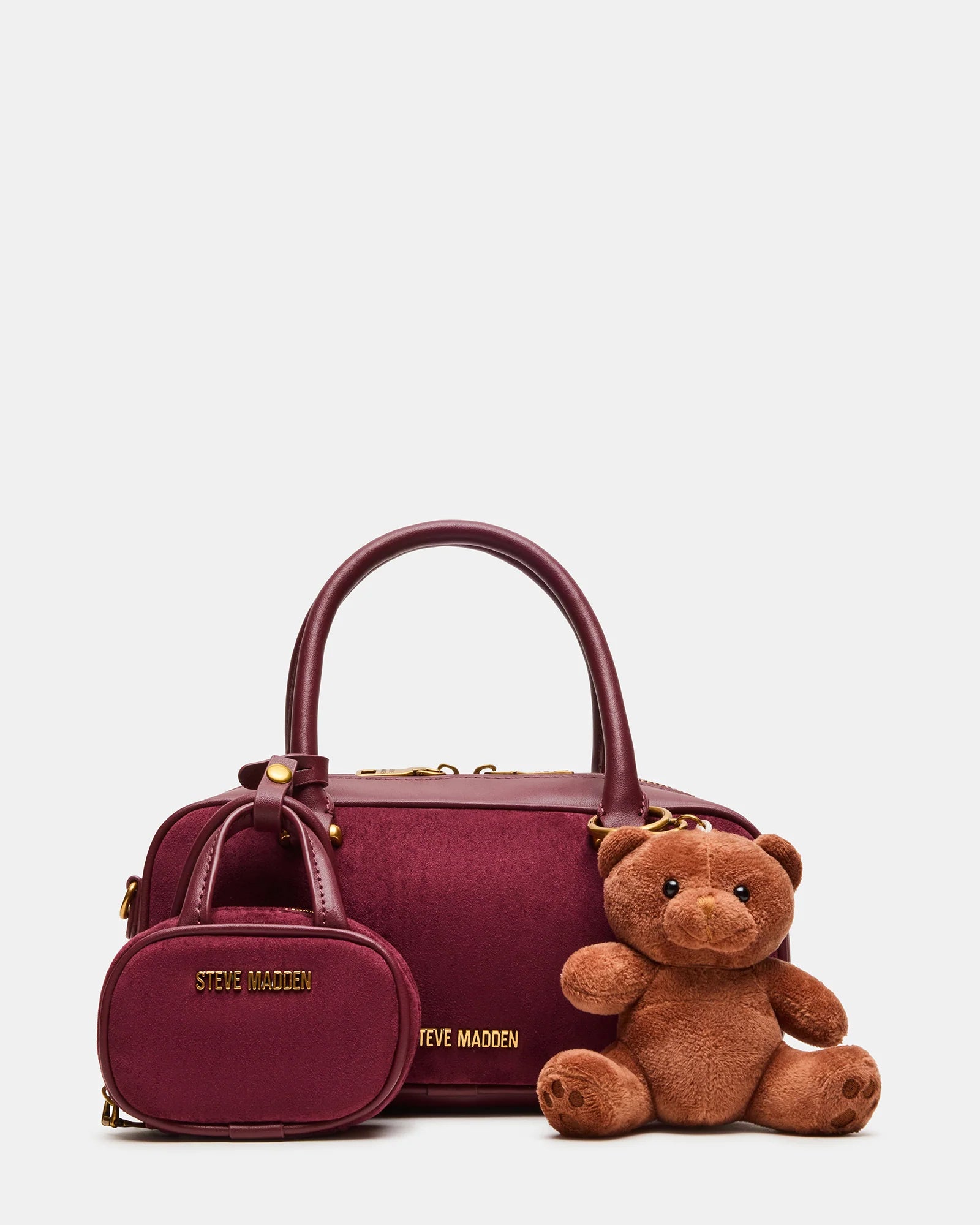 This DIVERS CHARM BOX GIFT SET BLOODSTONE multi-piece set includes a chic small satchel with a top handle and an attachable crossbody strap for versatile carrying options. It also features a detachable micro bag charm and a plush bear bag charm, adding playful and customizable accents to your look. Perfect for gifting, this set combines practical design with stylish details for everyday elegance.