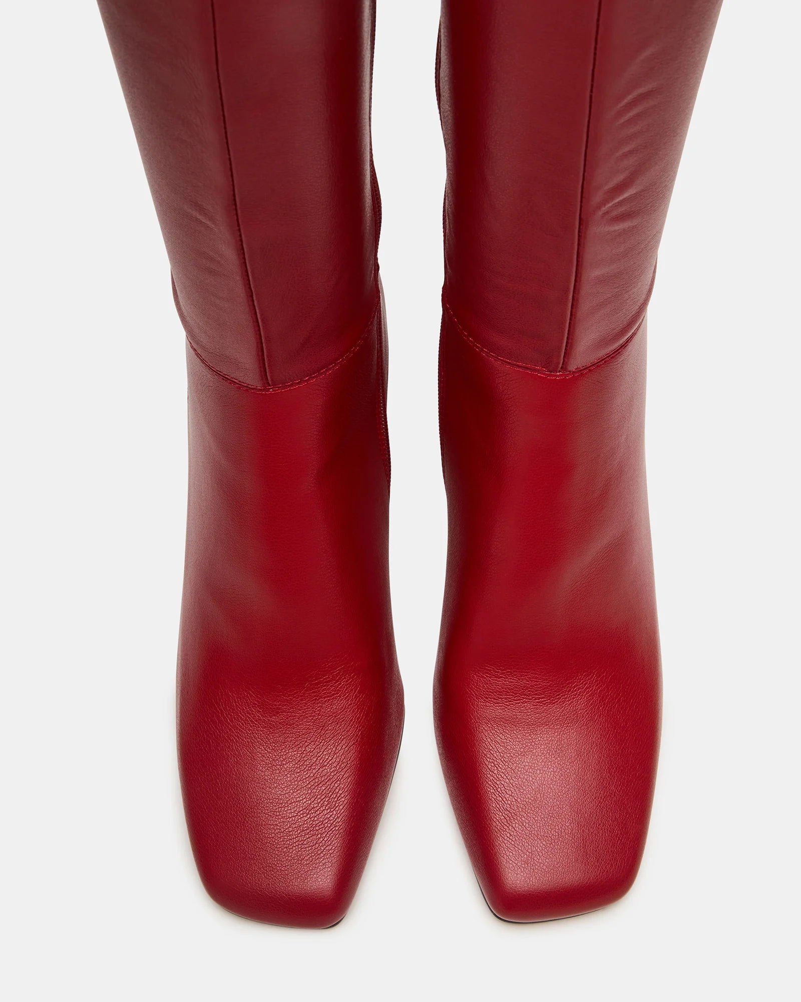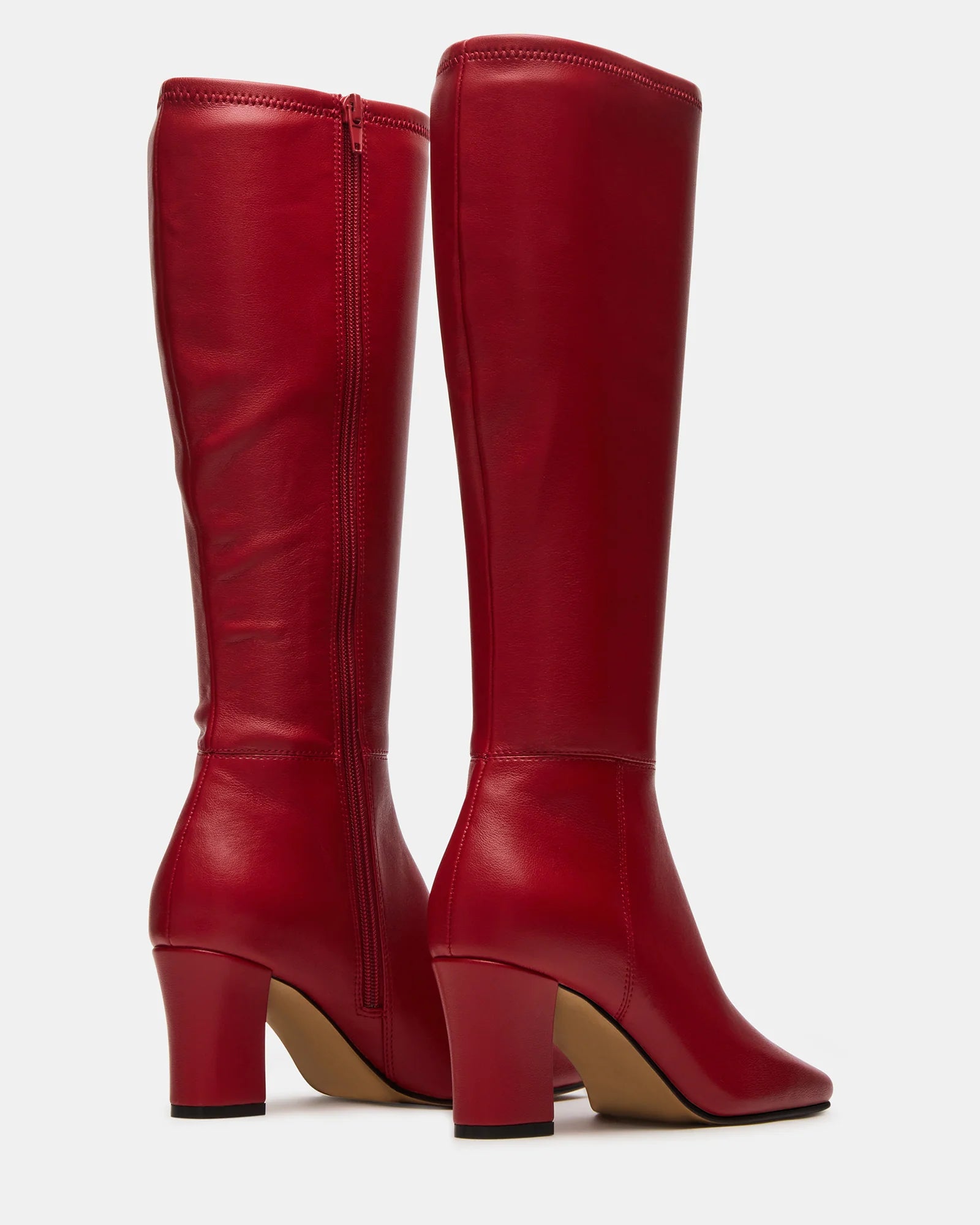 Elevate your footwear collection with the ELLIOT RED a sleek square-toe knee-high designed for both style and stability. Featuring a sturdy block heel, this boot offers confident support and a modern silhouette. Its tall shaft provides versatile coverage that pairs effortlessly with various outfits, making it a sophisticated choice for any occasion.