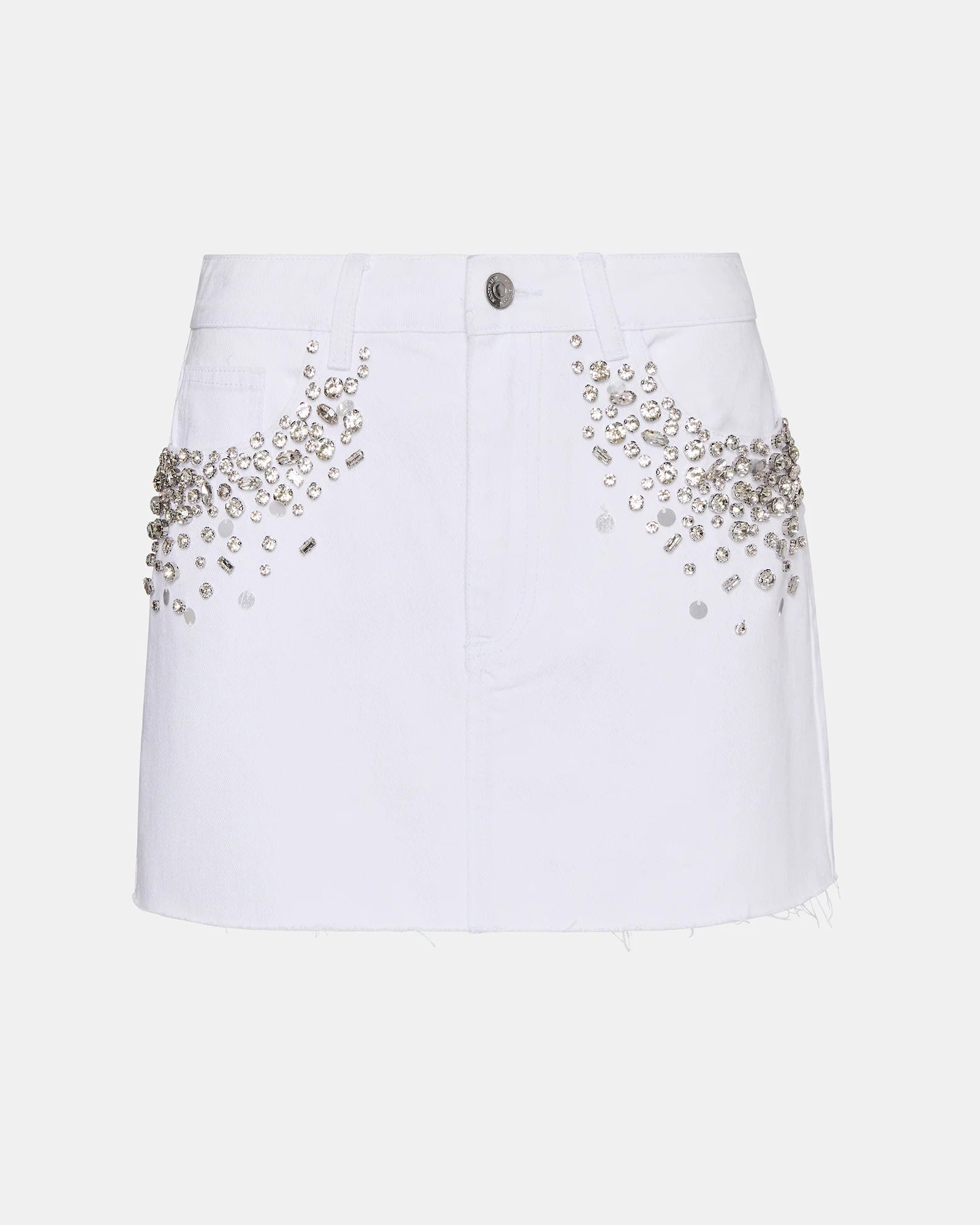 Expertly crafted for style and comfort, the ERAS denim is a must-have in every fashionista's wardrobe. This denim mini skirt features a button and zipper closure for a secure fit, as well as functional front and back pockets to keep your essentials close. With stunning rhinestone embellishments, elevate your casual look with a touch of sparkle.