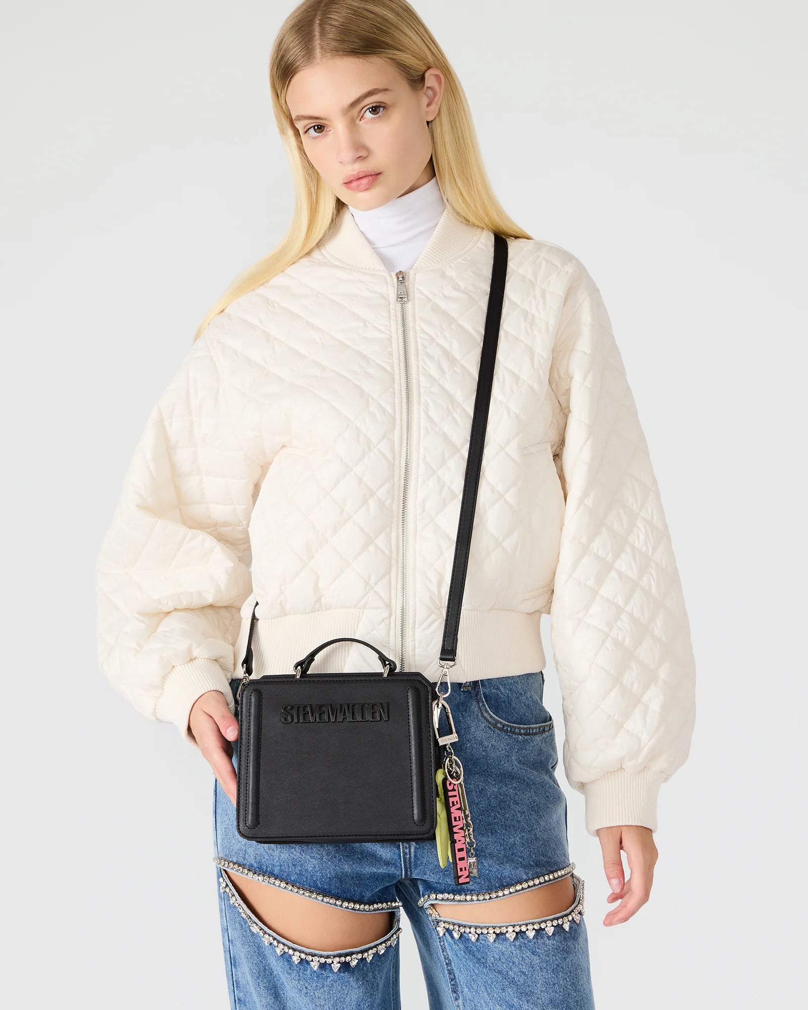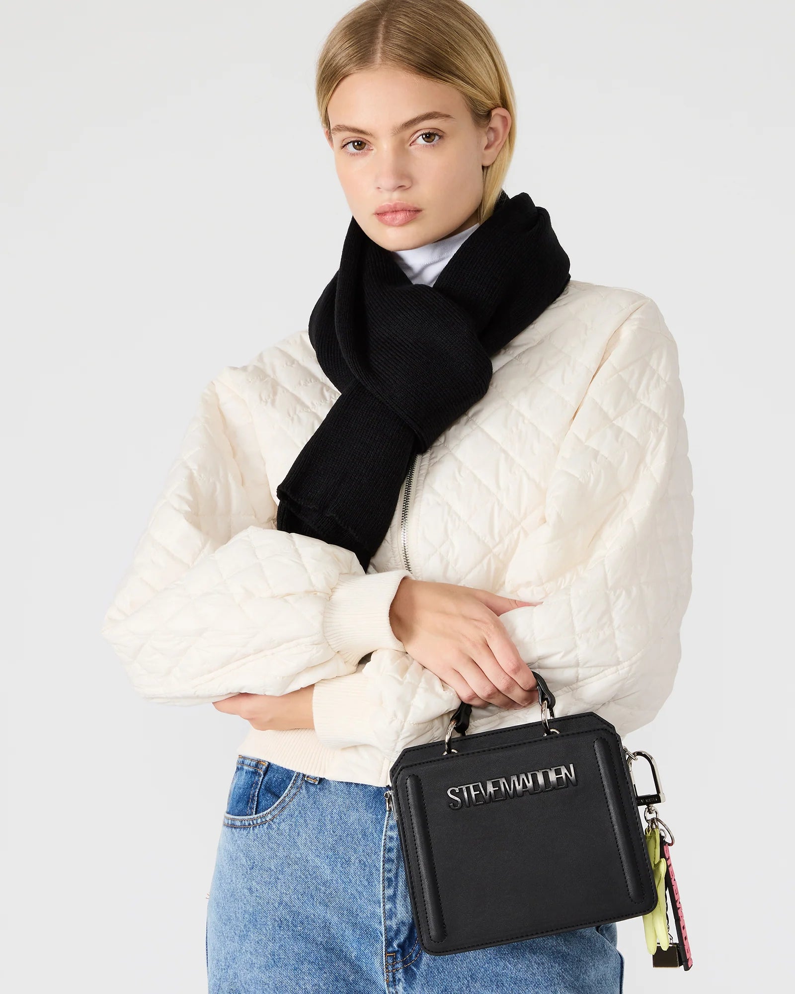 The EVELYN CHARM BOX GIFT SET BLACK includes the classic Evelyn bag, designed for versatile wear with both top-handle and crossbody options. This set features an attachable charm with a chain link, adorned by a bear figure and the brand’s logo, adding a playful yet sophisticated touch. Complementing the look is a solid color scarf, perfect for styling in multiple ways. This curated collection blends classic elegance with contemporary accents for a polished, expert finish.