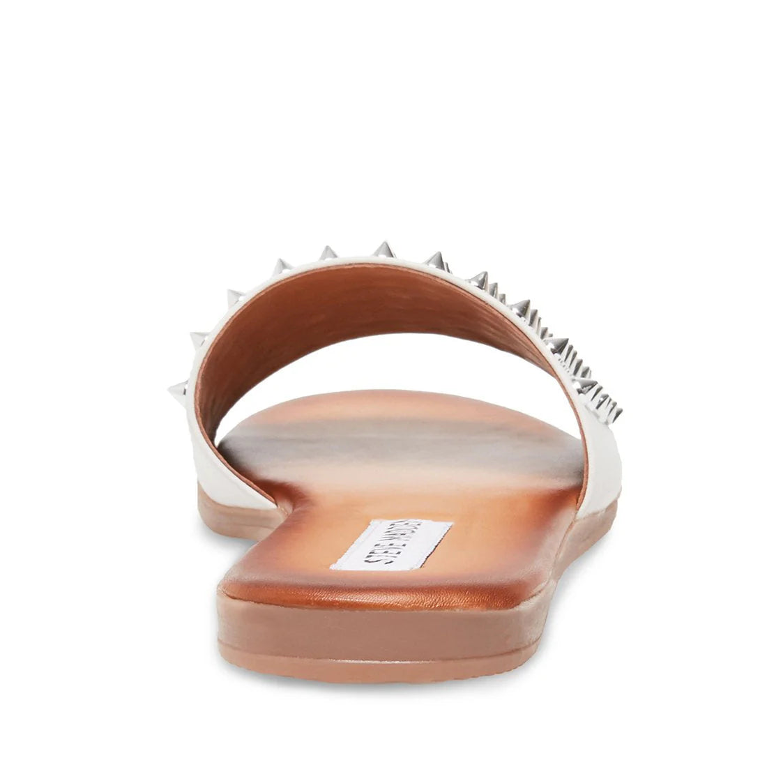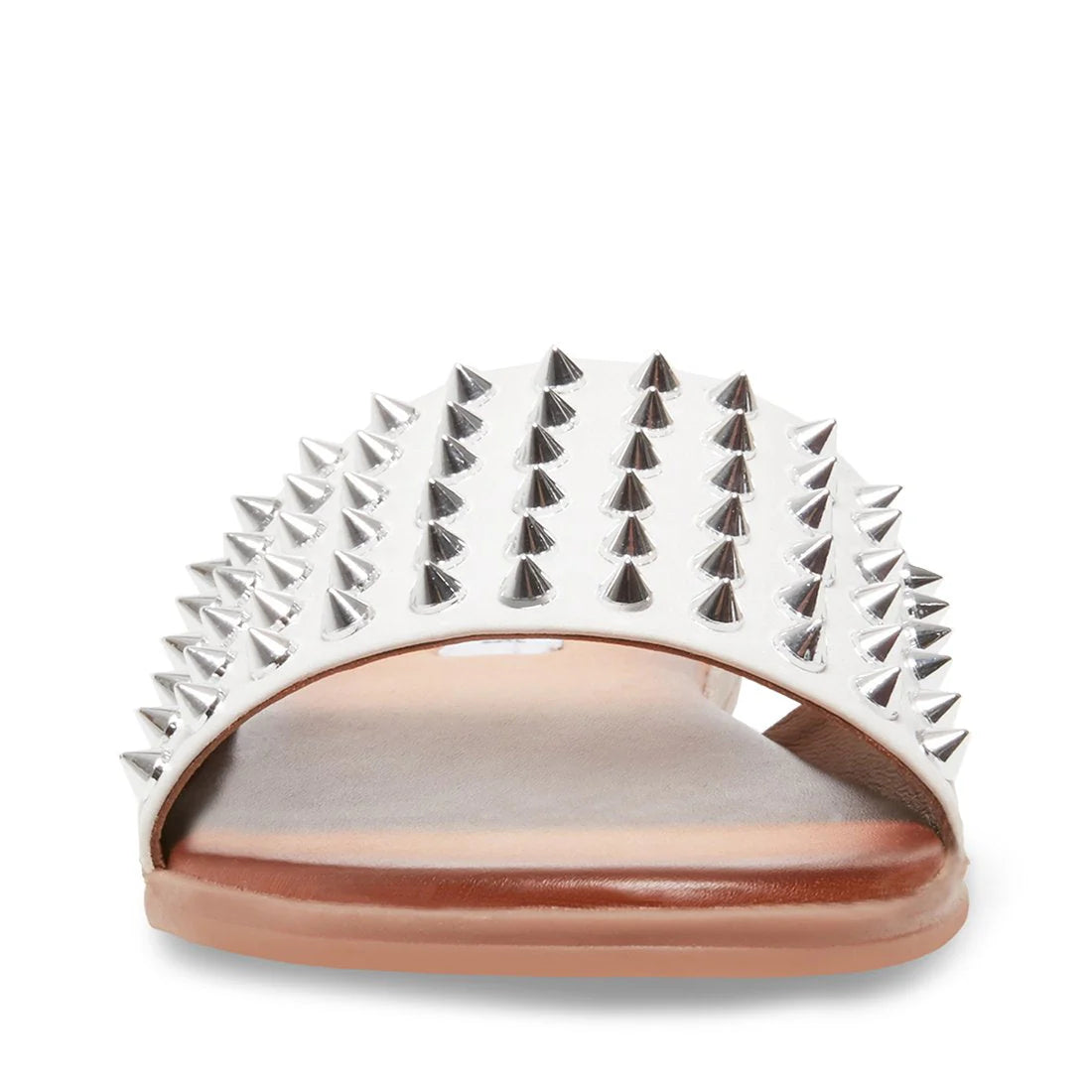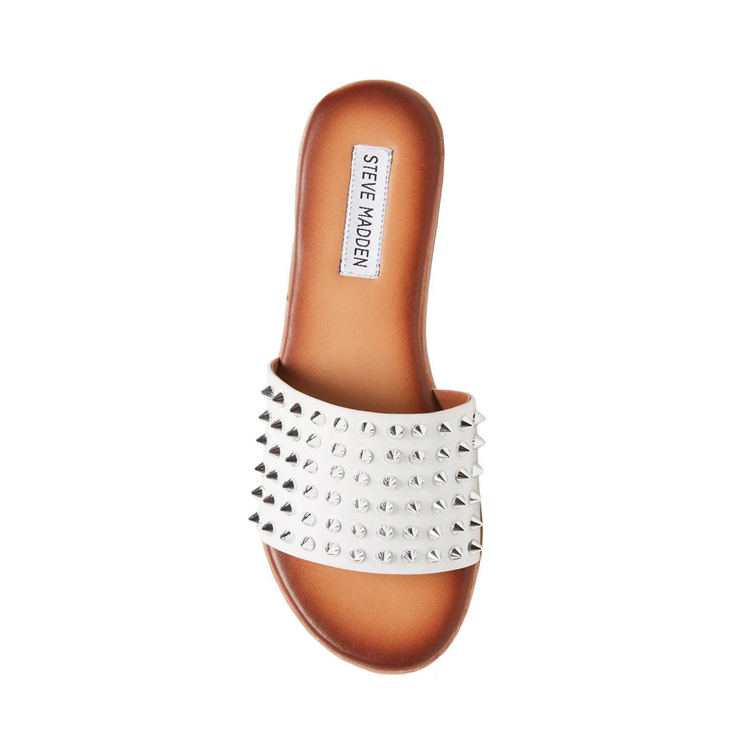Don’t mess with FARRYN! Metal spikes blanket this slide’s leather upper, adding edgy texture and chic attitude.
