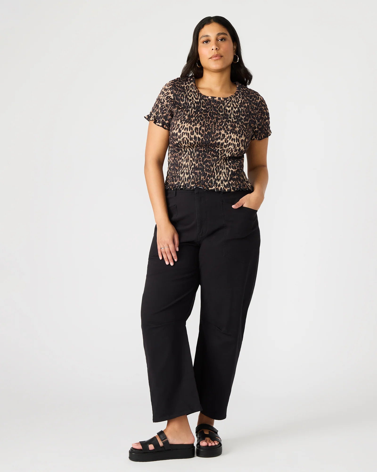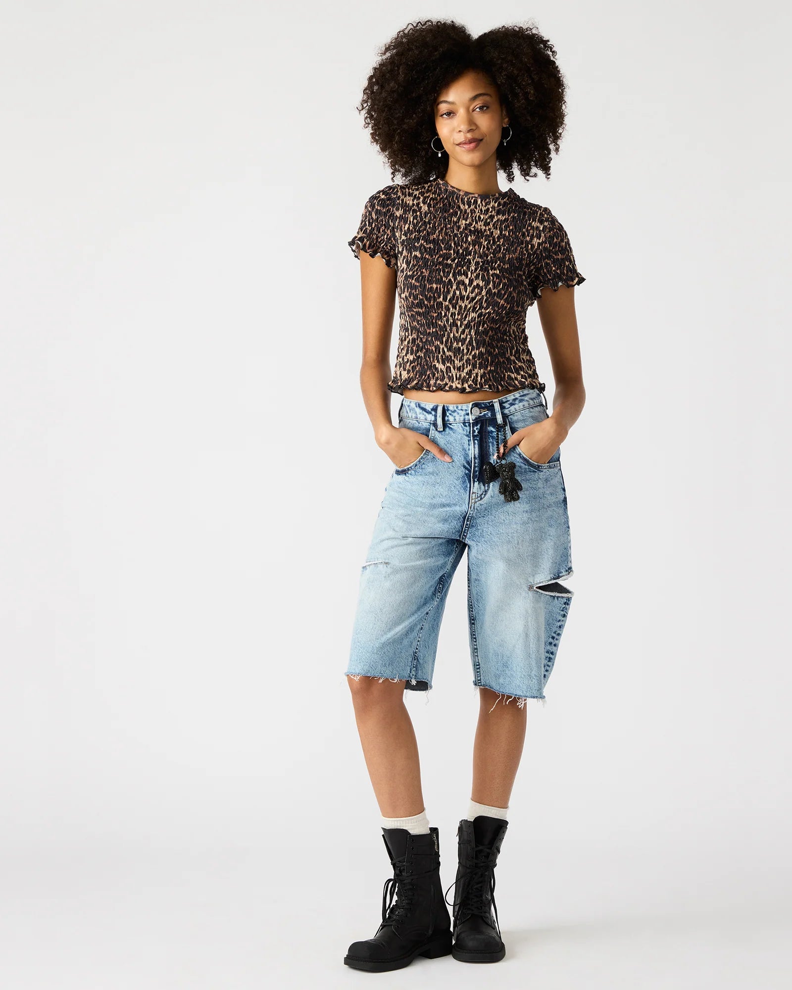 The FIA is a stylish and trendy addition to any wardrobe. Featuring a smocked design and short-sleeved cheetah print, it offers a unique and eye-catching look. The lettuce edge sleeves add a touch of playful charm. Perfect for a casual day out or a night on the town.