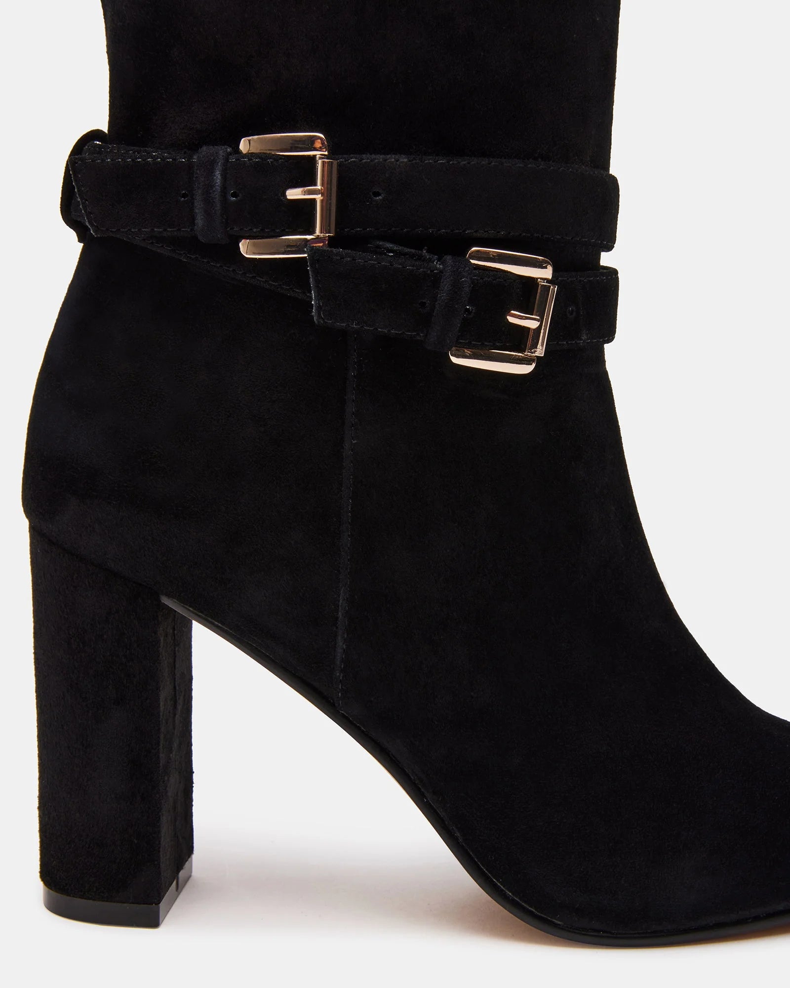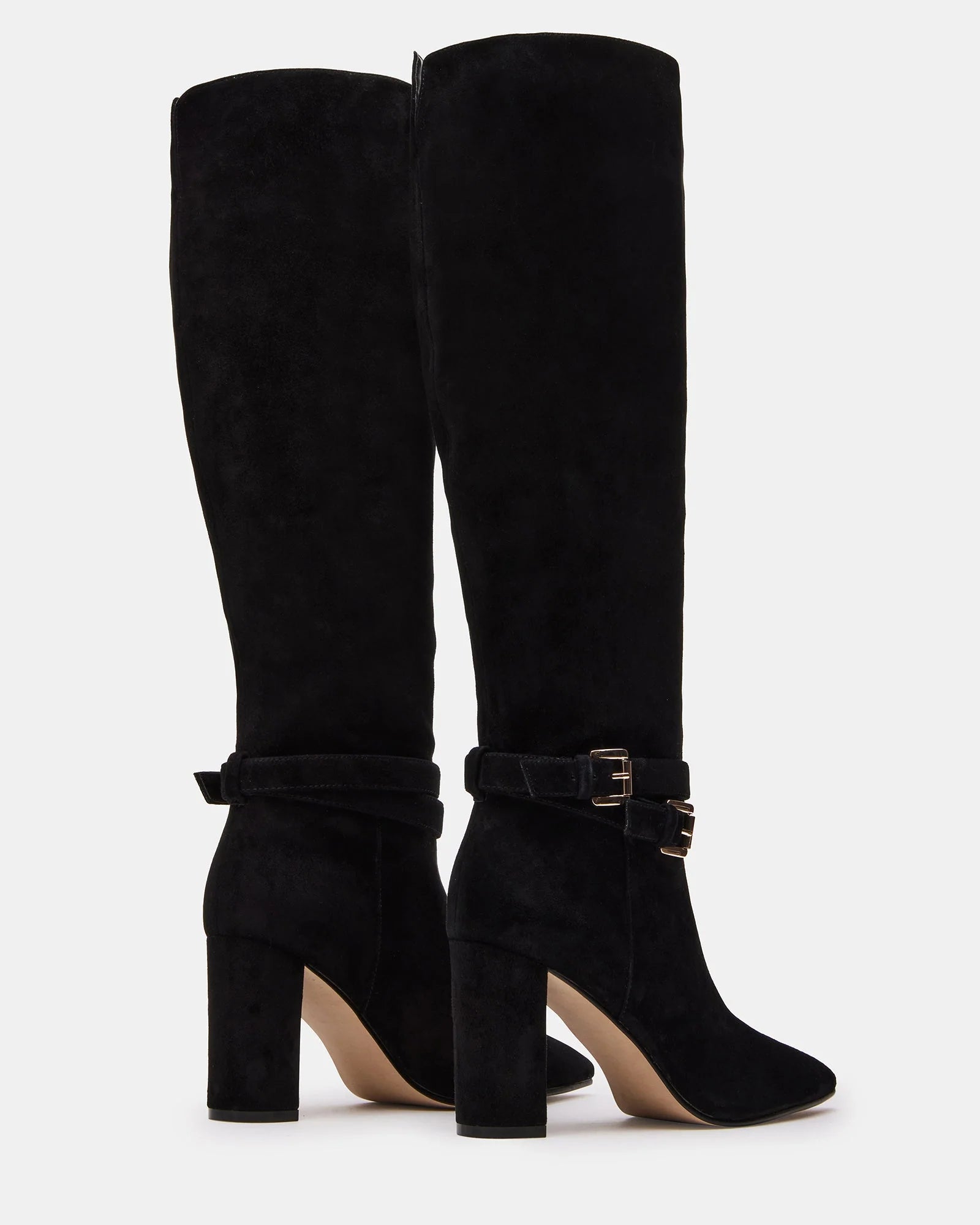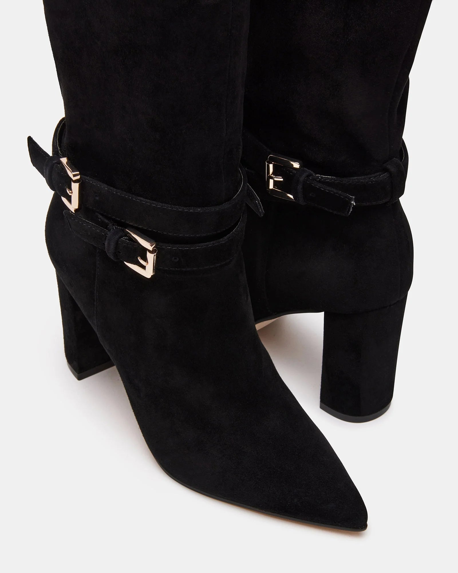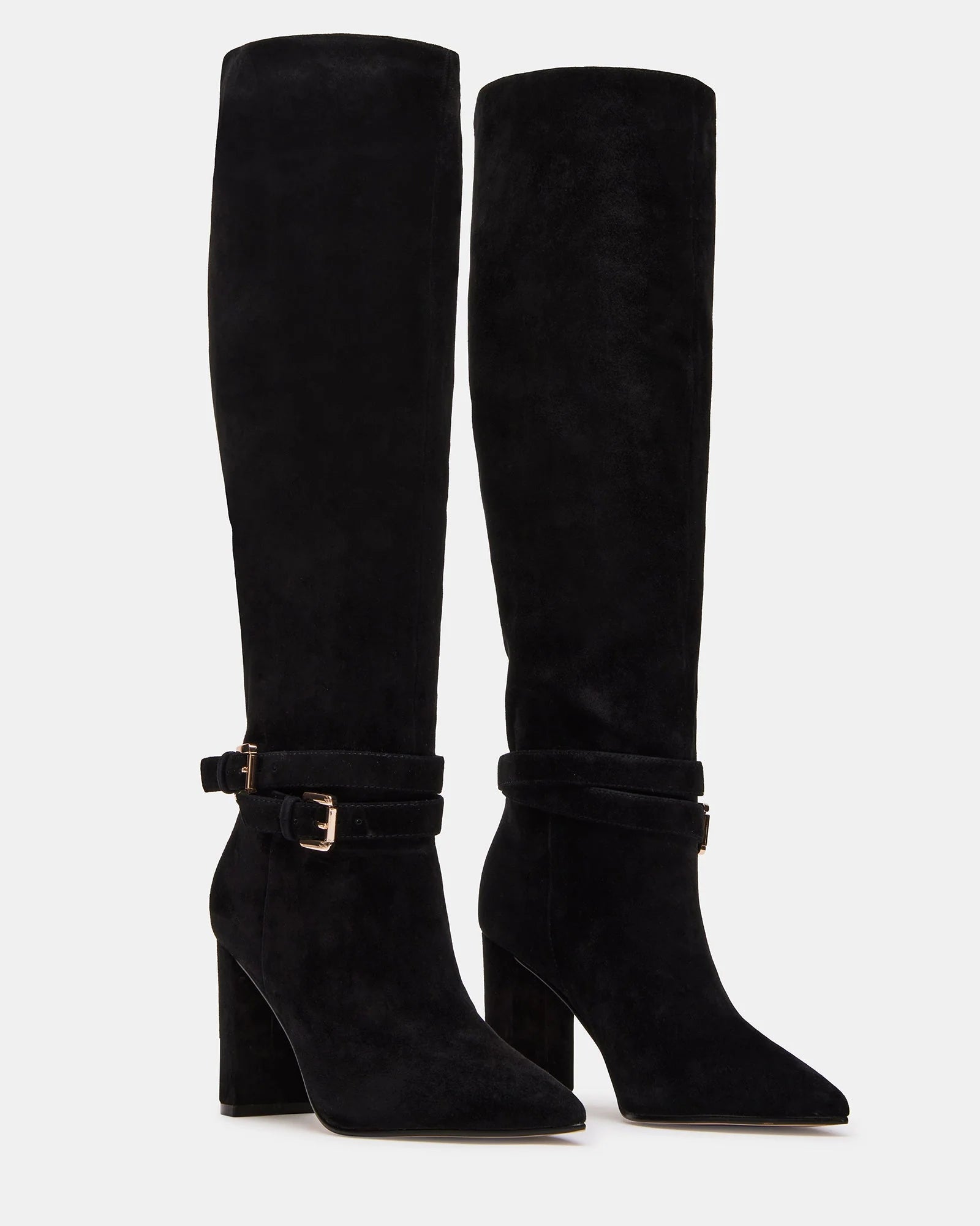 The FINCH over-the-knee is a monochrome point toe block heel design with a buckled strap wrapped around the ankle to accent this clean look.