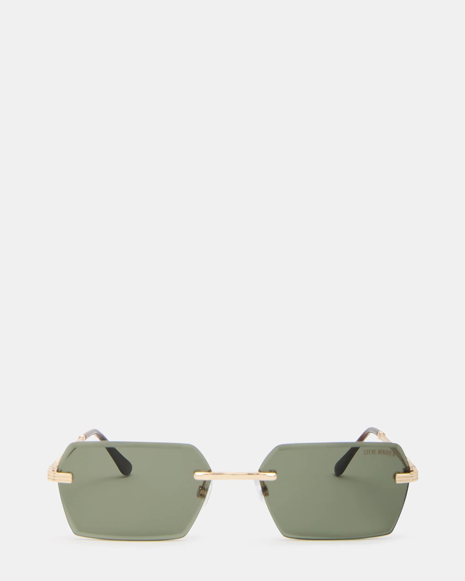 The FINNIAN sunglasses in gold provide a sleek and stylish for your sunny days. Made with shiny gold tortoise design and solid green lenses, these sunglasses are sure to protect your eyes while making a bold statement. Elevate your look with these high-quality shades.