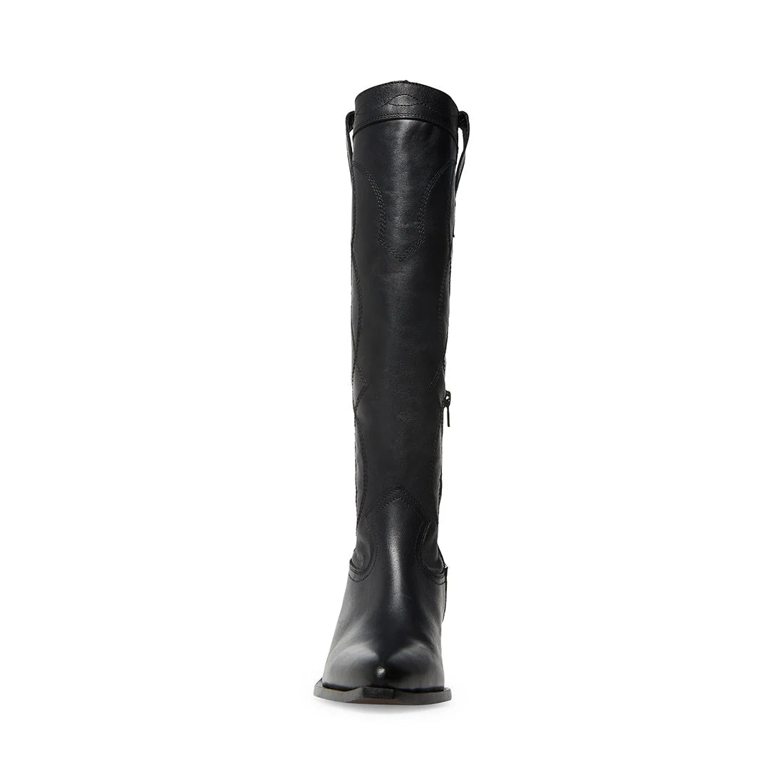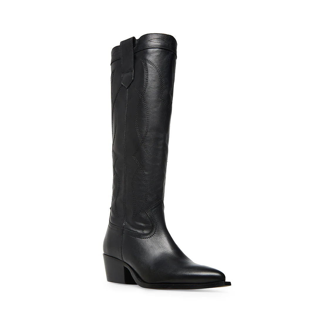 The FRAYDA take the pointed toe, stacked heel, and and decorative upper from classic boots and add the straight knee high shaft of a riding boot for a unique hybrid design.
