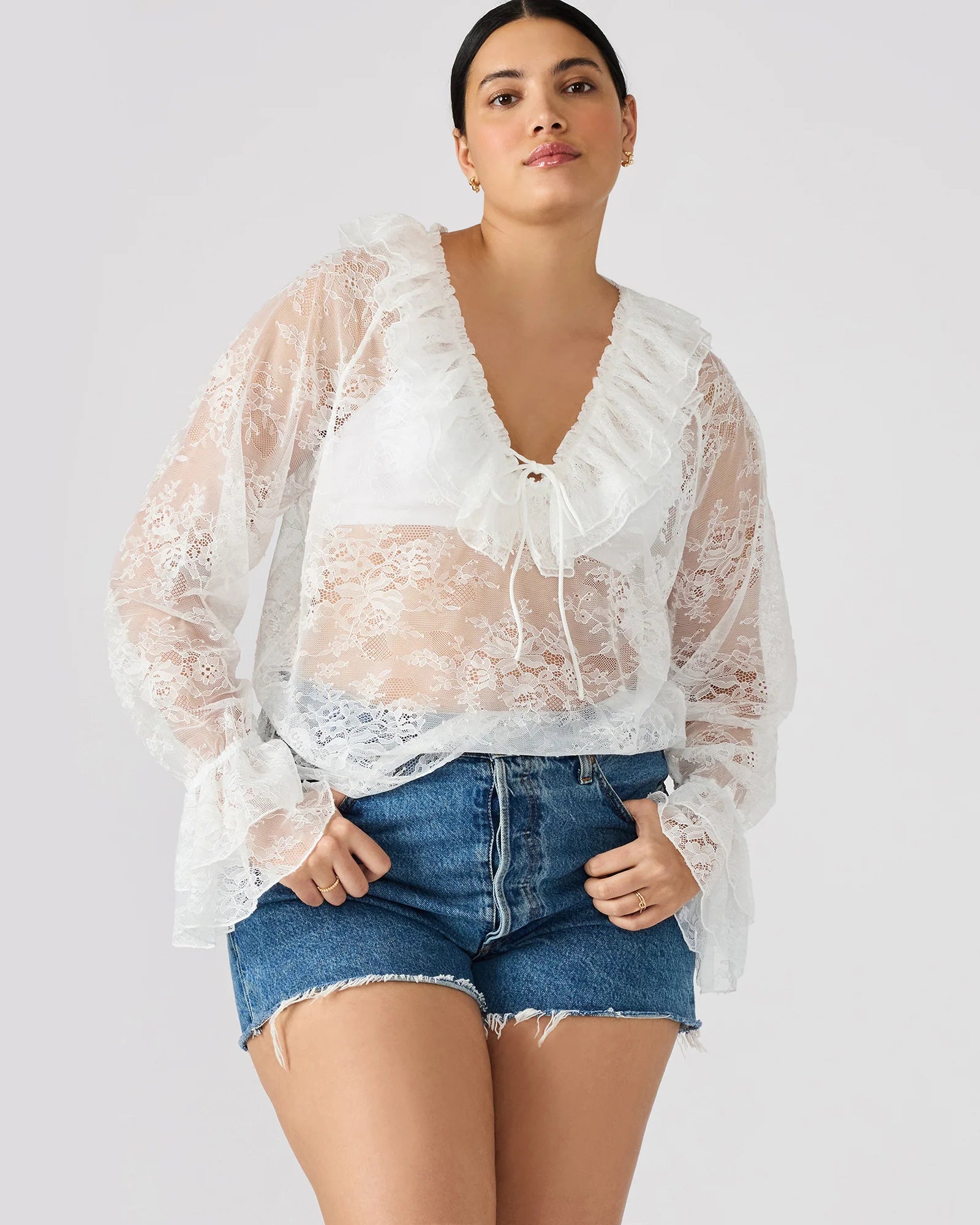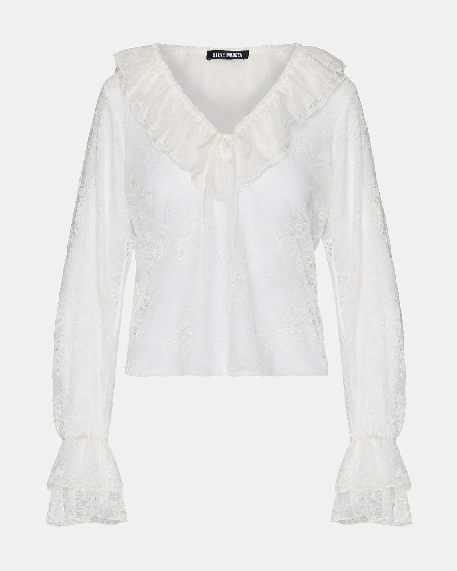 Expertly designed with intricate lace detailing, this elegant HAMPTON LACE blouse is the perfect addition to any wardrobe. With long sleeves and delicate ruffles, it combines feminine charm with timeless style. Perfect for any occasion, this top effortlessly adds a touch of sophistication to any outfit.