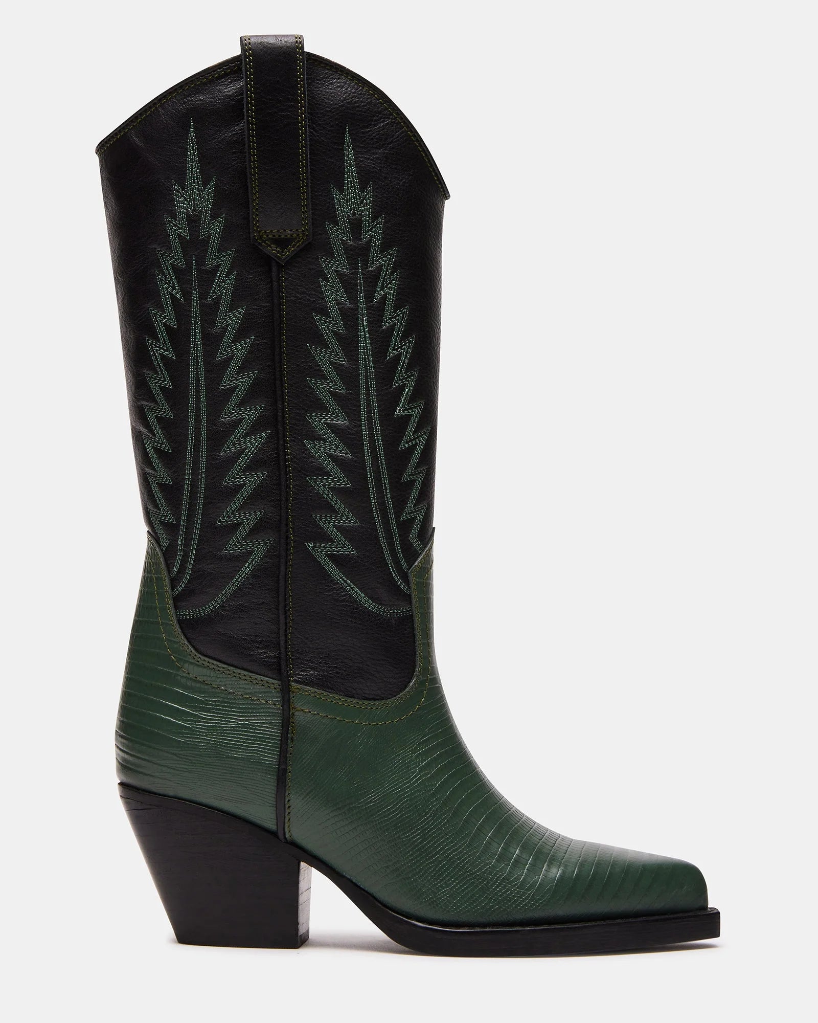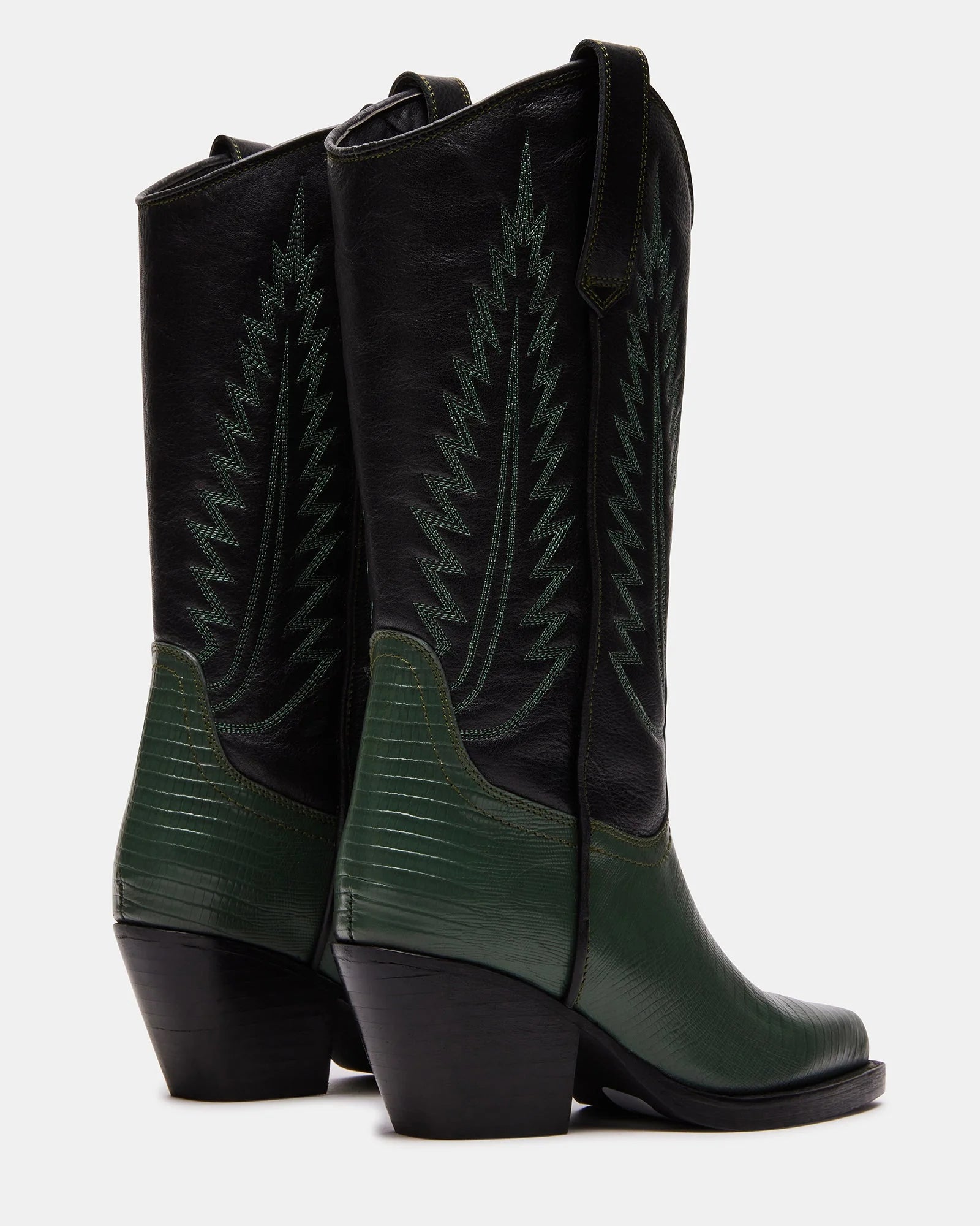 Contrasting finishes highlight the decorative panels cuts and embroidery on the HUNTIN western . A curved topline, a snipped toe, and an angled block heel give this style that familiar cowboy boot silhouette.
