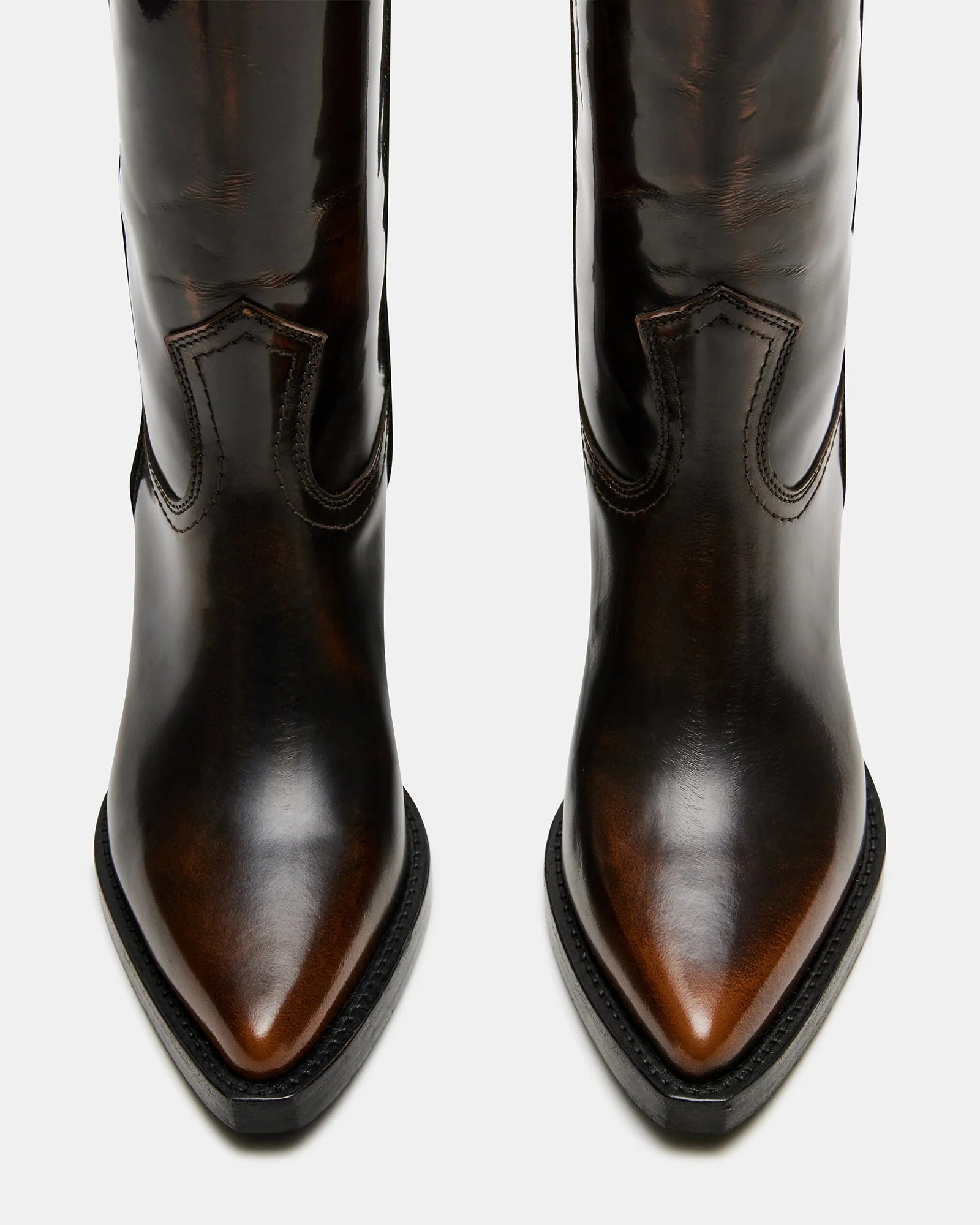 Smooth, sleek leather with minimal distressed detail makes HUXLEY your go-to western . A curved topline, a snipped toe, and an angled block heel give this style that familiar cowboy boot silhouette.