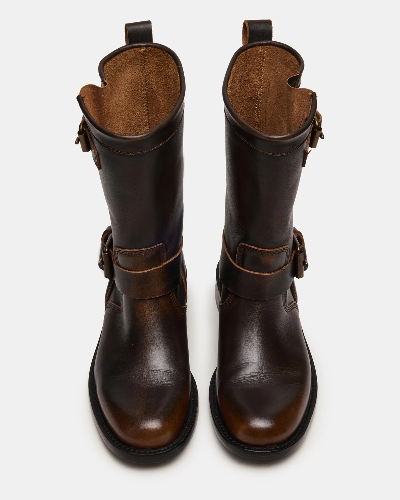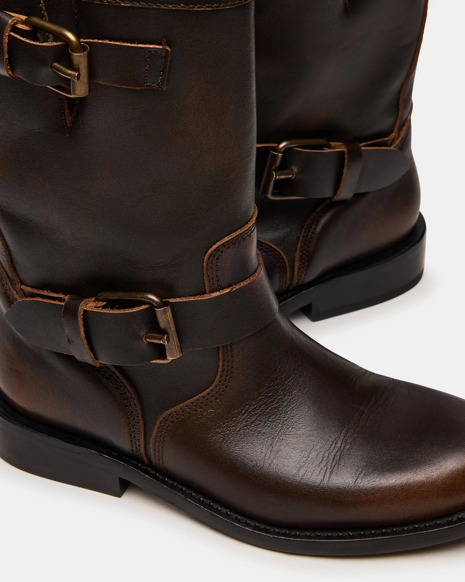 The IRVING BLACK DISTRESSED channels authentic moto aesthetics with strategic buckle accents and a refined round-toe construction. This distressed style delivers rugged character while maintaining polished sophistication. A statement boot that balances edge with versatility.