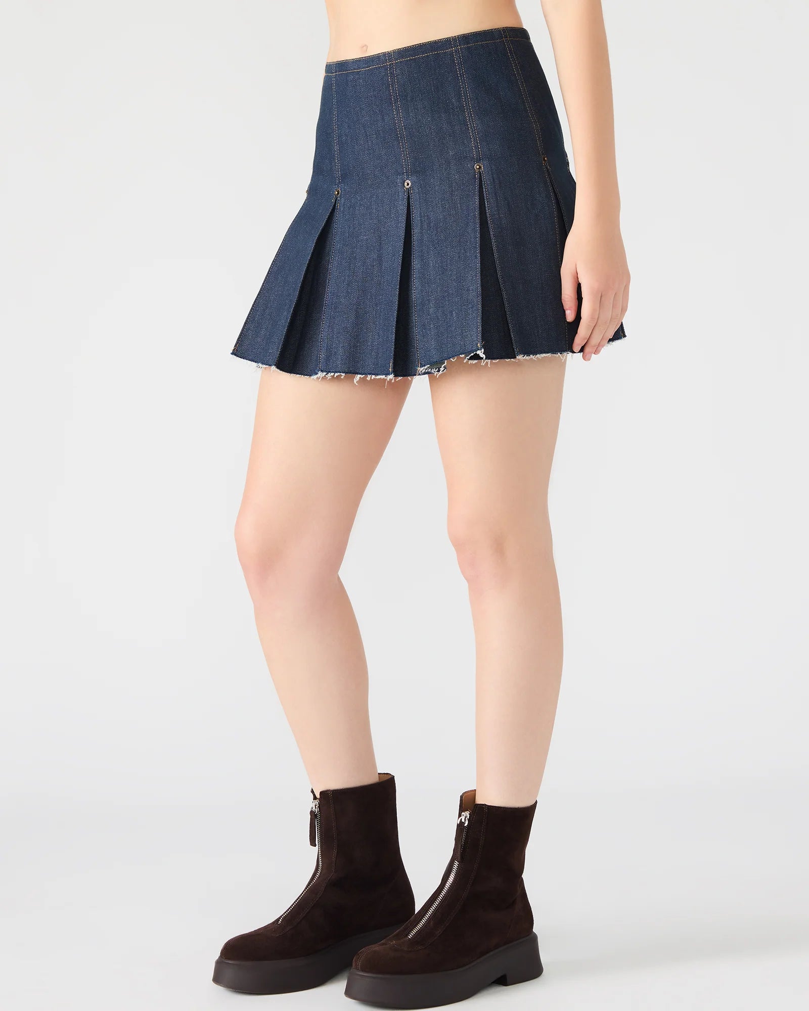 The JOAN features a pleated denim design that combines classic texture with modern structure. Its mini length and back zipper closure ensure a flattering fit and easy wear. Crafted to complement a matching set, this skirt offers a sophisticated yet casual option for versatile styling.