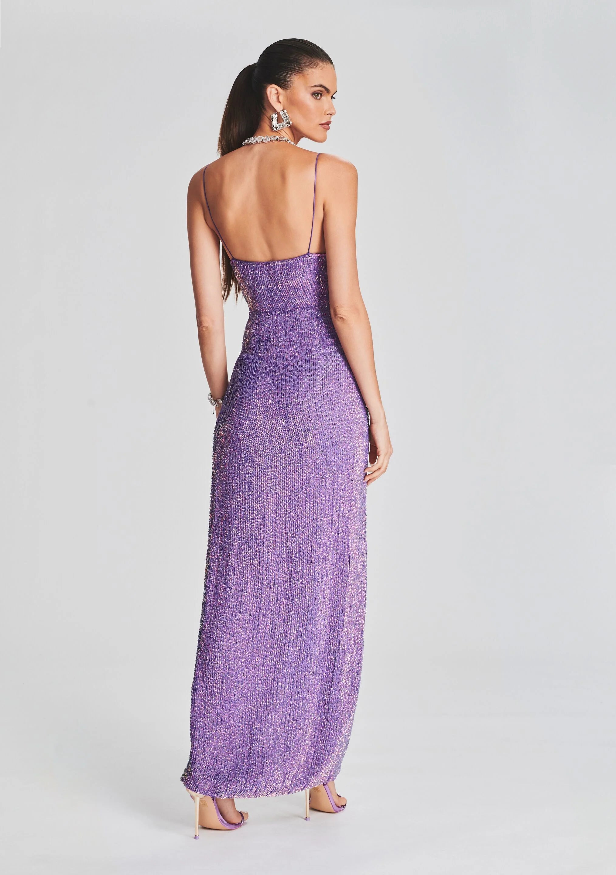 The Katya Dress embodies classic elegance. The hand-sewn sequin maxi features a cowl neck and spaghetti straps. The slimming silhouette is completed with a dramatic slit on the side. Shown here in Metallic Lavender.