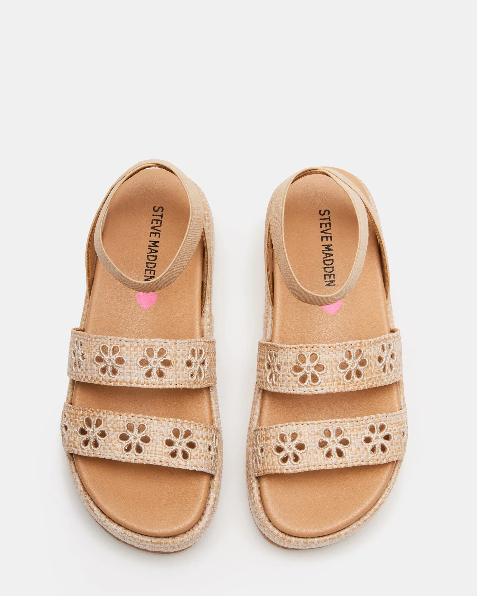 A stretch fabric strap around the ankle makes the KELSI sandal super comfortable, with floral eyelet front straps and a matching flatform sole completing the look.