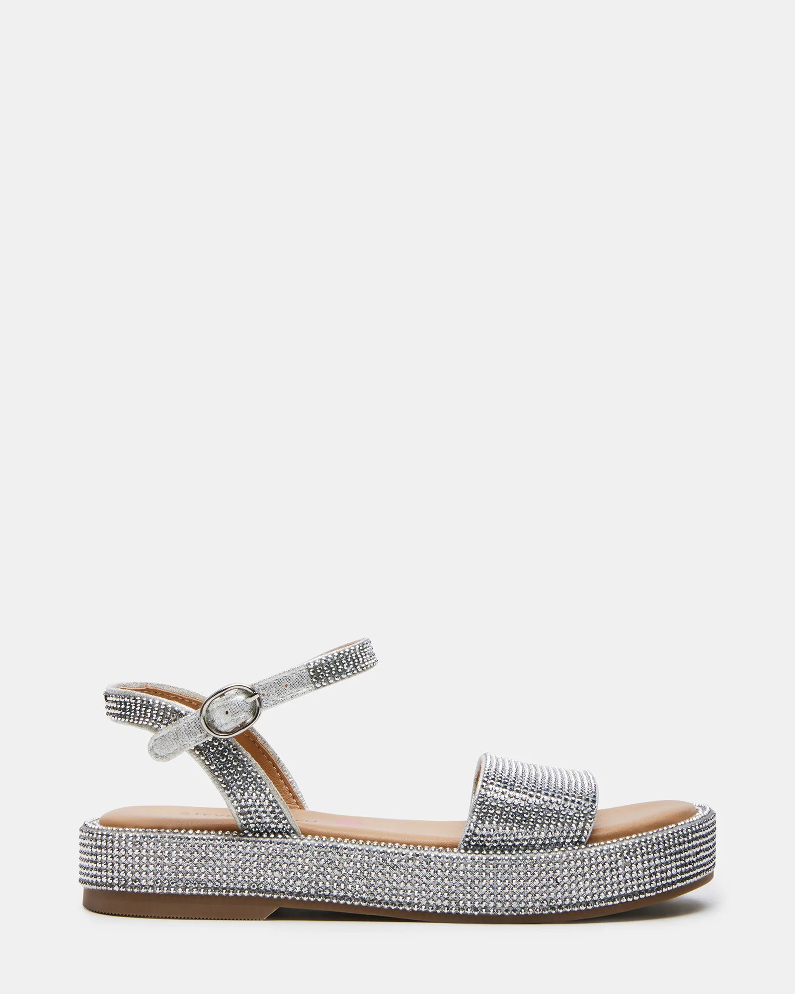 Introducing the SWEETER platform sandal! With a secure ankle strap and flatform design, this shoe offers both style and functionality. The rhinestone embellishments add a touch of glamour, making it perfect for any occasion. Give your little one the confidence and comfort they need with this trendy sandal.