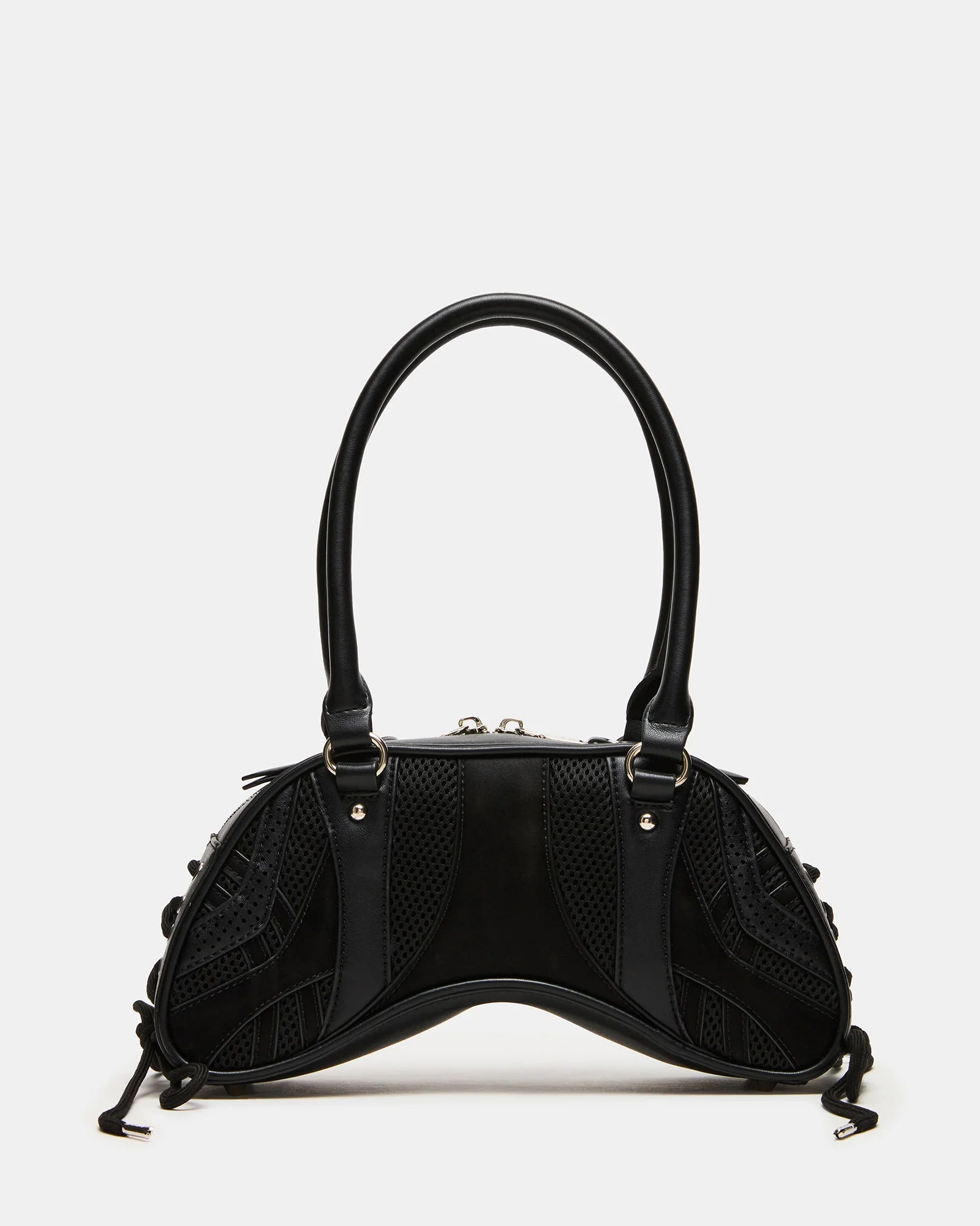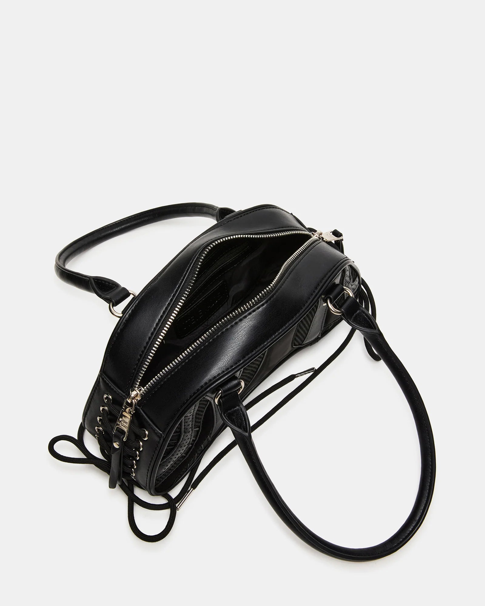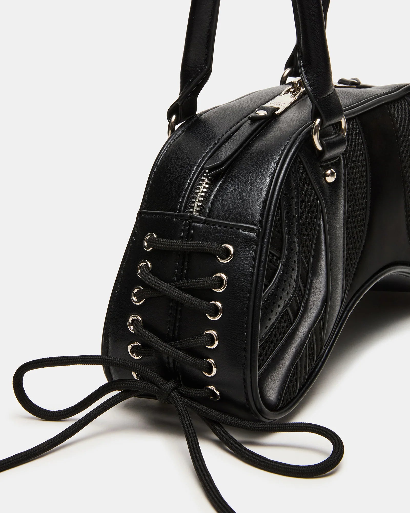 Elevate your accessory collection with the KODY BAG BLACK. This sophisticated shoulder bag features practical tubular straps and distinctive grommet lacing along the sides for structural interest. The front buckle detail adds a touch of edgy refinement, while the secure top zipper closure ensures your essentials stay protected. Versatile enough for both day and evening wear.