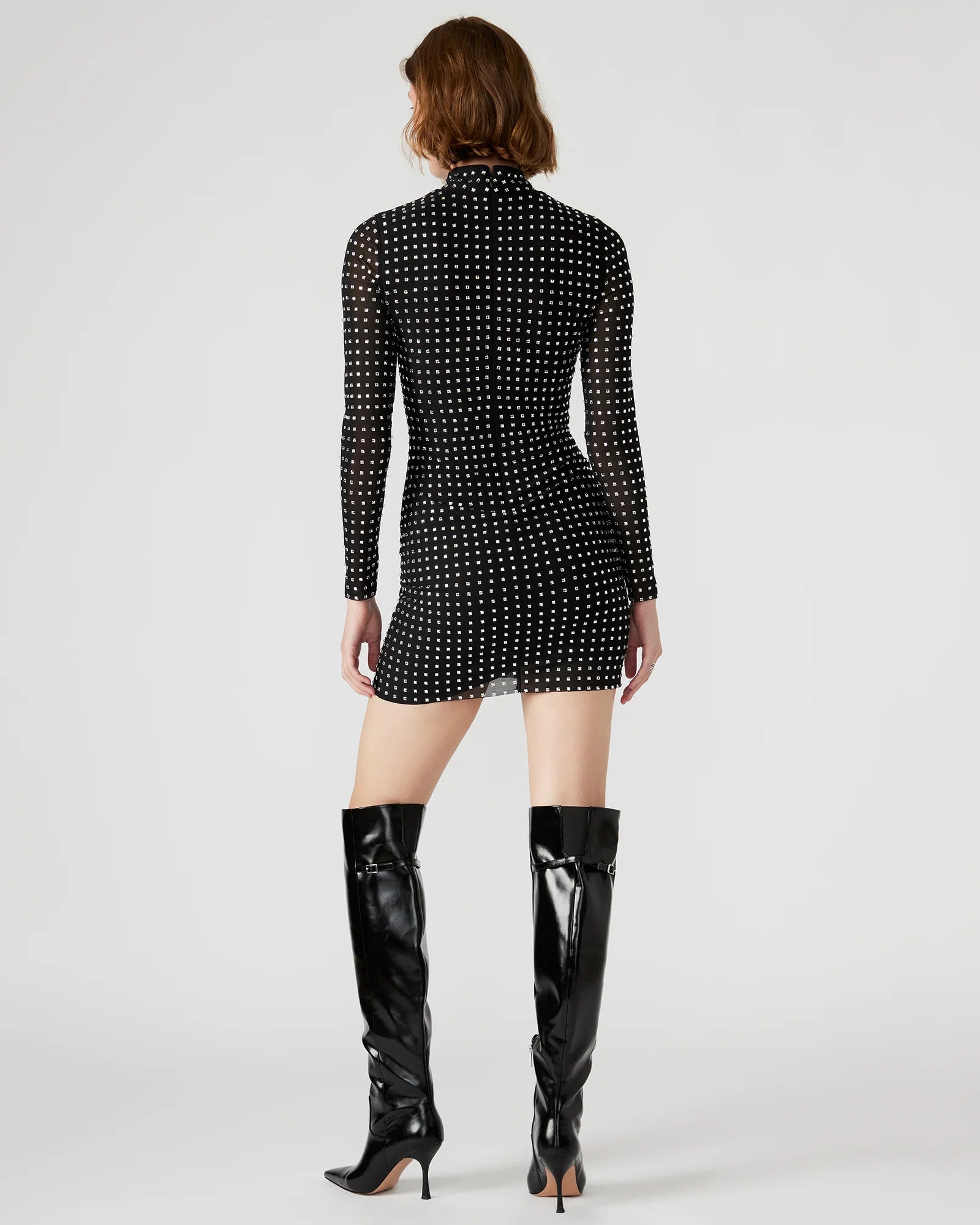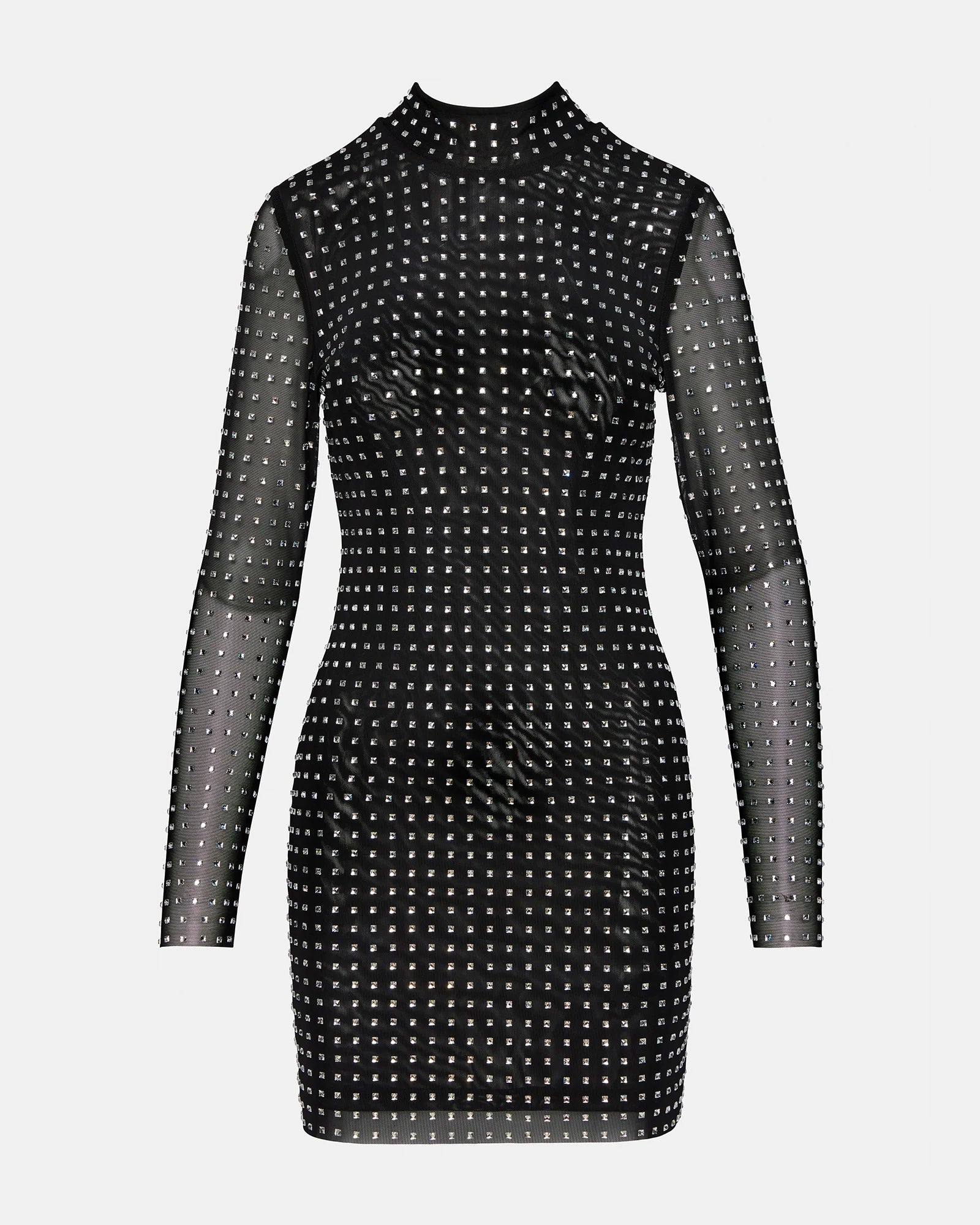 Elevate your style with our KRISTA . This long-sleeved mini dress features a mock neck and back zipper closure. This stunning dress also features unique square-shaped stud embellishments for a touch of glamour. Make a statement with this elegant and sophisticated piece, perfect for any occasion.