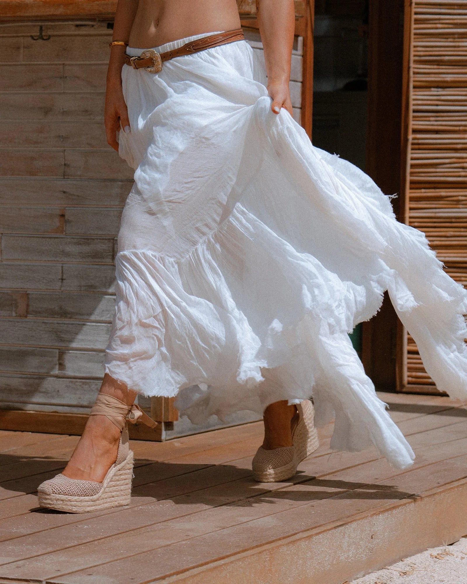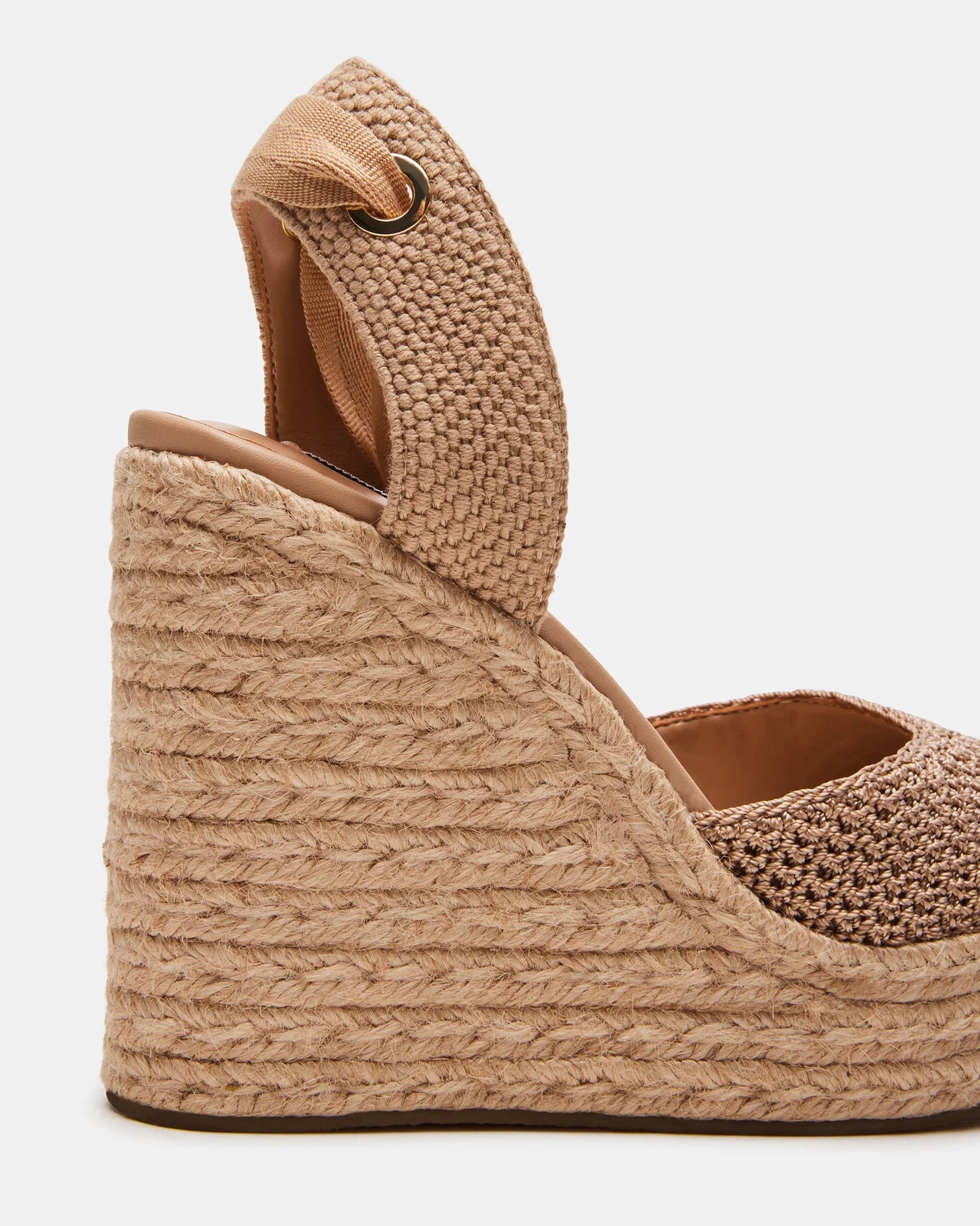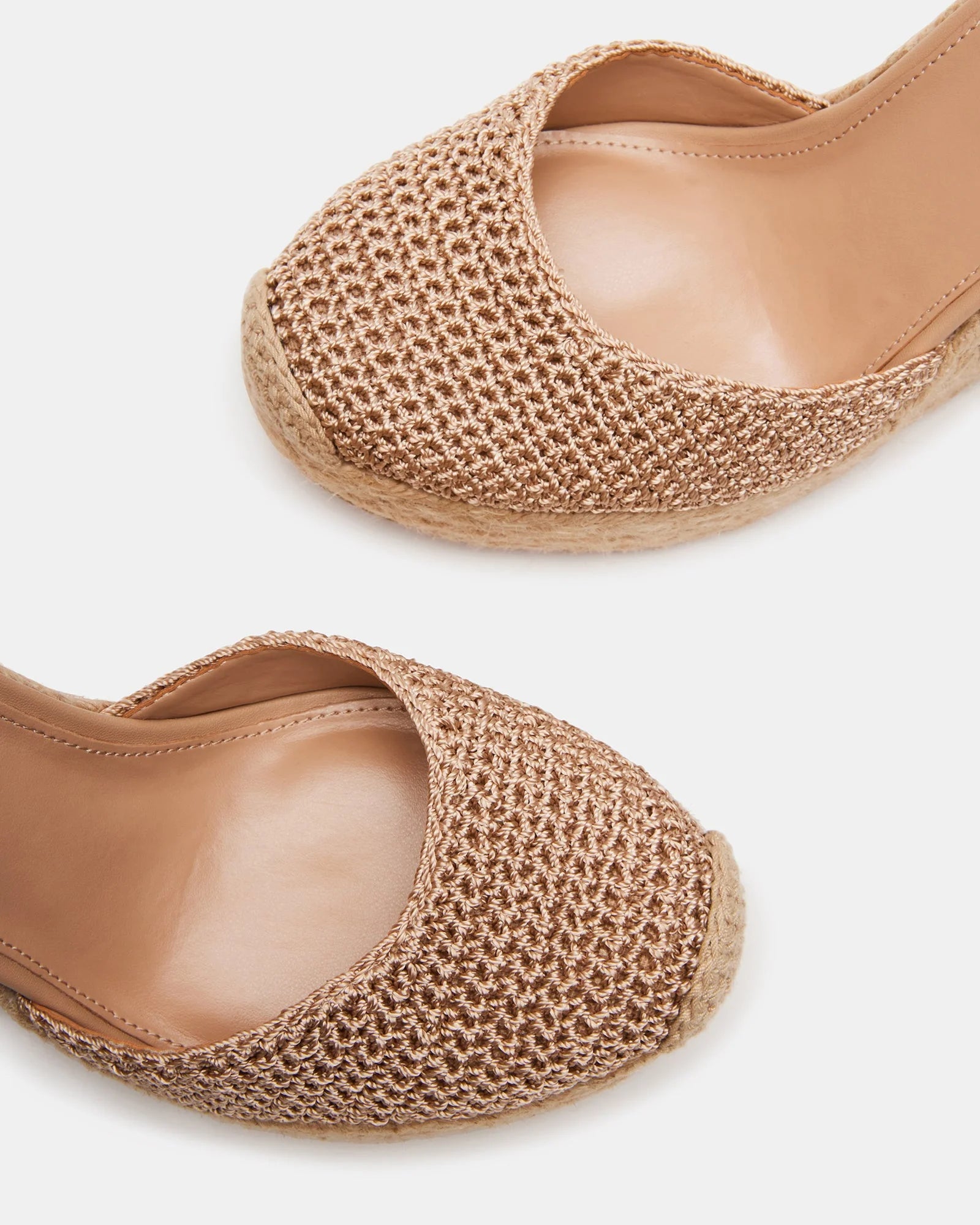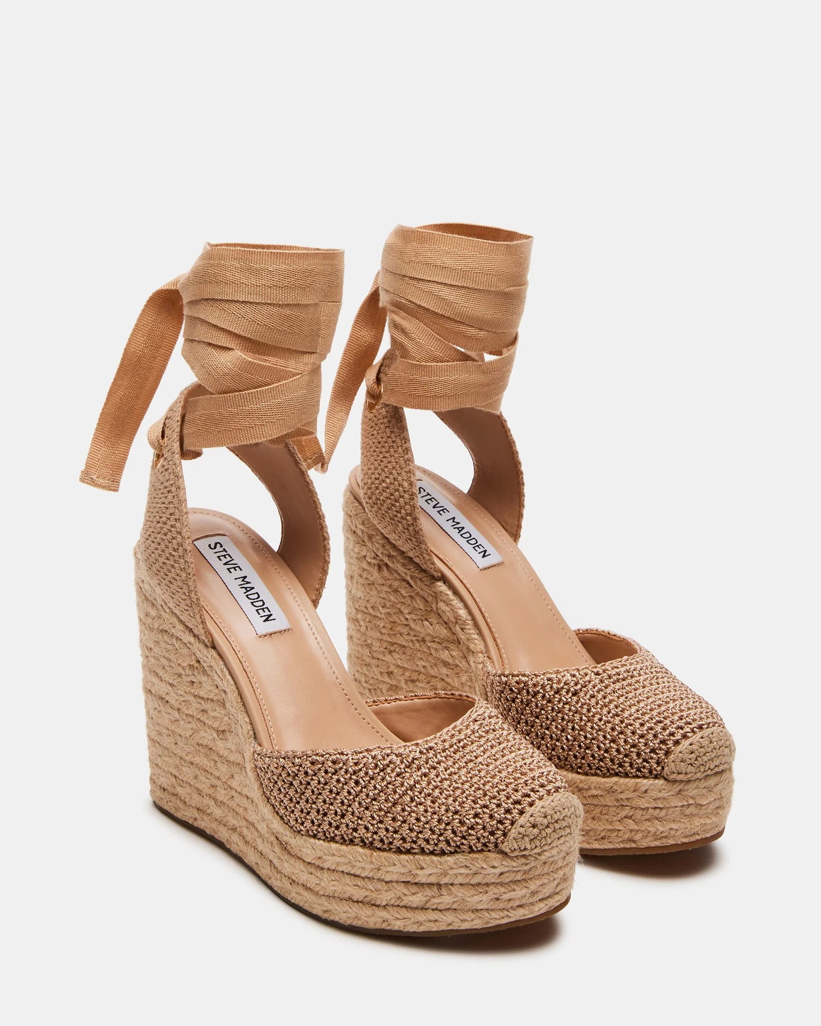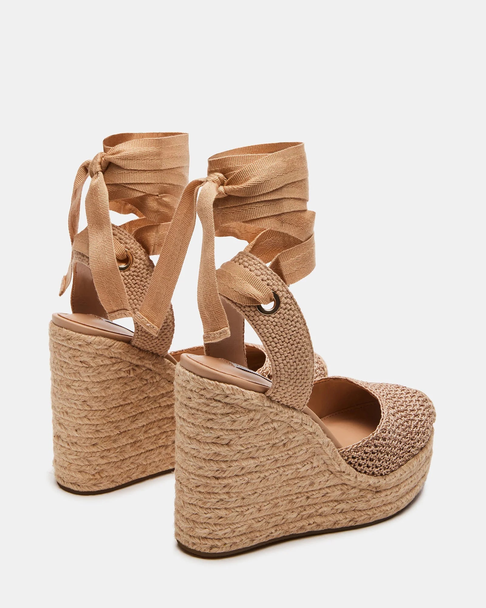 LOCKET is the quintessential ankle wrap espadrille design a closed toe and open back upper set on a sole wrapped in raffia braid.