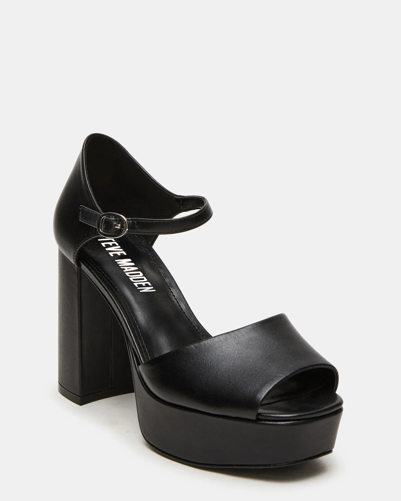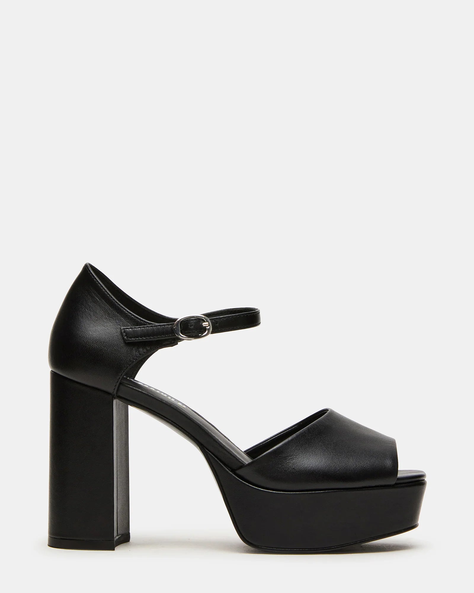 The LONDON BLACK LEATHER features a sturdy platform paired with a block heel for enhanced stability and comfort. Its secure ankle strap ensures a confident fit, making these a sophisticated choice for all-day wear. Crafted with attention to detail, they combine style and practicality seamlessly.