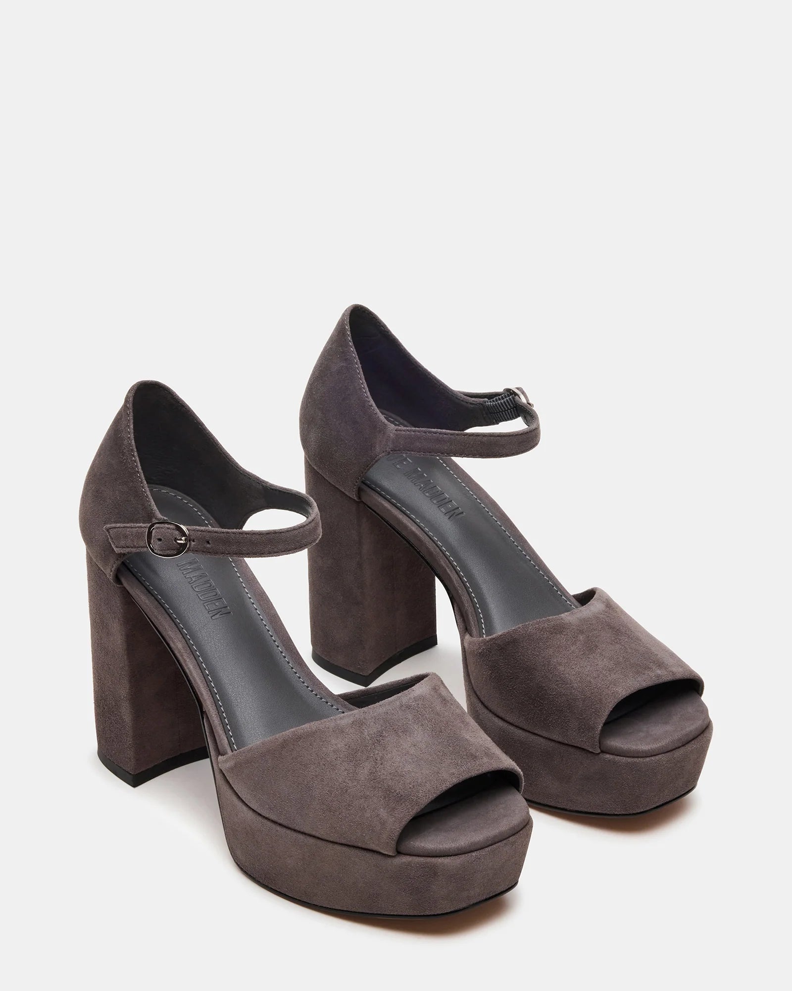 The LONDON GREY SUEDE features a sturdy platform paired with a block heel for enhanced stability and comfort. Its secure ankle strap ensures a confident fit, making these a sophisticated choice for all-day wear. Crafted with attention to detail, they combine style and practicality seamlessly.
