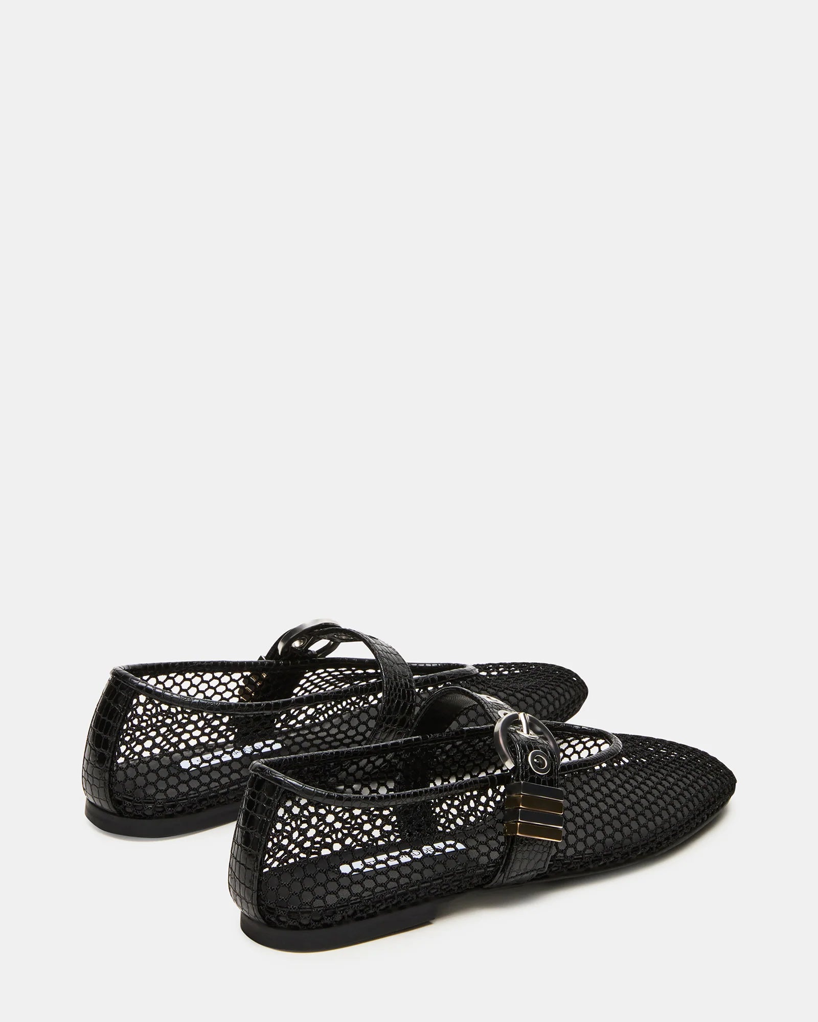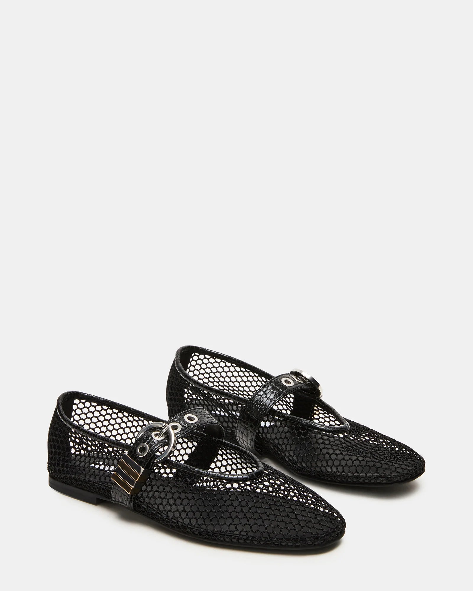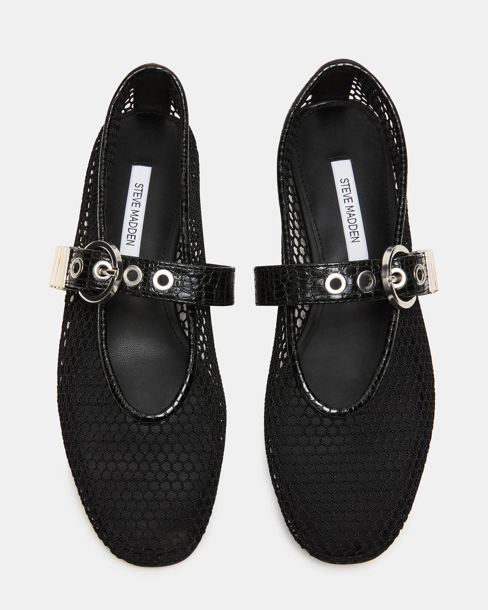 The LUCIA BLACK MESH is a refined ballet featuring breathable mesh material that ensures comfort and ventilation. Its delicate embellishments add a sophisticated touch, perfect for elevating both casual and formal outfits. Designed with an expert balance of style and practicality, this flat offers secure fit and graceful silhouette for everyday elegance.