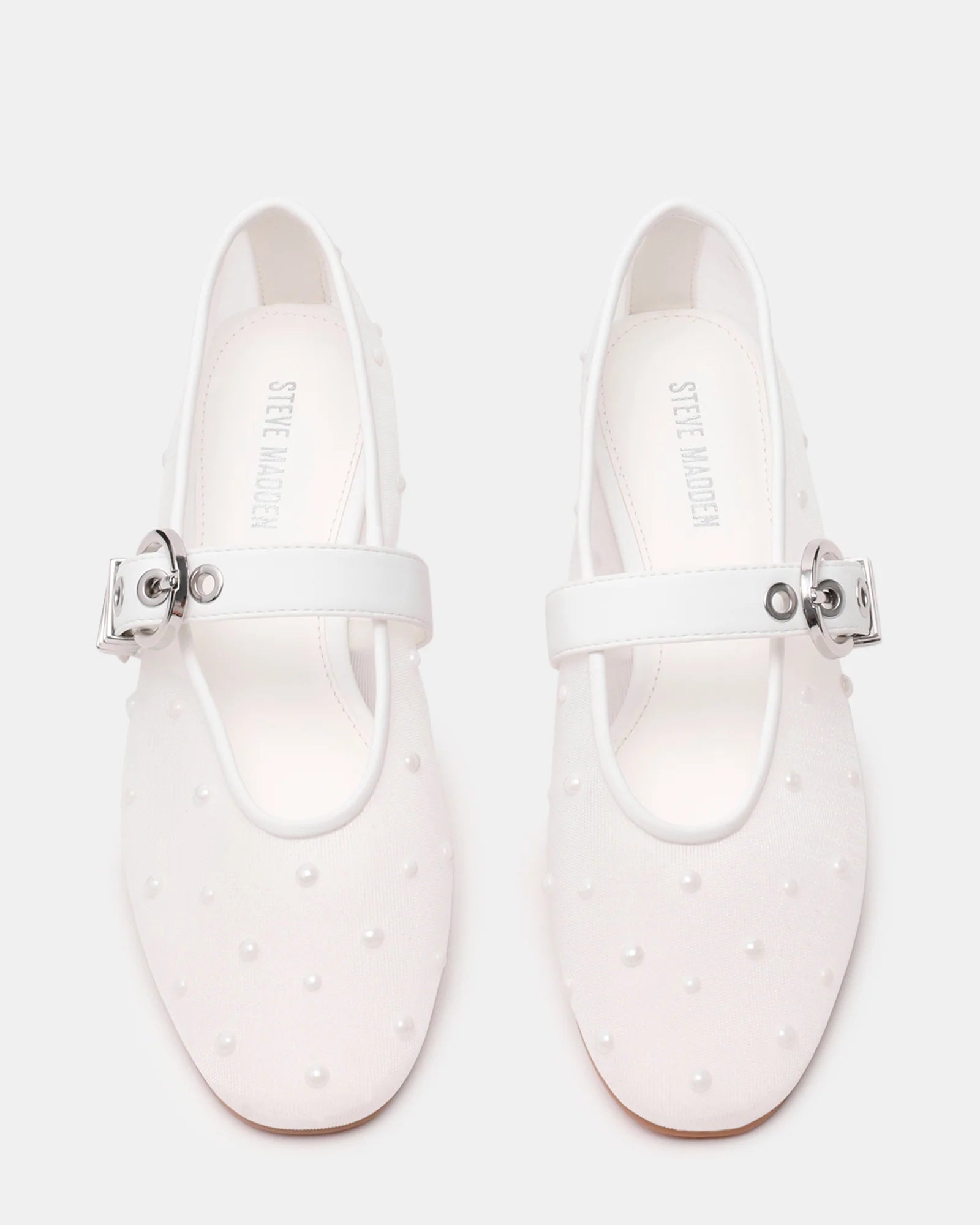 The LUCIA PEARL is a refined ballet featuring breathable mesh material that ensures comfort and ventilation. Its delicate embellishments add a sophisticated touch, perfect for elevating both casual and formal outfits. Designed with an expert balance of style and practicality, this flat offers secure fit and graceful silhouette for everyday elegance.