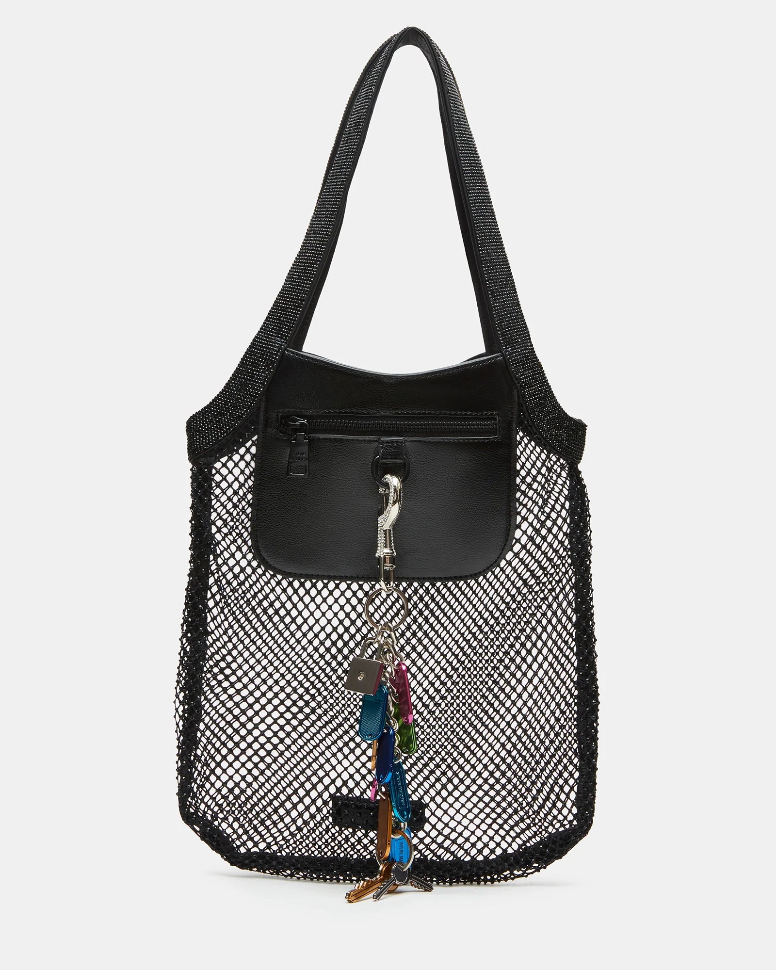 This MAKIA bag is a stylish and functional accessory for any occasion. The crystal rhinestone shoulder strap adds a touch of glamour, while the additional pocket with zipper closure provides secure storage. The curb chain bag charm with a padlock charm and textured key tag charms gives the bag a unique and trendy look. Stay organized and chic with this must-have net bag.