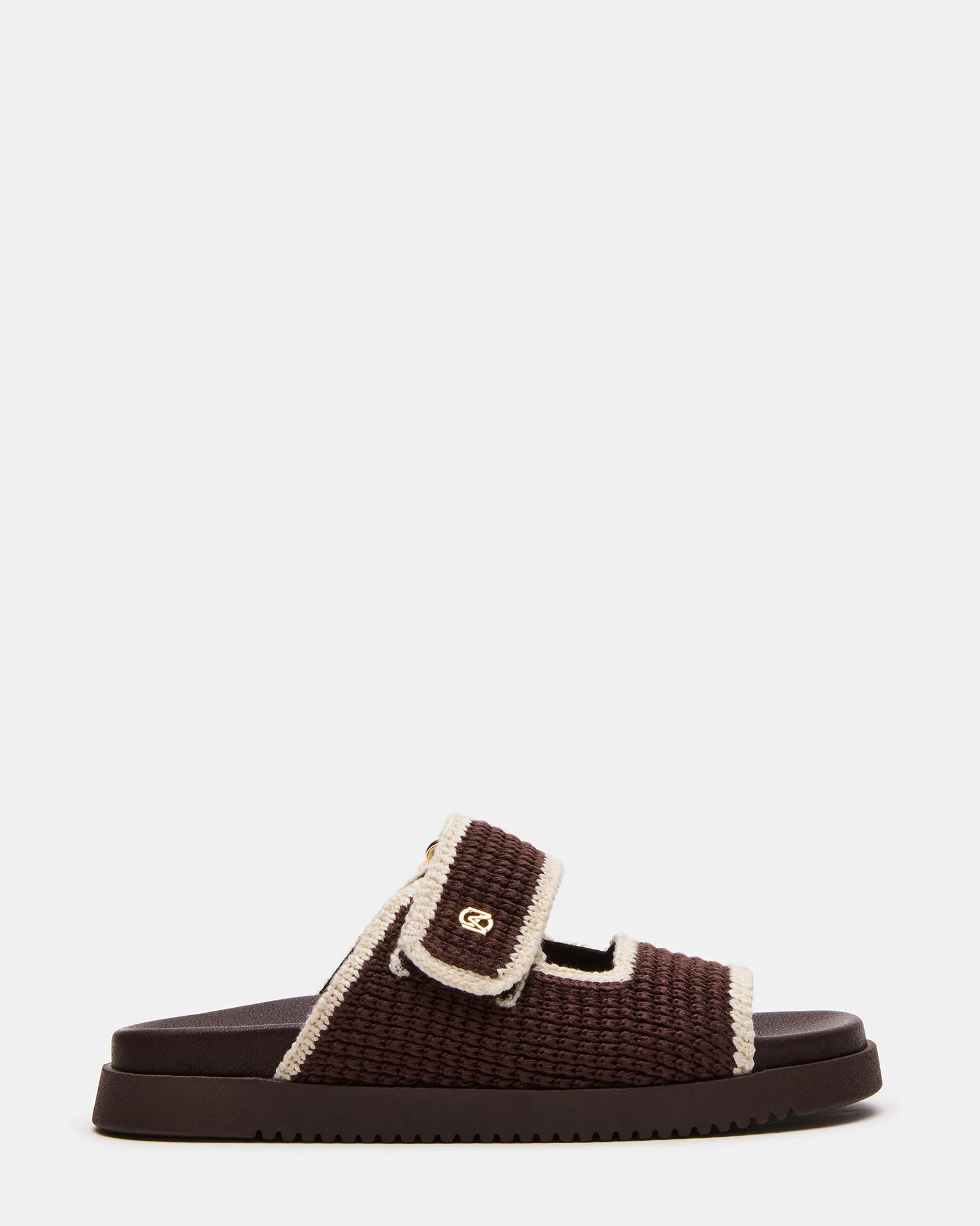 The MAYSIE BROWN MULTI features a stylish woven design on a flatform footbed, offering both elevated style and support. Its trendy yet practical flatform sole provides steady balance, while the molded footbed ensures cushioning for all-day wear. Ideal for those seeking a blend of fashion and comfort in a versatile sandal.
